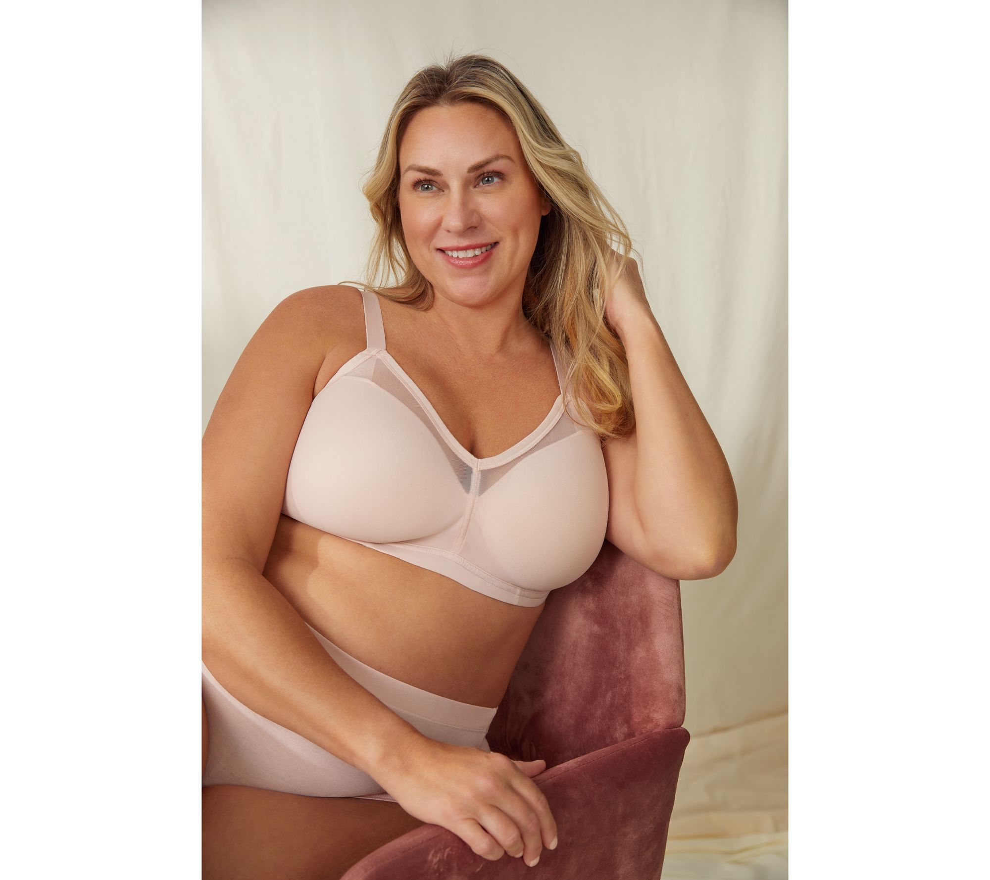 Features: wireless design, lightly lined, mesh cup overlay, adjustable back straps, two-ply back wings, four-row hook-and-eye closure
