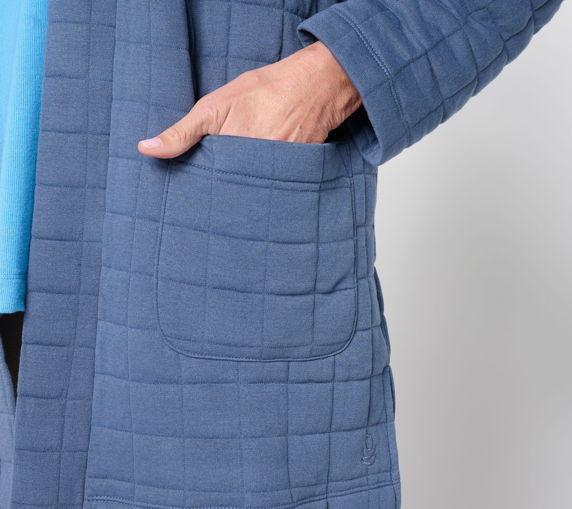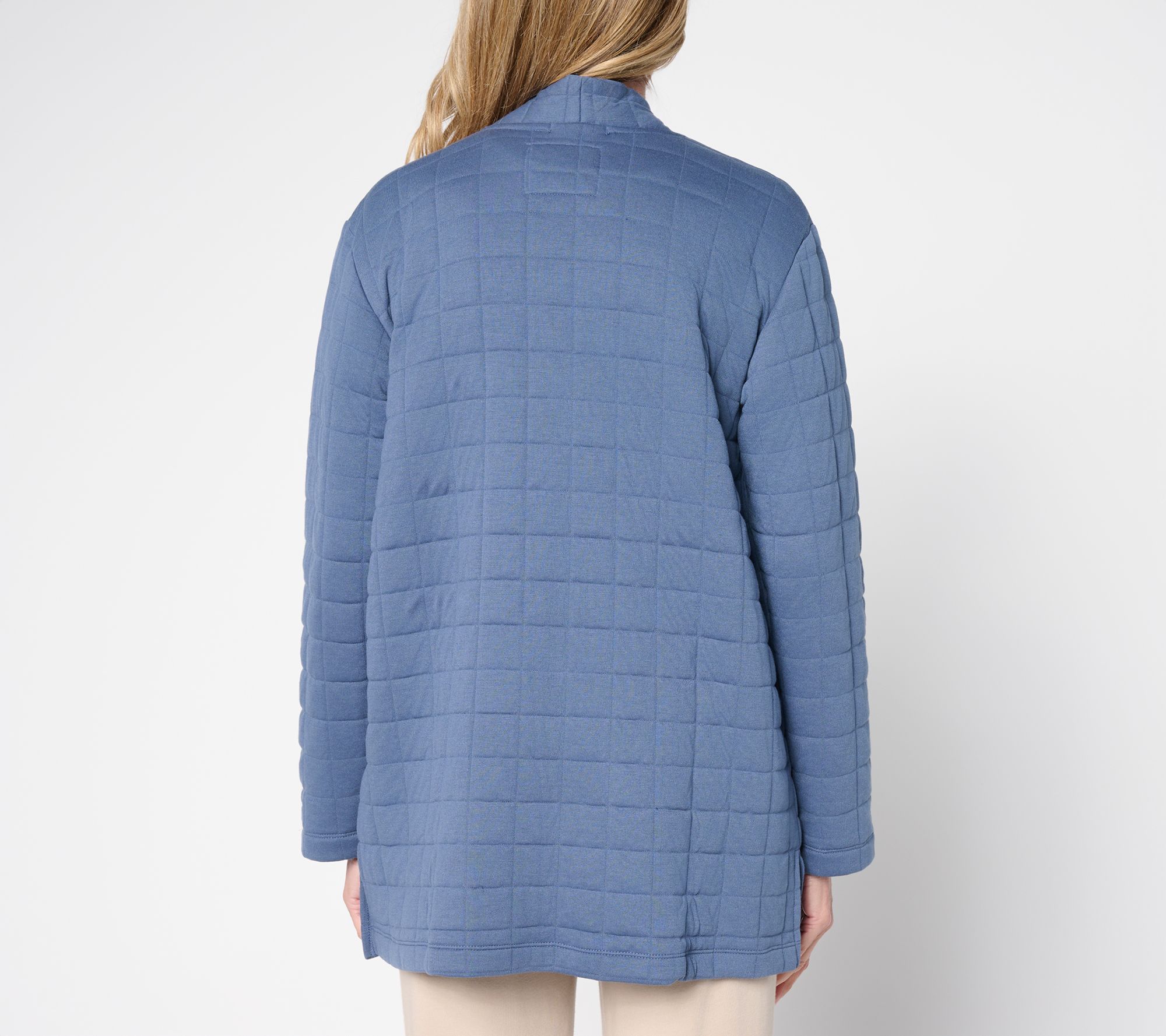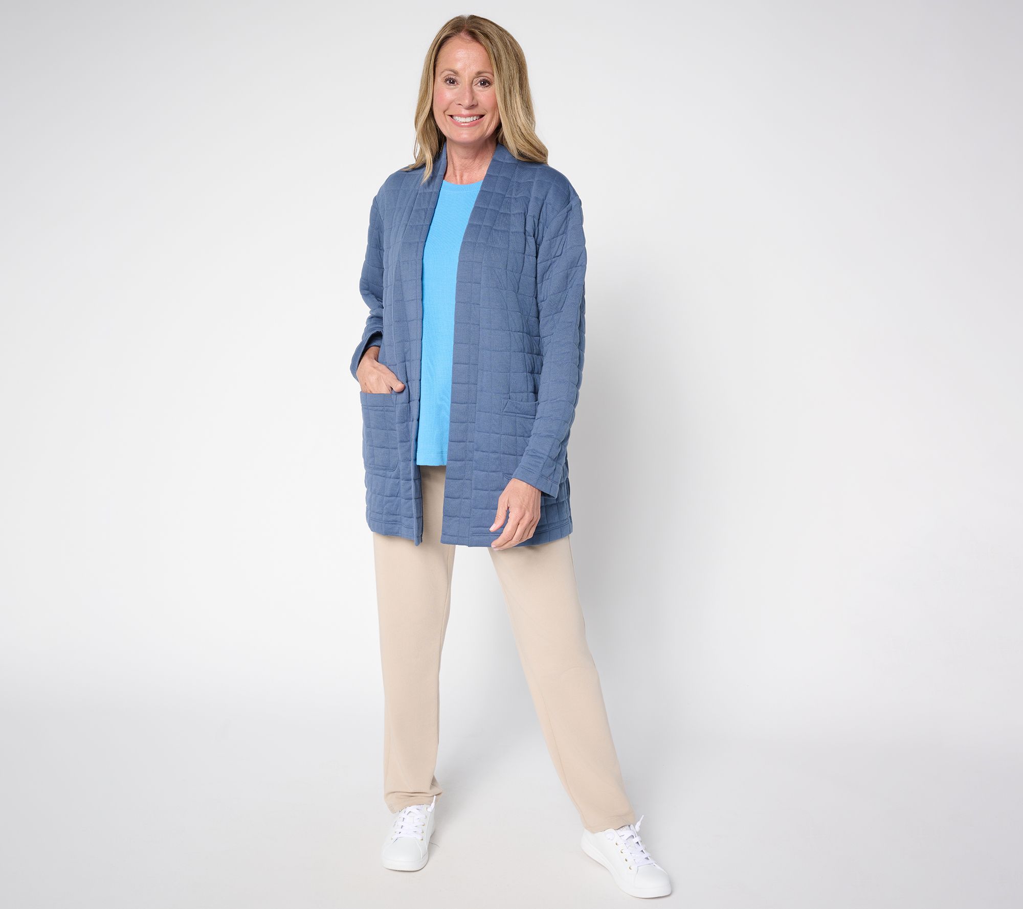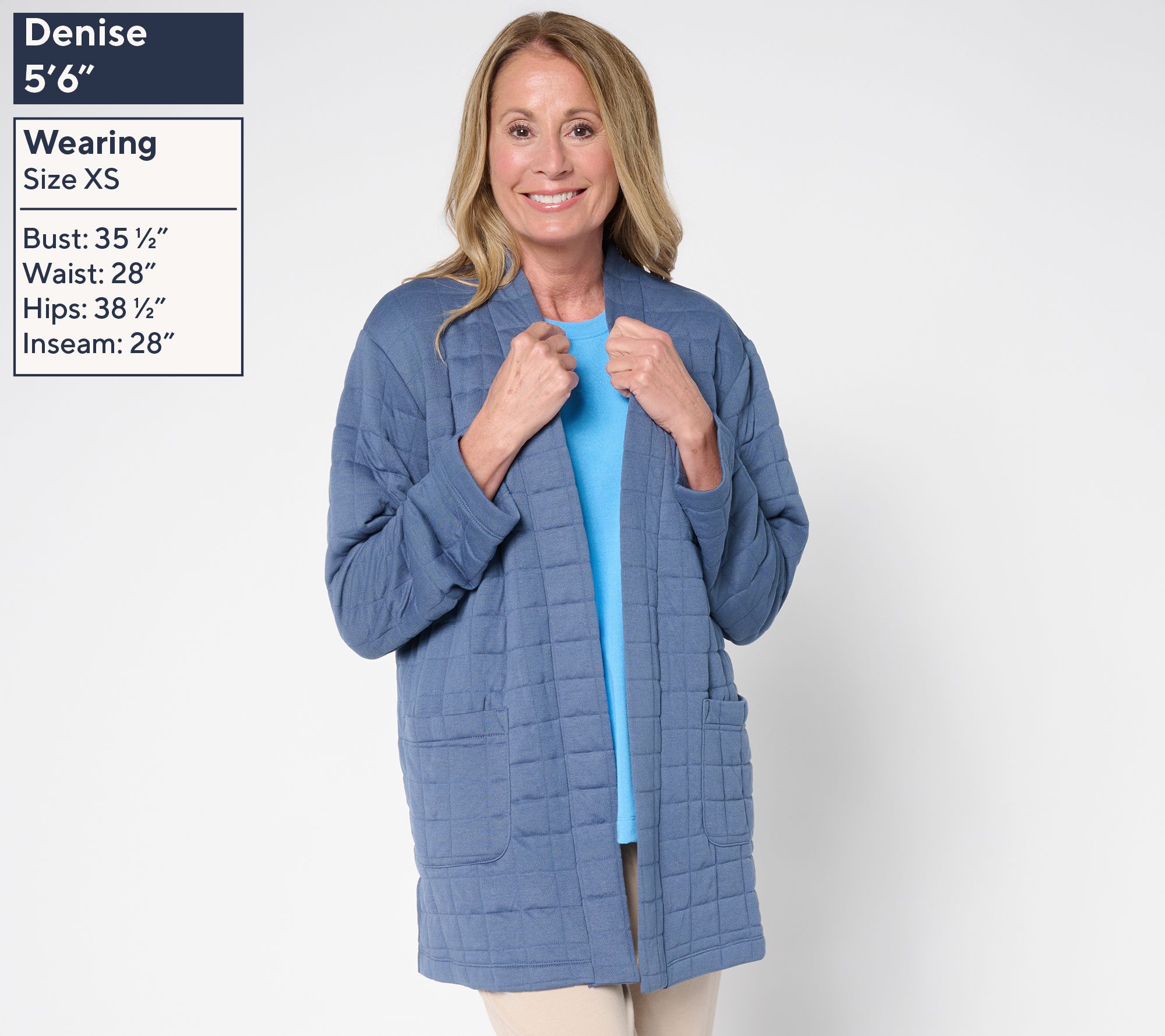 Venture out to the farmer's market or catch up over coffee draped in the effortless comfort of this quilted jacquard topper. Soft knit construction, long sleeves, and body-skimming seams keep you both cozy and stylish, while patch pockets and easy side slits offer functional flair for daily outings. From Cuddl Duds.