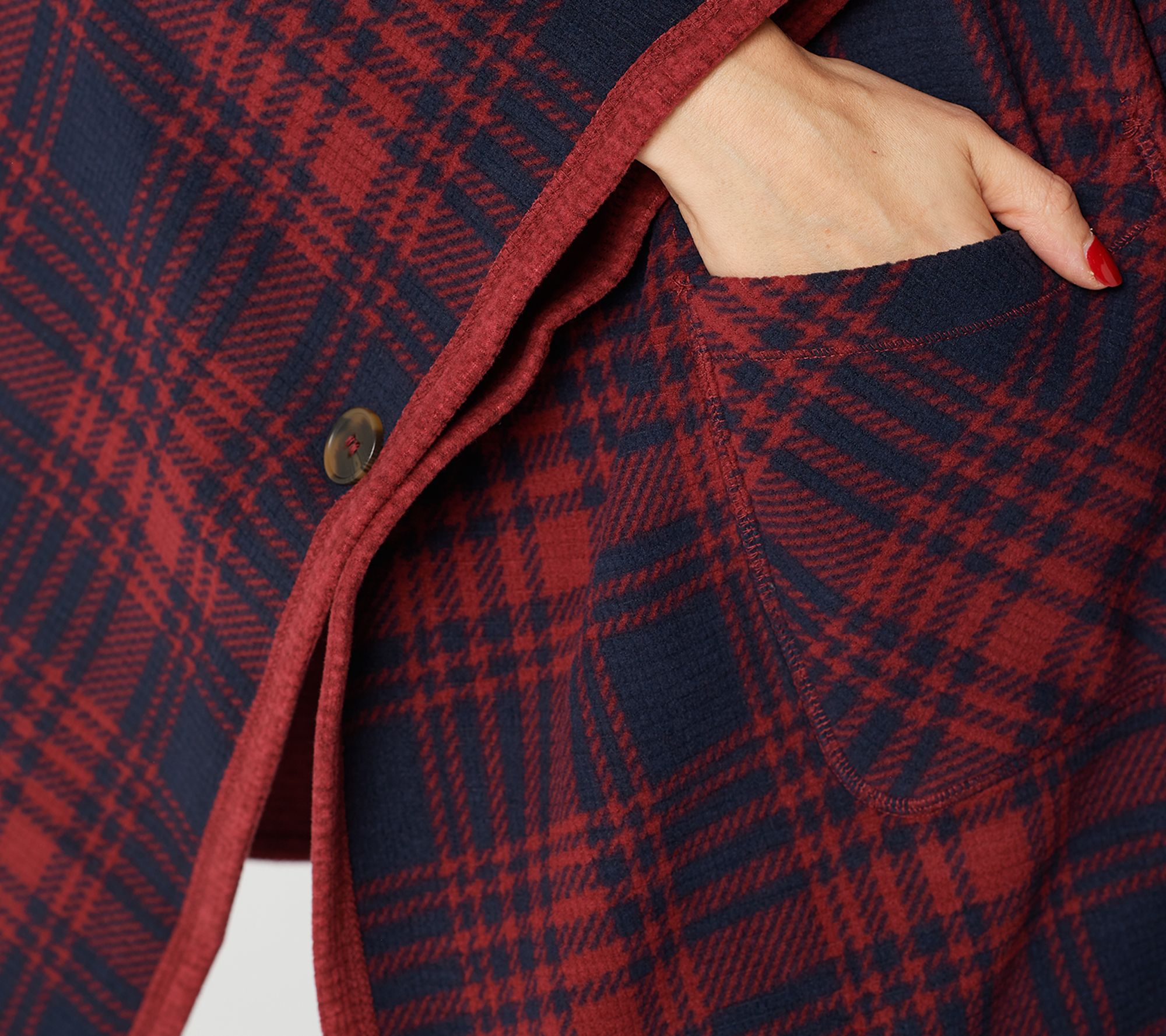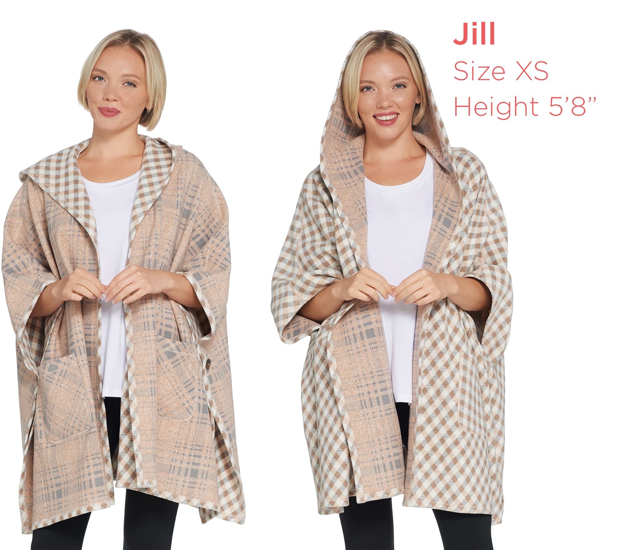 Cuddl Duds Reversible Fleece Open Hooded Wrap feature patch pockets, button closure at side, hood and open front. Knit. *NOT A QVC FIT* Relaxed-Fit: Generously cut with maximum wearing ease._ Length: XXS/XS=31 1/2", S/M=32", L/XL=33", 2X/3X=34". Cntnt:Face:93% Plystr/7% Spndx,Back:92% Plystr/8% Spndx,Exclusive of Decoration.Care:WBW/MWC/GC/WLC/UONCBWN/TDL/RP/CIIN.Imported.(F).