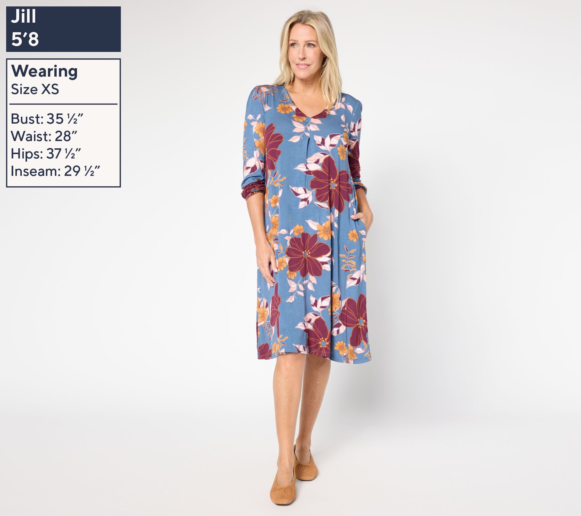 Features: 3/4-length blouson sleeves, V-neckline with front pleat, inside patch pockets