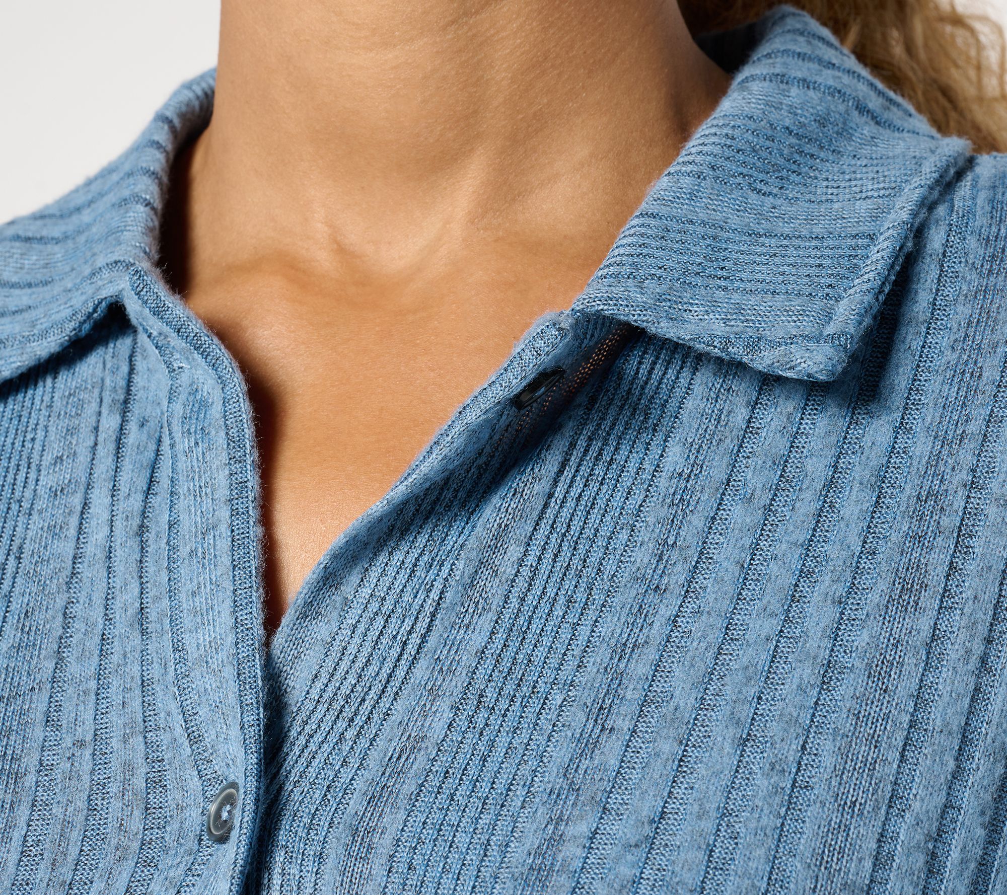 Cardi Features: variegated ribbing, button-front closure, long sleeves, side slits, huggy logo