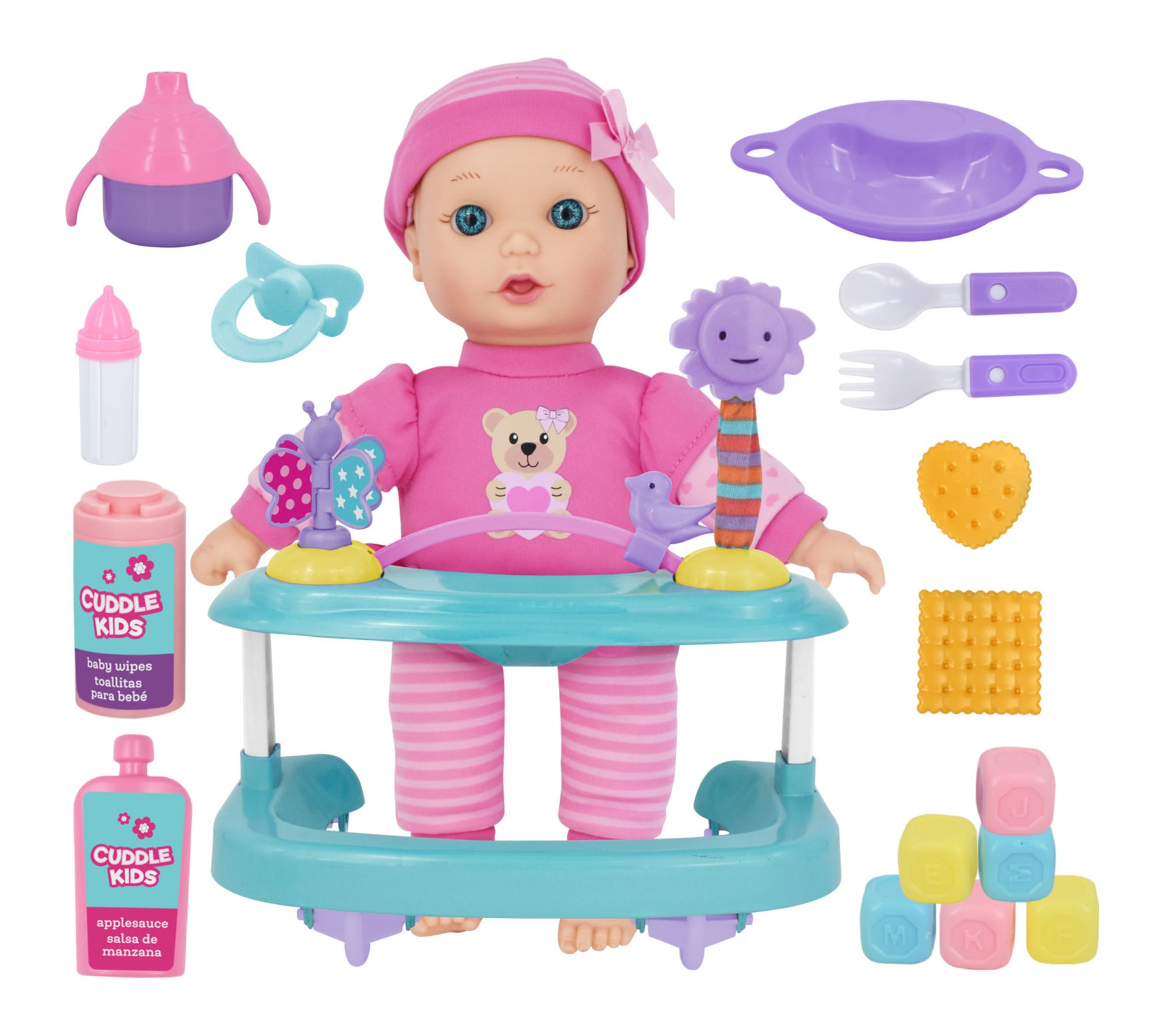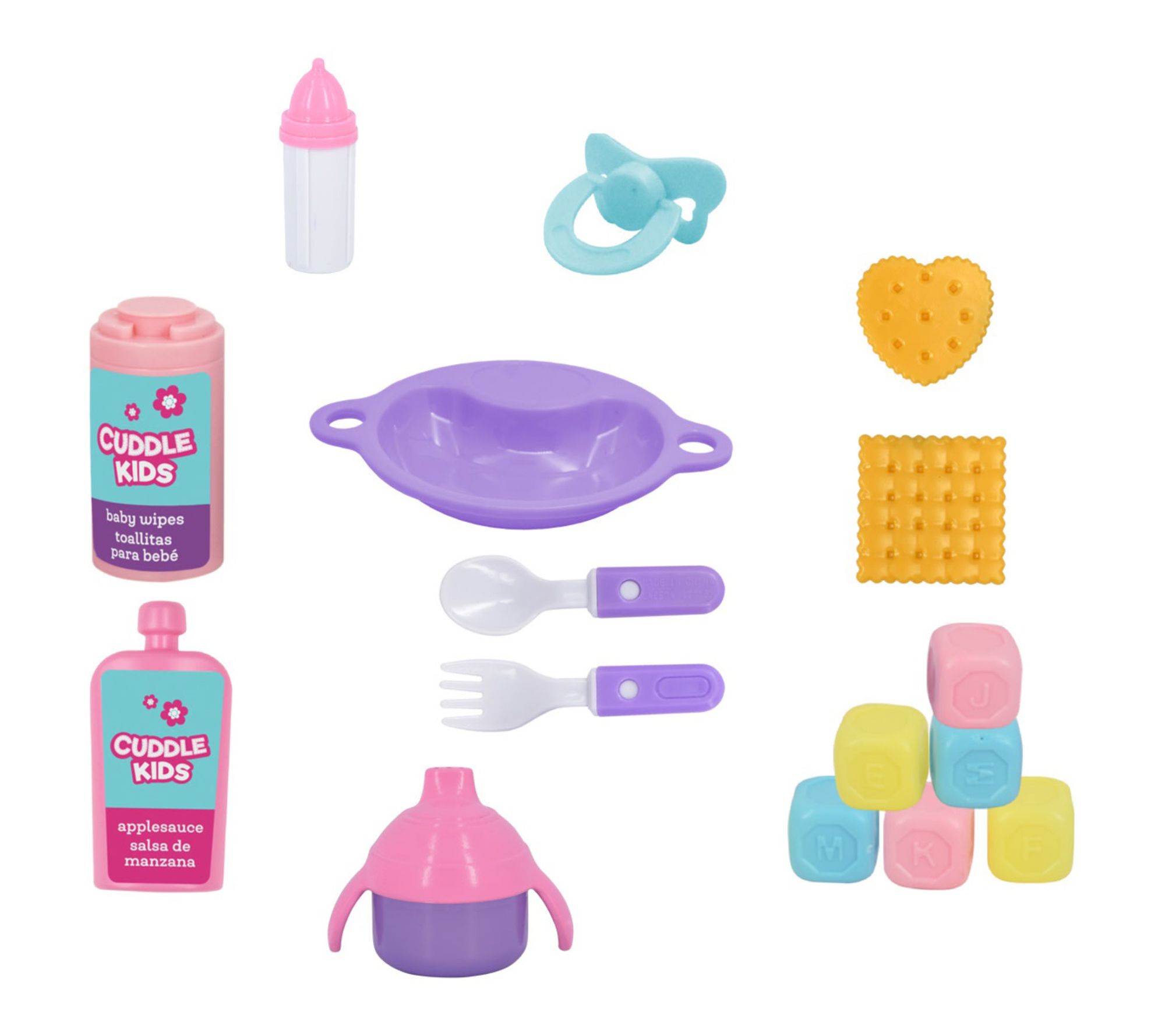• Includes baby doll, playcenter, two play bottles, feeding dish, fork, spoon, six building blocks, baby bottle, pacifier, sippy cup, two crackers