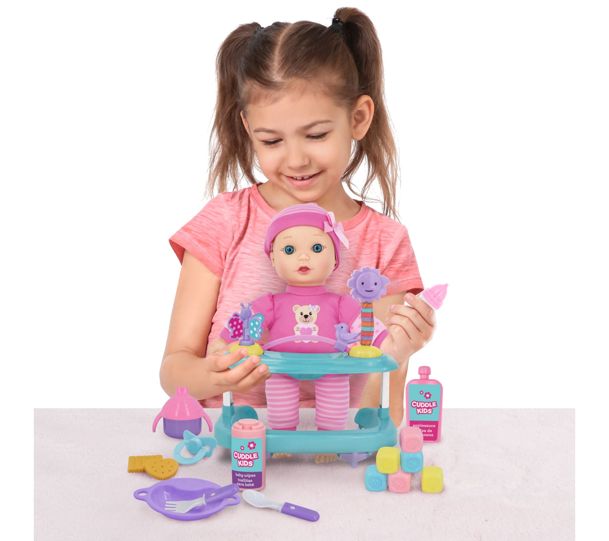 Encourage hours of imaginative play as your child cares for their baby doll with this engaging dolls set. Complete with a playcenter, feeding accessories, and building blocks, it offers plenty of ways to inspire nurturing and creativity. Whether it's mealtime, playtime, or scooting their baby around, each moment brings fun and smiles. From Cuddle Kids.