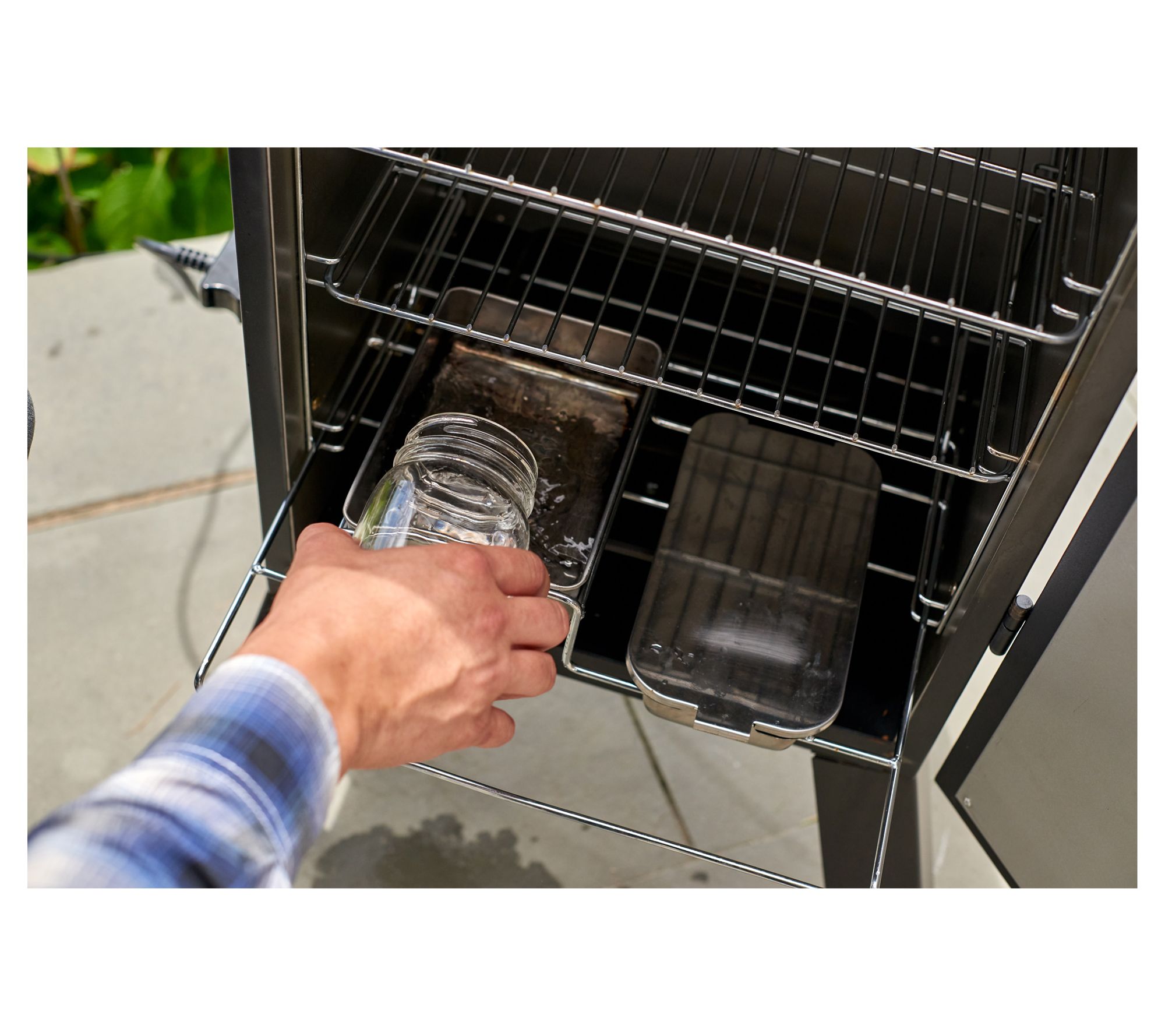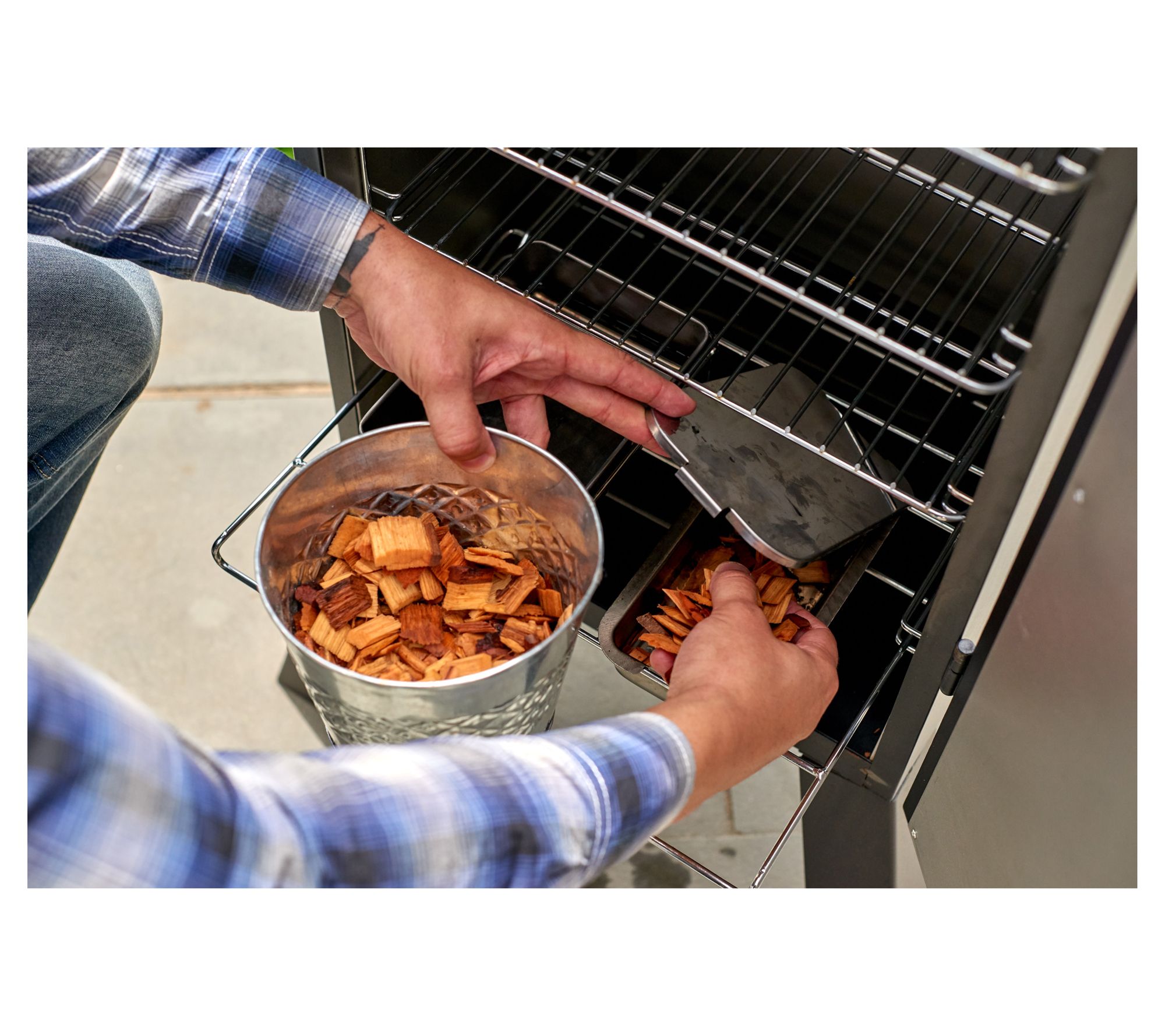 • Removable water pan and wood chip tray for easy setup and cleanup