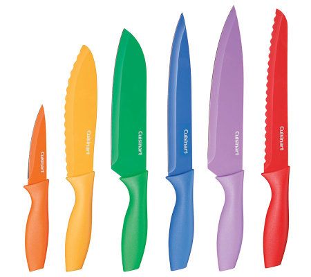 Colorful cutlery. This knife set is color coded to prevent cross contamination. The sharp, nonstick blades lets you slice, dice, and be precise. From Cuisinart.