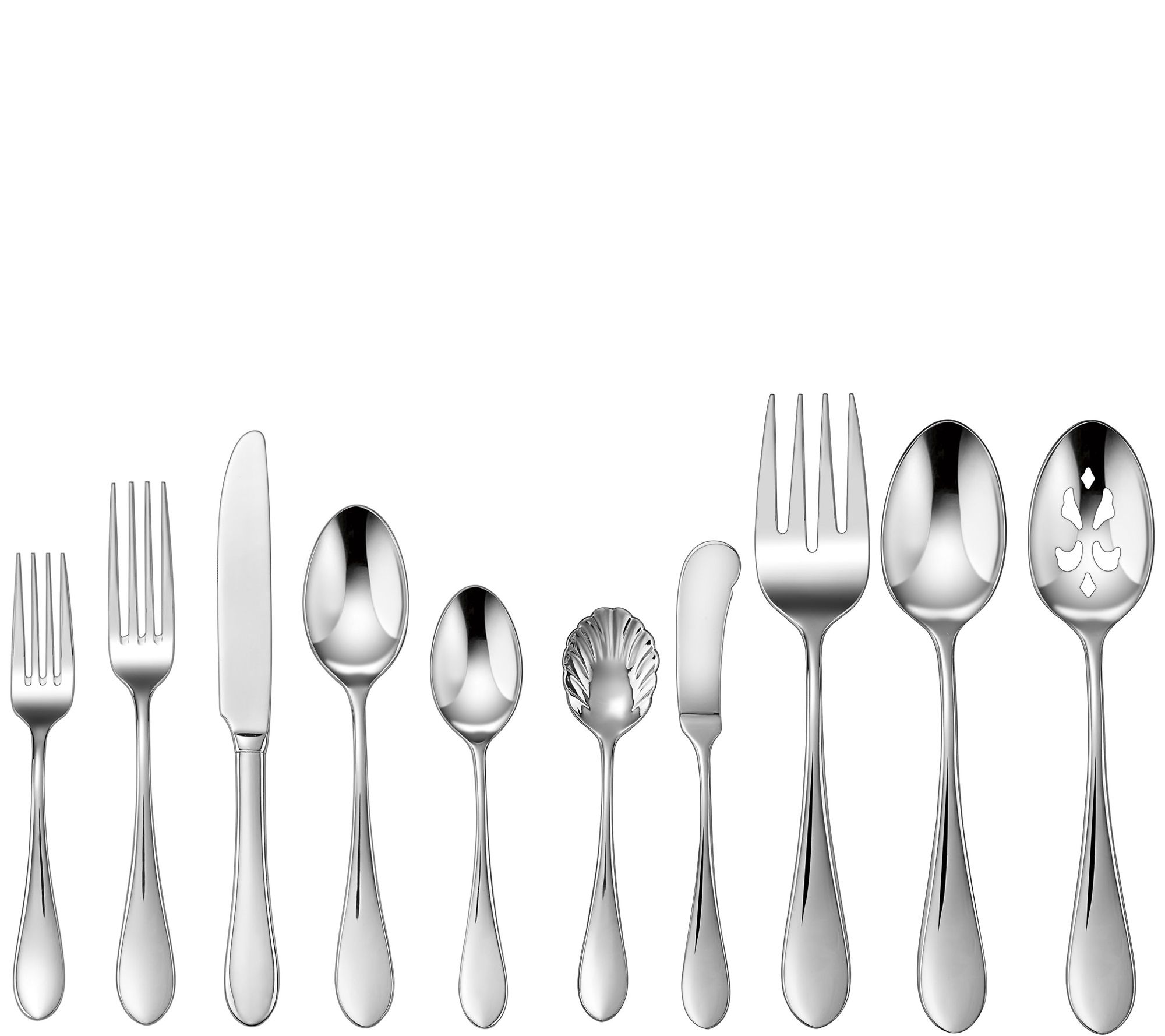 • Includes eight dinner forks, eight salad forks, eight dinner knives, one butter knife, eight dinner spoons, eight teaspoons, one serving fork, one serving spoon, one pierced serving spoon, and one sugar spoon