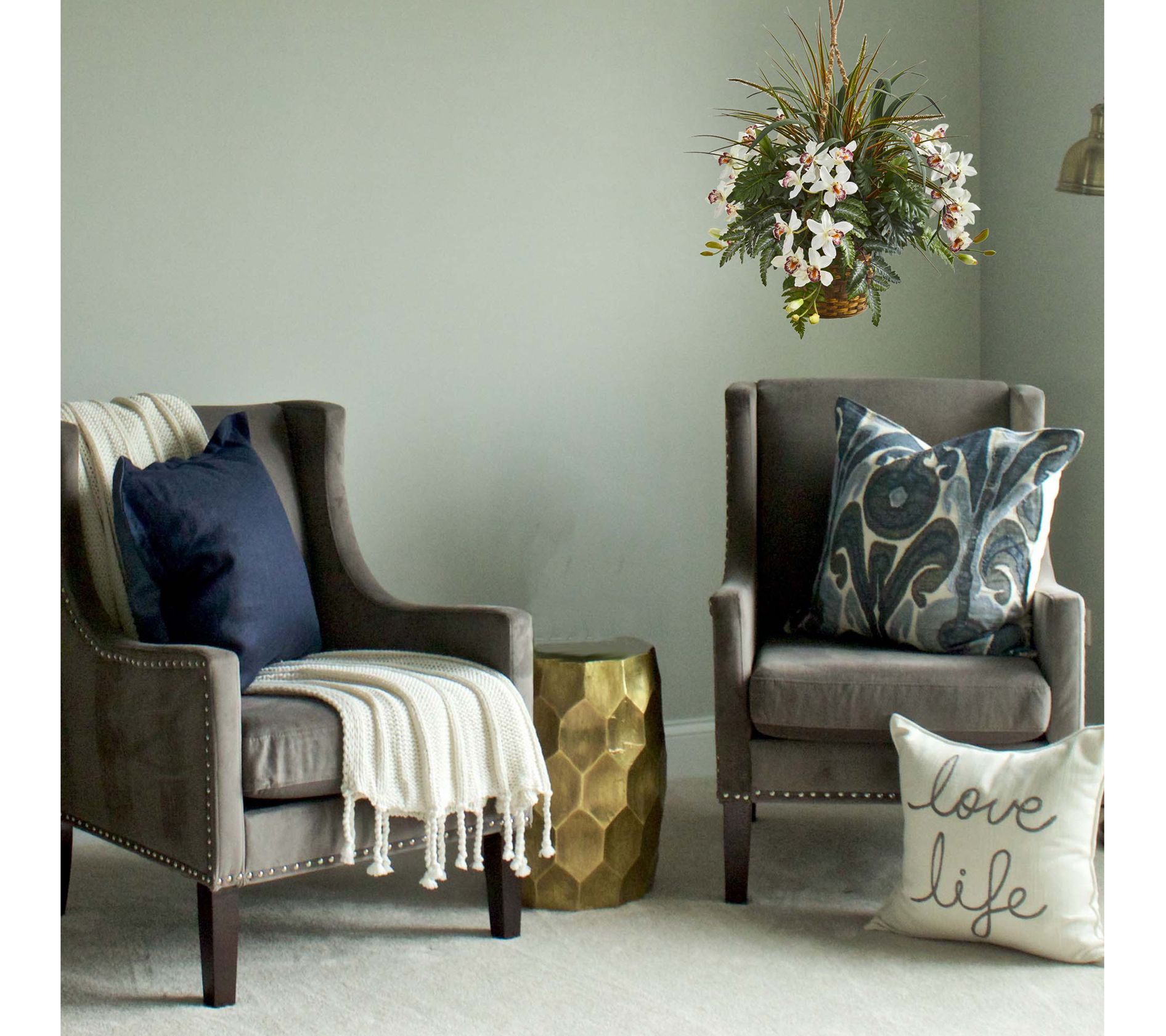 • Lifelike cymbidium and mixed green arrangement in a hanging basket