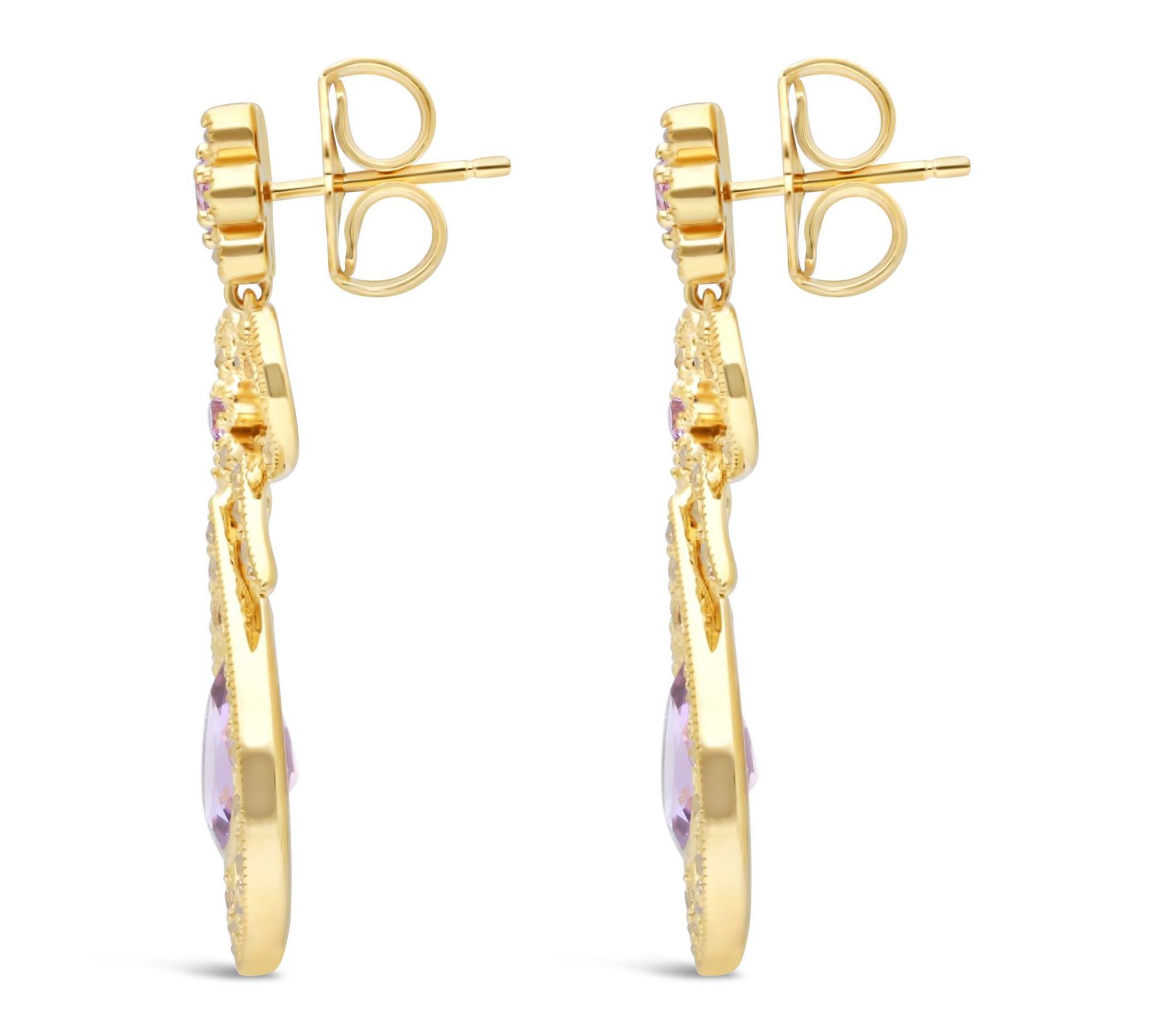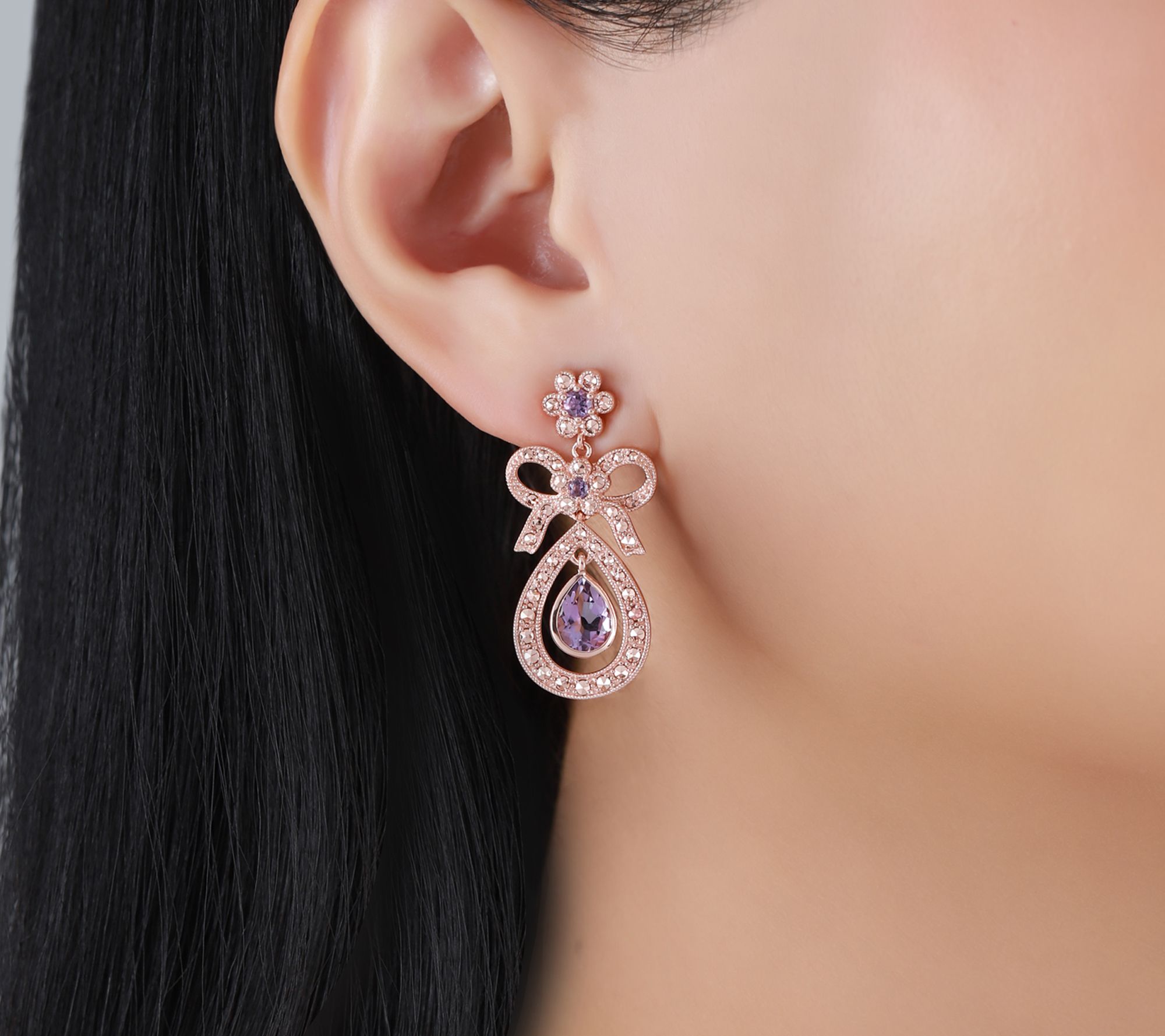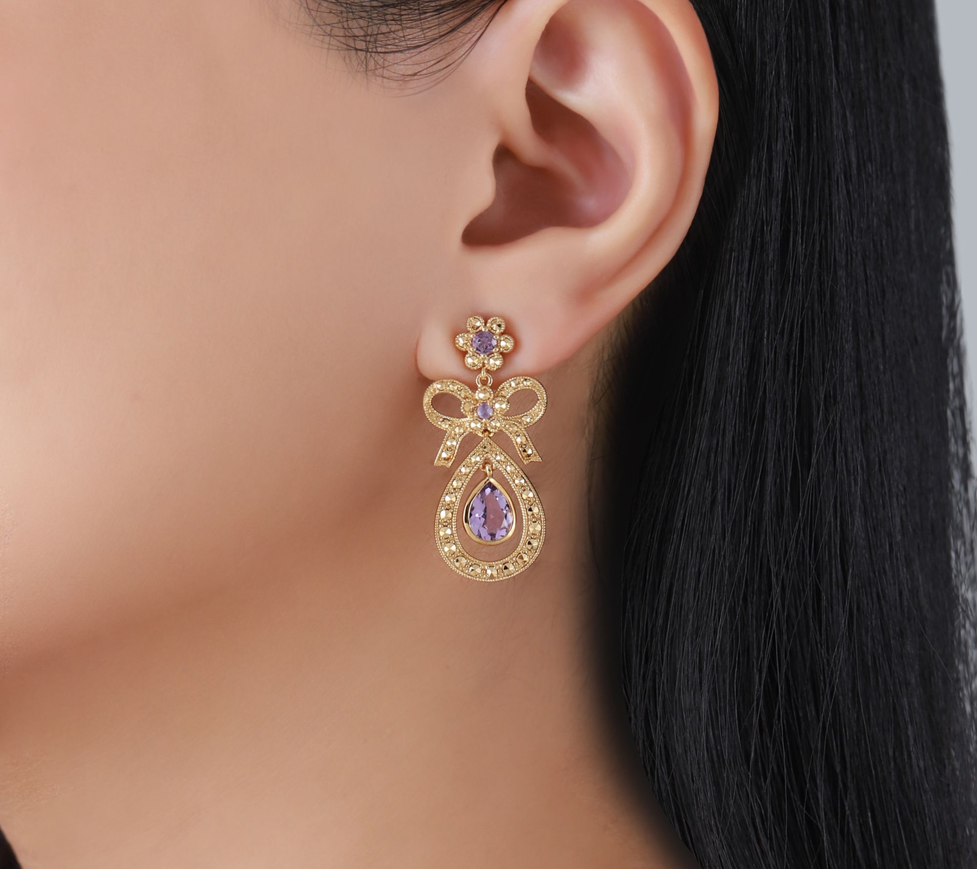 Capture the romance of the late Victorian era every time you wear these dazzling dangle earrings. Inspired by whimsical 19th-century motifs, the bow silhouette sparkles with 14K gold-clad chrome marcasite accents, while a vibrant amethyst drop catches the light with every movement -- making them a stunning choice for elegant evenings or adding a refined pop of color to your day. From Dallas Prince.