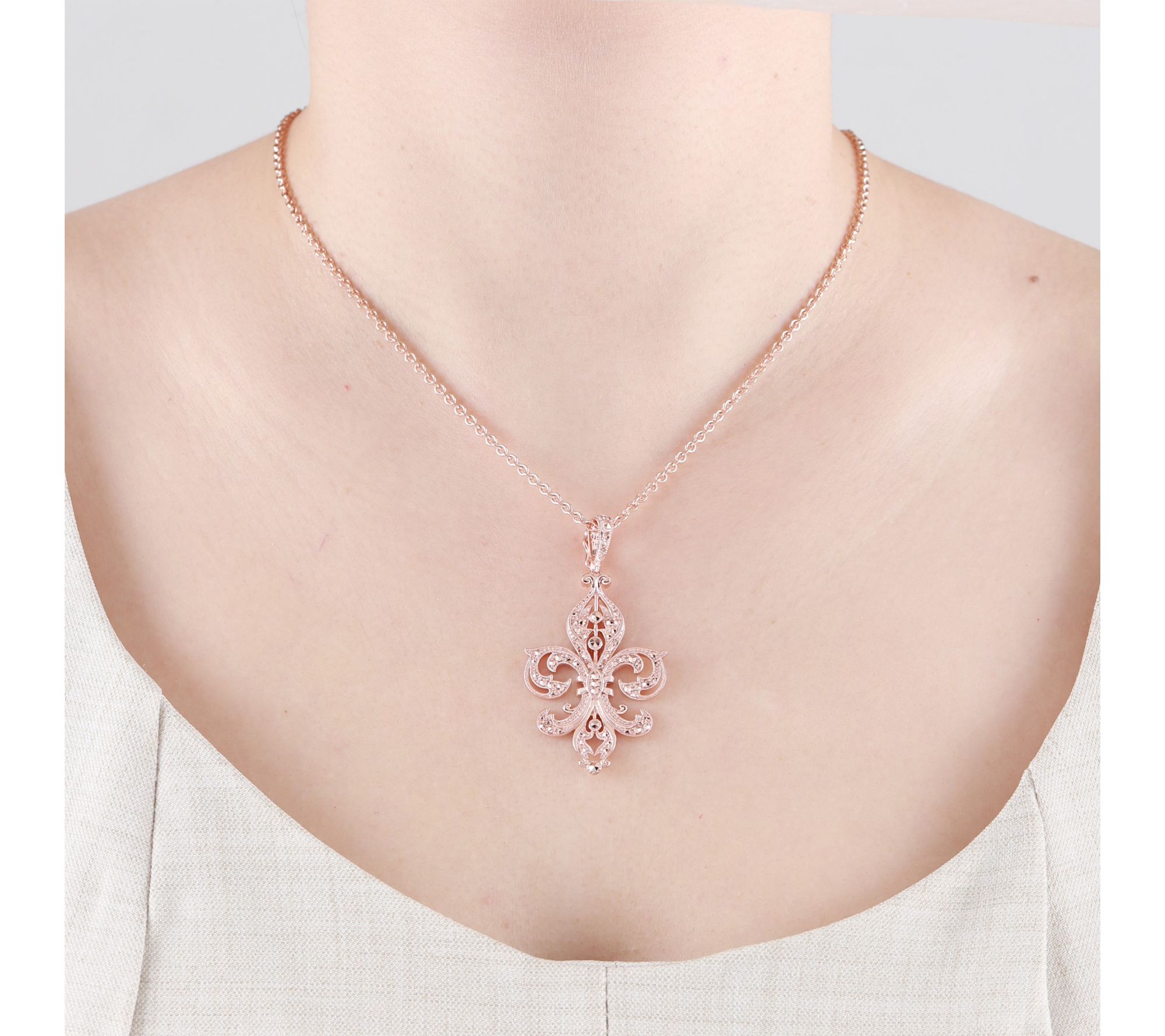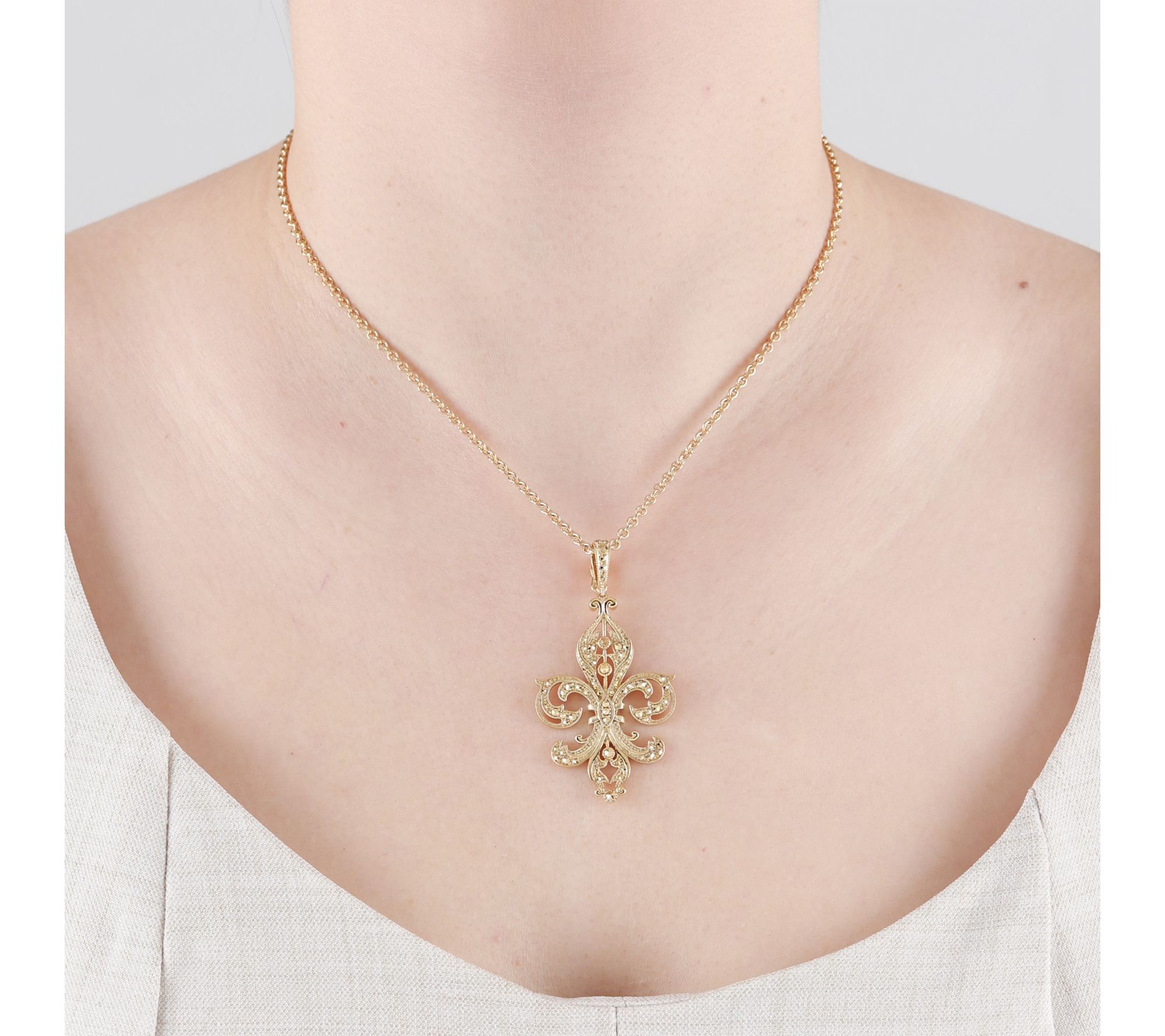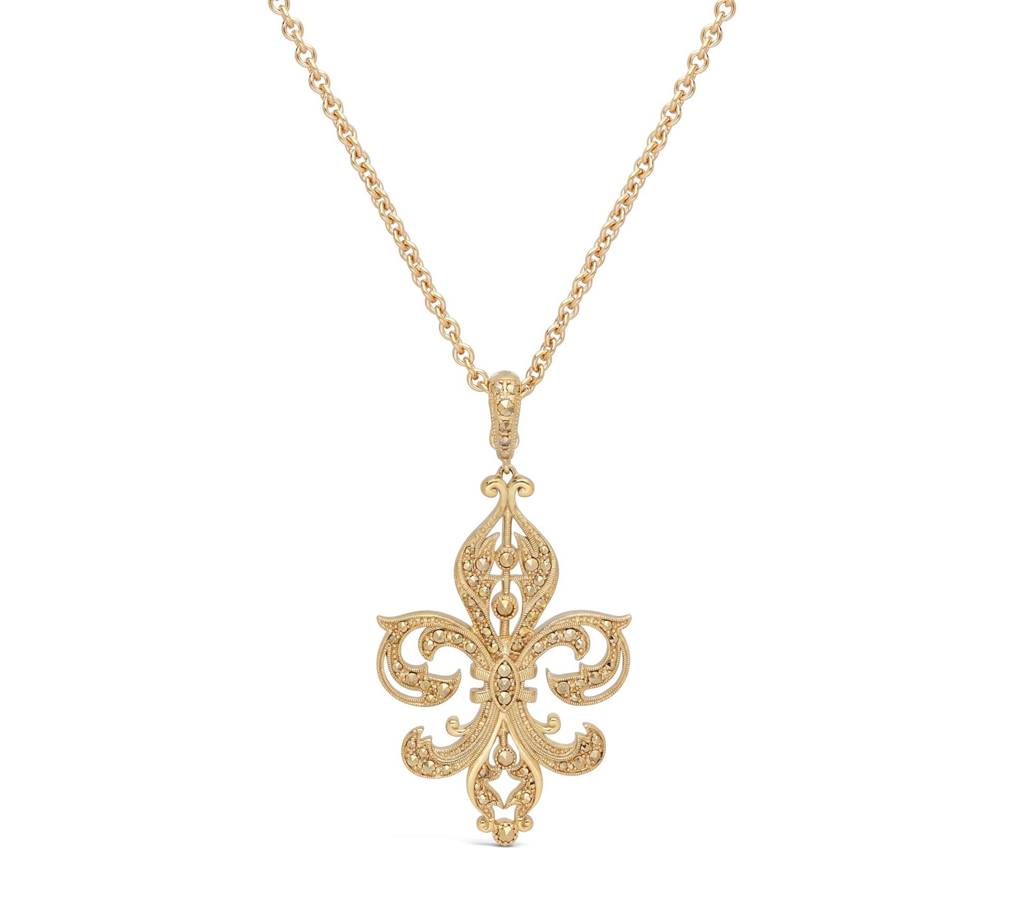 Bring a touch of Old World grace to your everyday look with this fleur-de-lis necklace, gleaming in 14K gold-clad sterling silver and accented by marcasite. Whether you're heading out for a dinner date or simply want a dash of elegant sparkle, its timeless design brings sophistication to any occasion. From Dallas Prince.