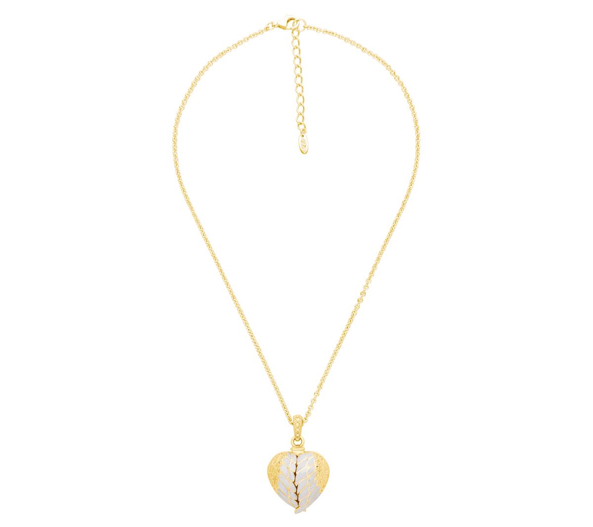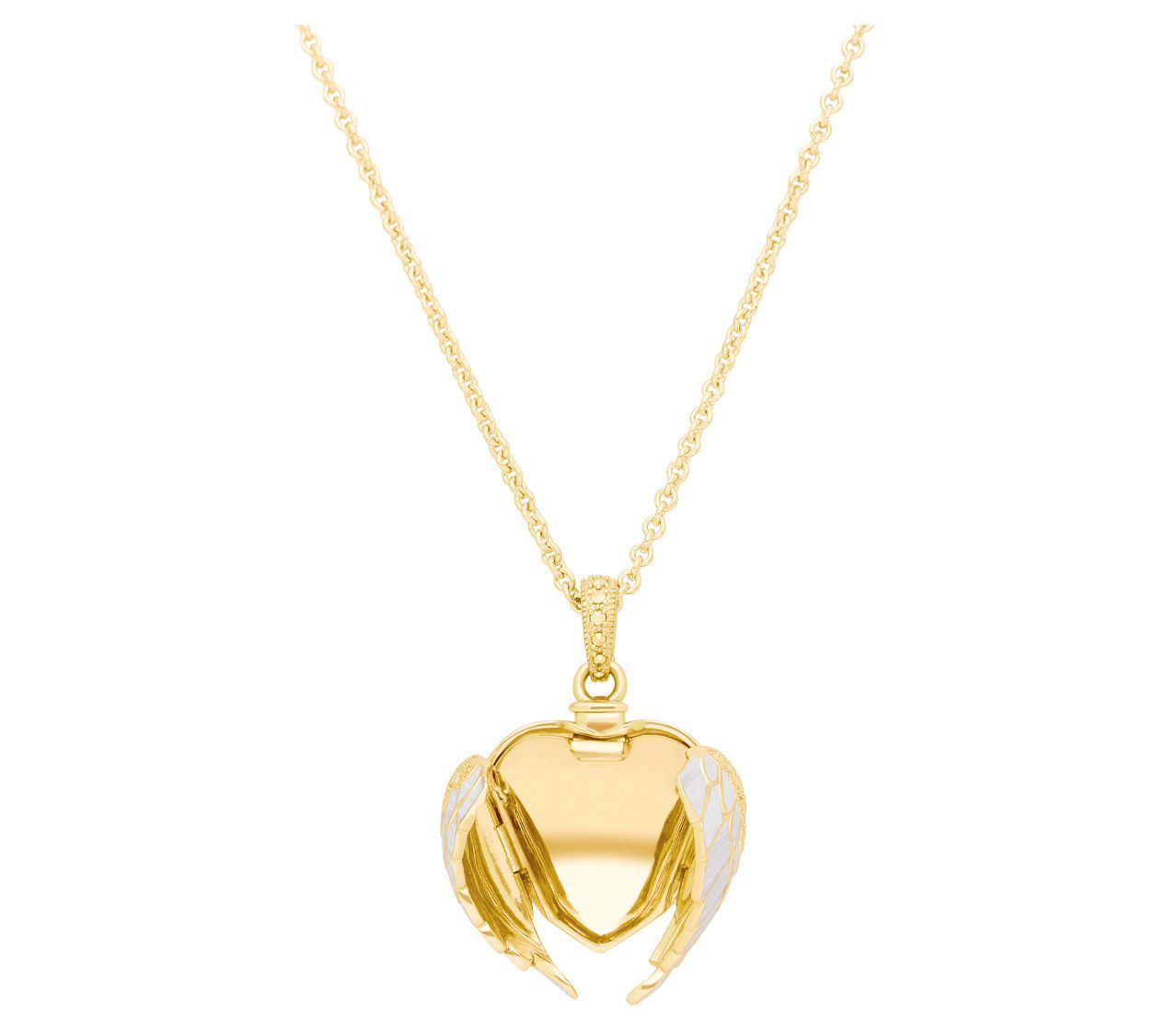 A heartfelt piece that combines stunning style with symbolic sentiment, this Heart of an Angel locket features angel wings adorned with white enamel and 14K yellow gold-plated marcasite to create a captivating contrast. From Dallas Prince.