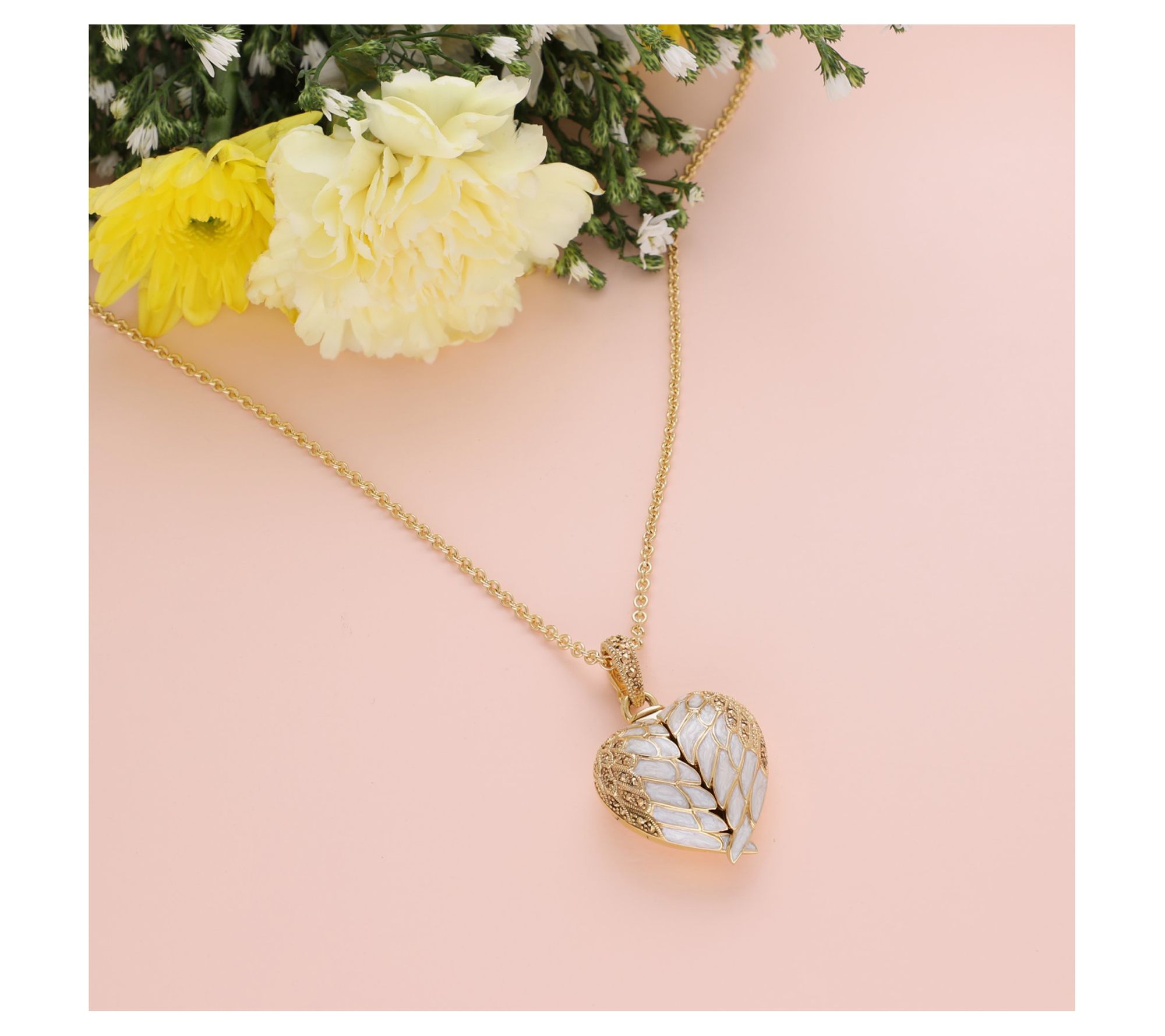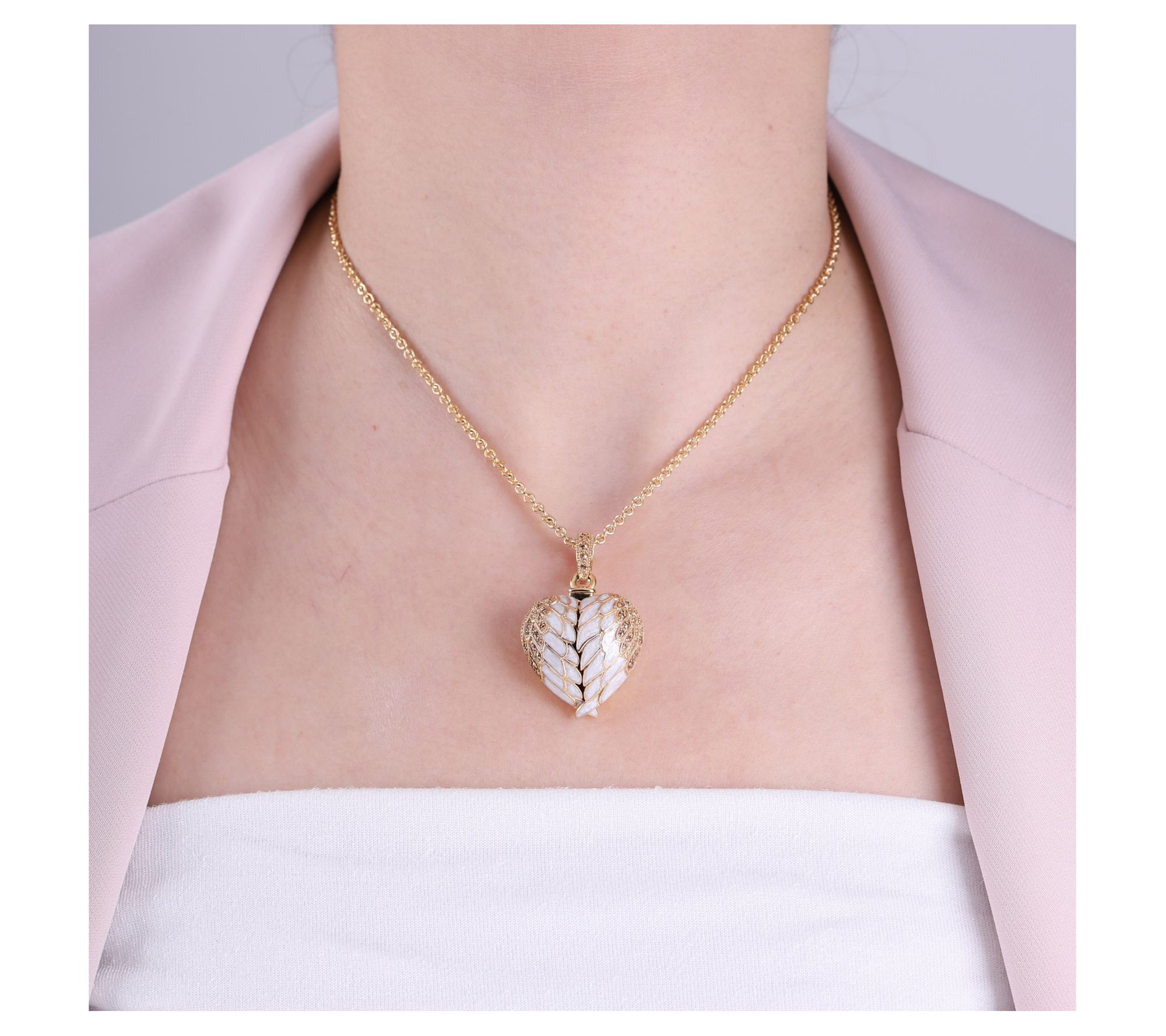 Heart of an angel locket design; white enamel and marcasite wings; rolo link chain