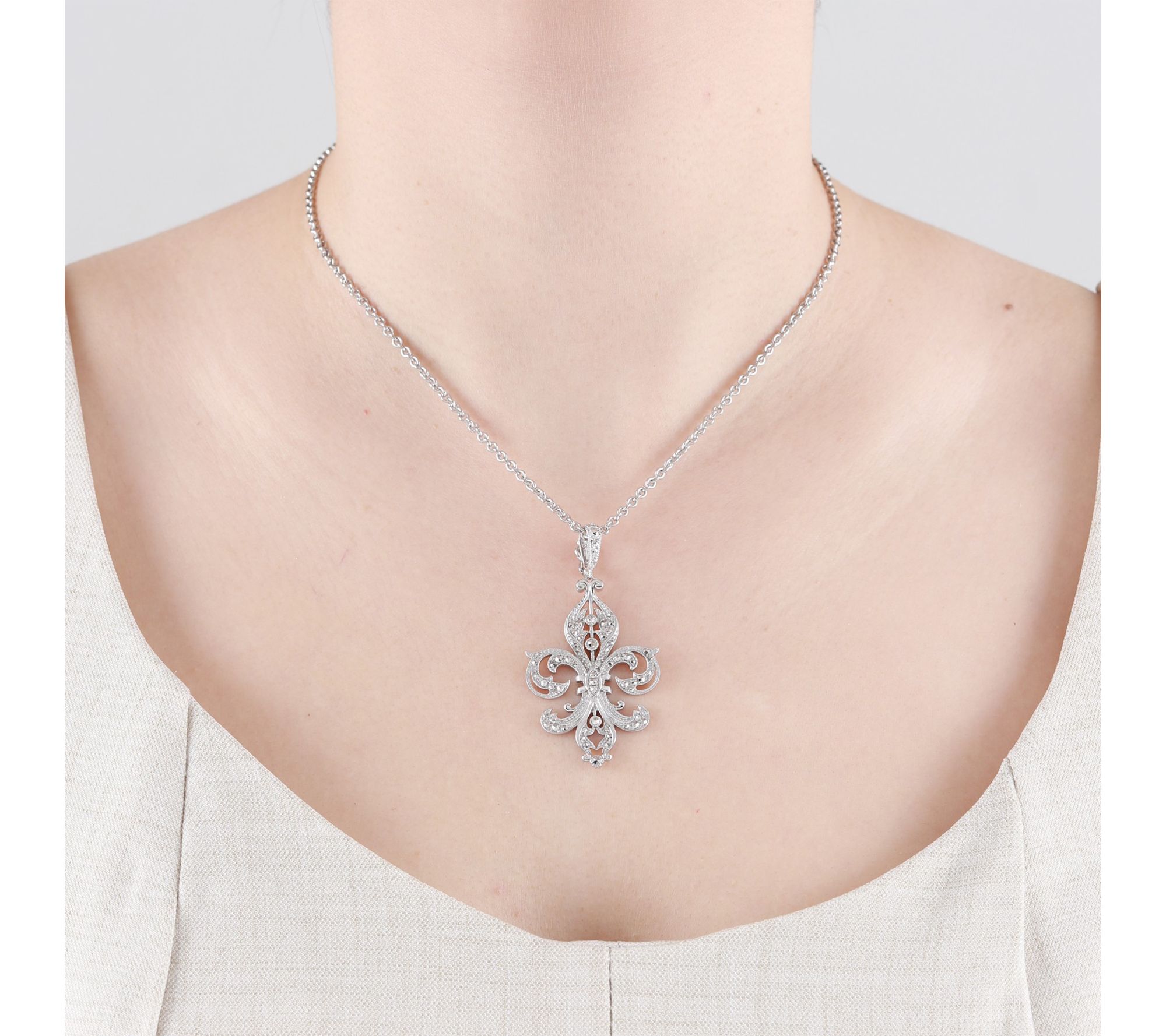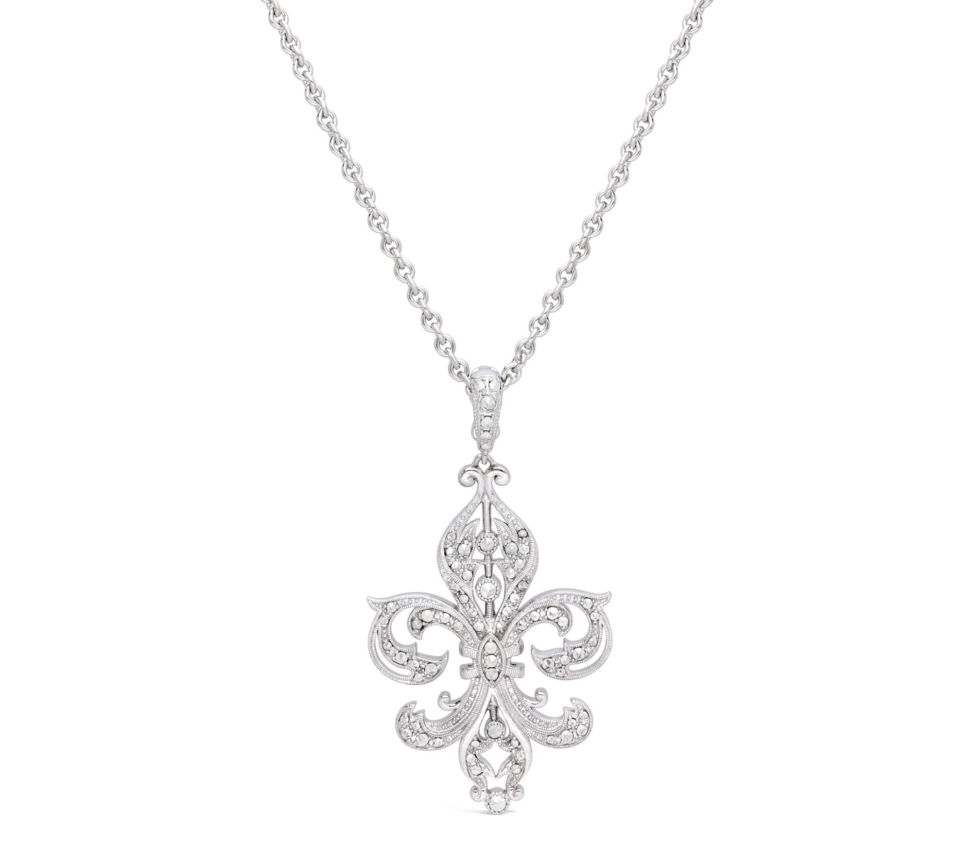 Fleur-de-lis pendant with round, pave-set chrome marcasite gemstones; stylized chain
