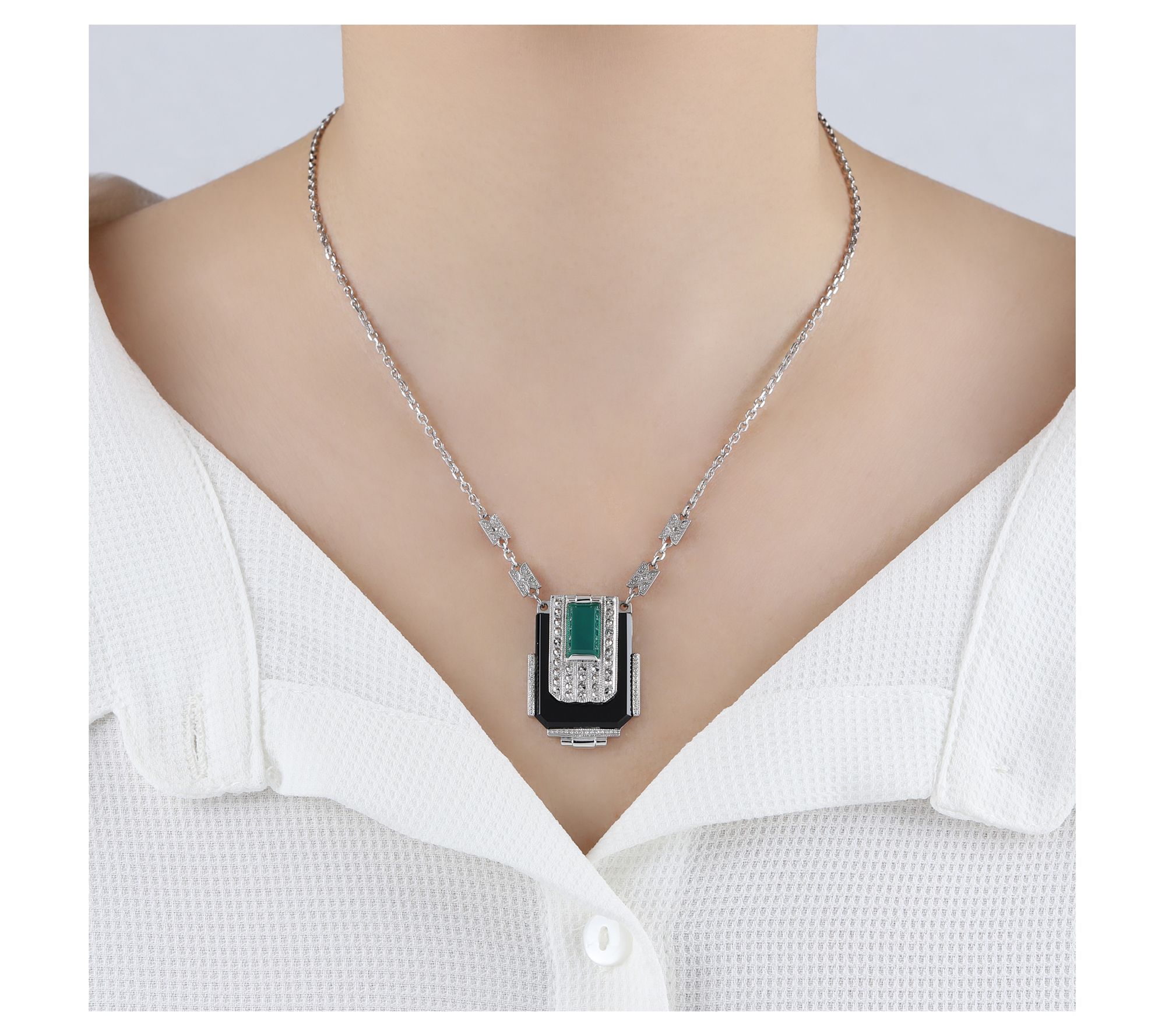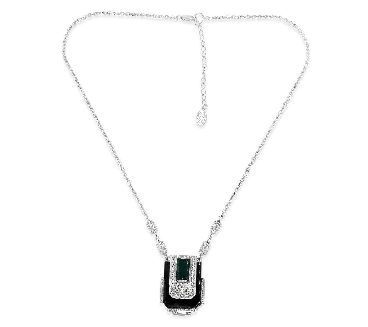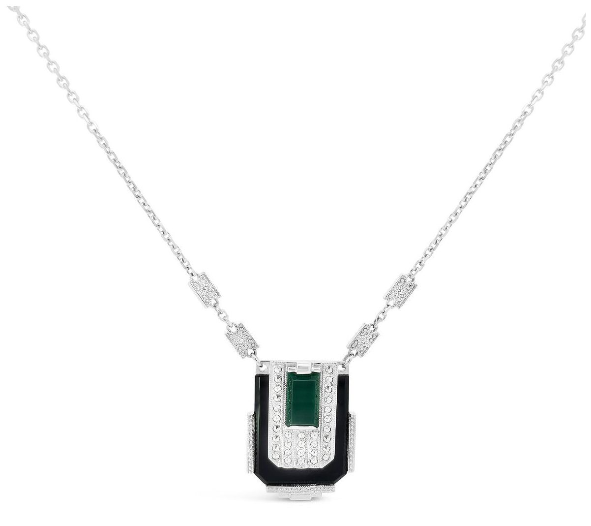 U-shaped design; green chalcedony cabochon inlay; U-shaped onyx; pave-set chrome marcasite accents; cable link chain with marcasite stations