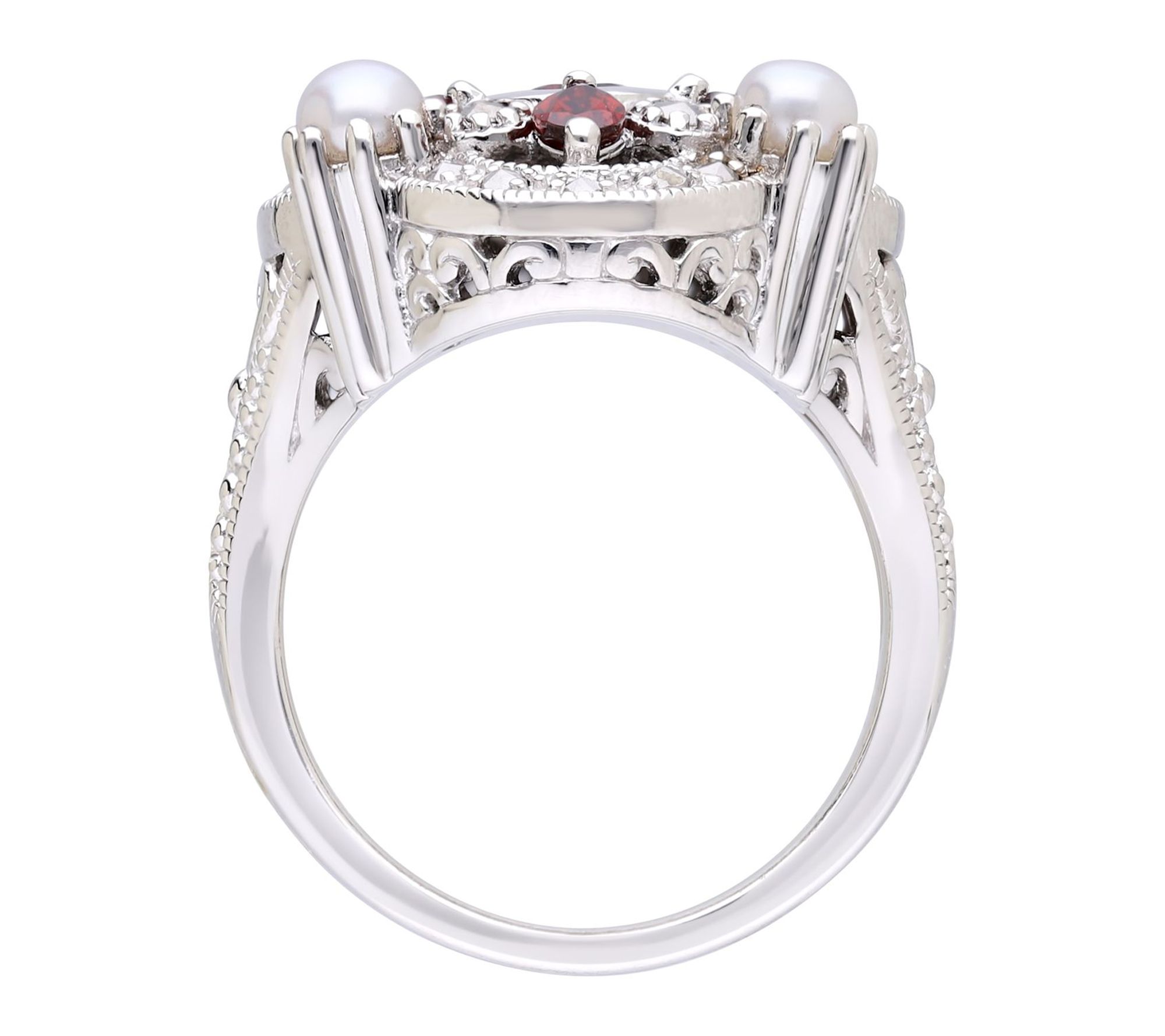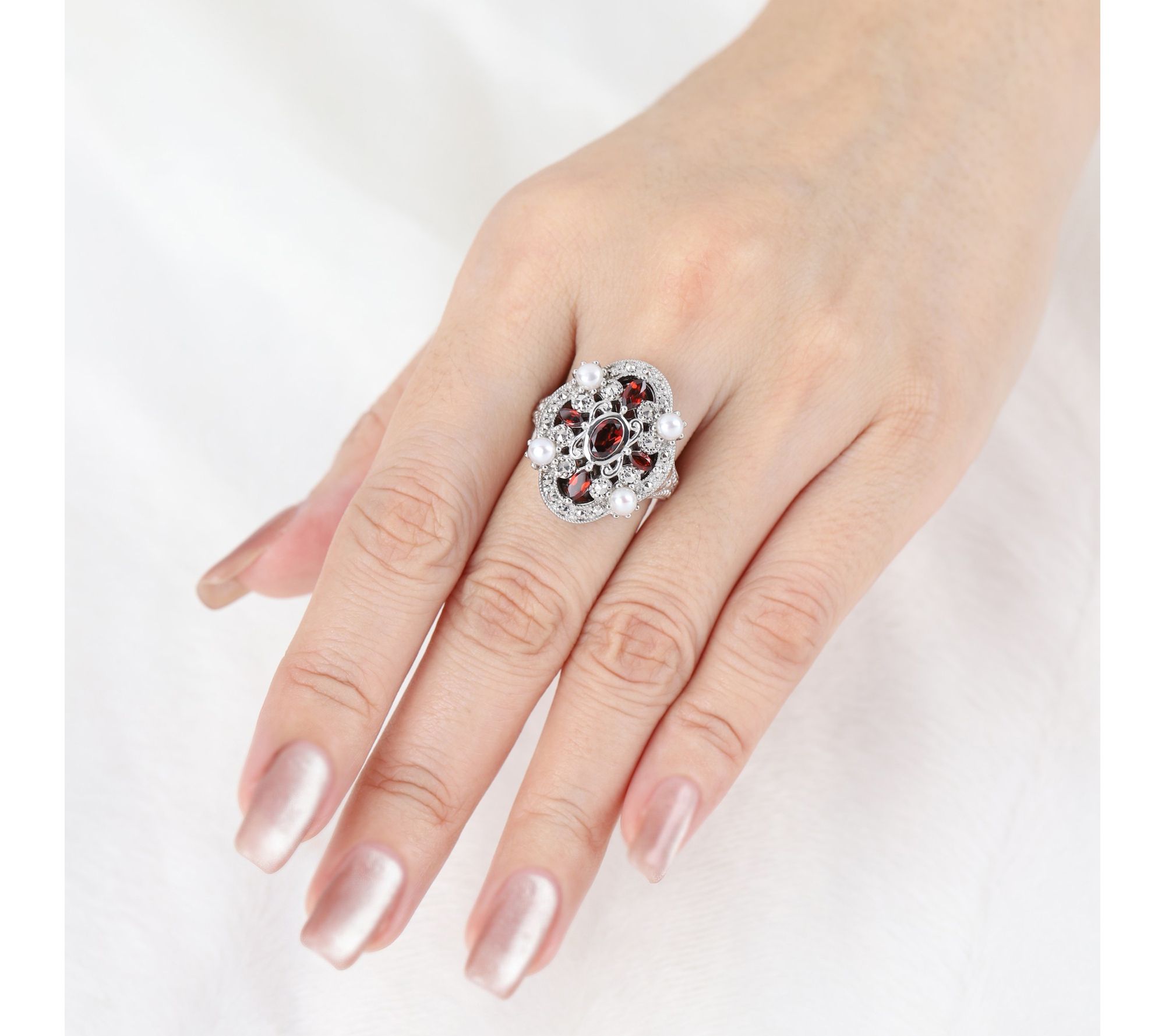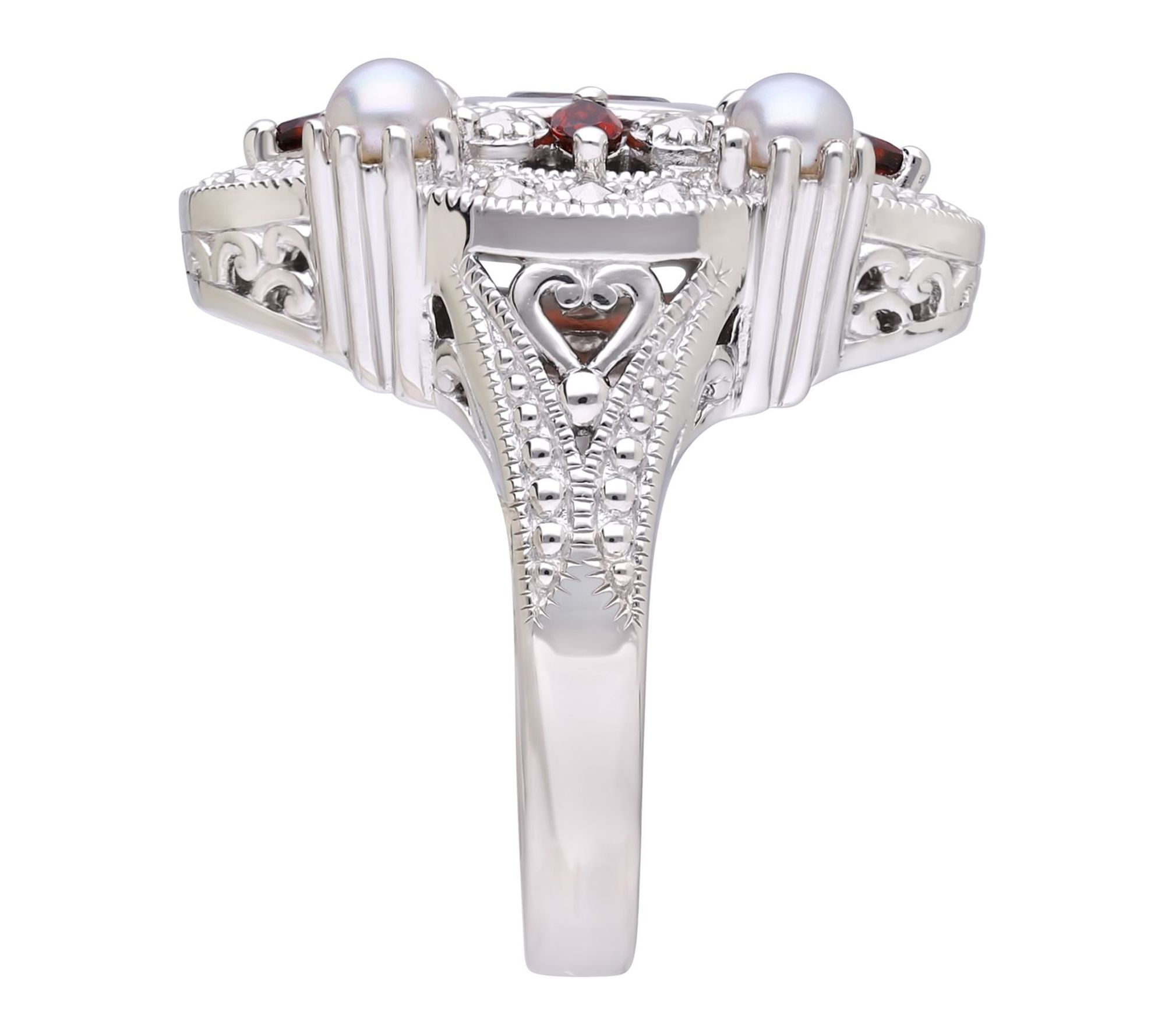 Whether you're dressing for a special evening or adding a touch of glamour to your everyday favorites, this eye-catching ring is designed to enchant. Glimmering garnet is beautifully complemented by chrome marcasite accents and cultured freshwater pearls, creating a sparkling statement that's sure to gather compliments. From Dallas Prince.