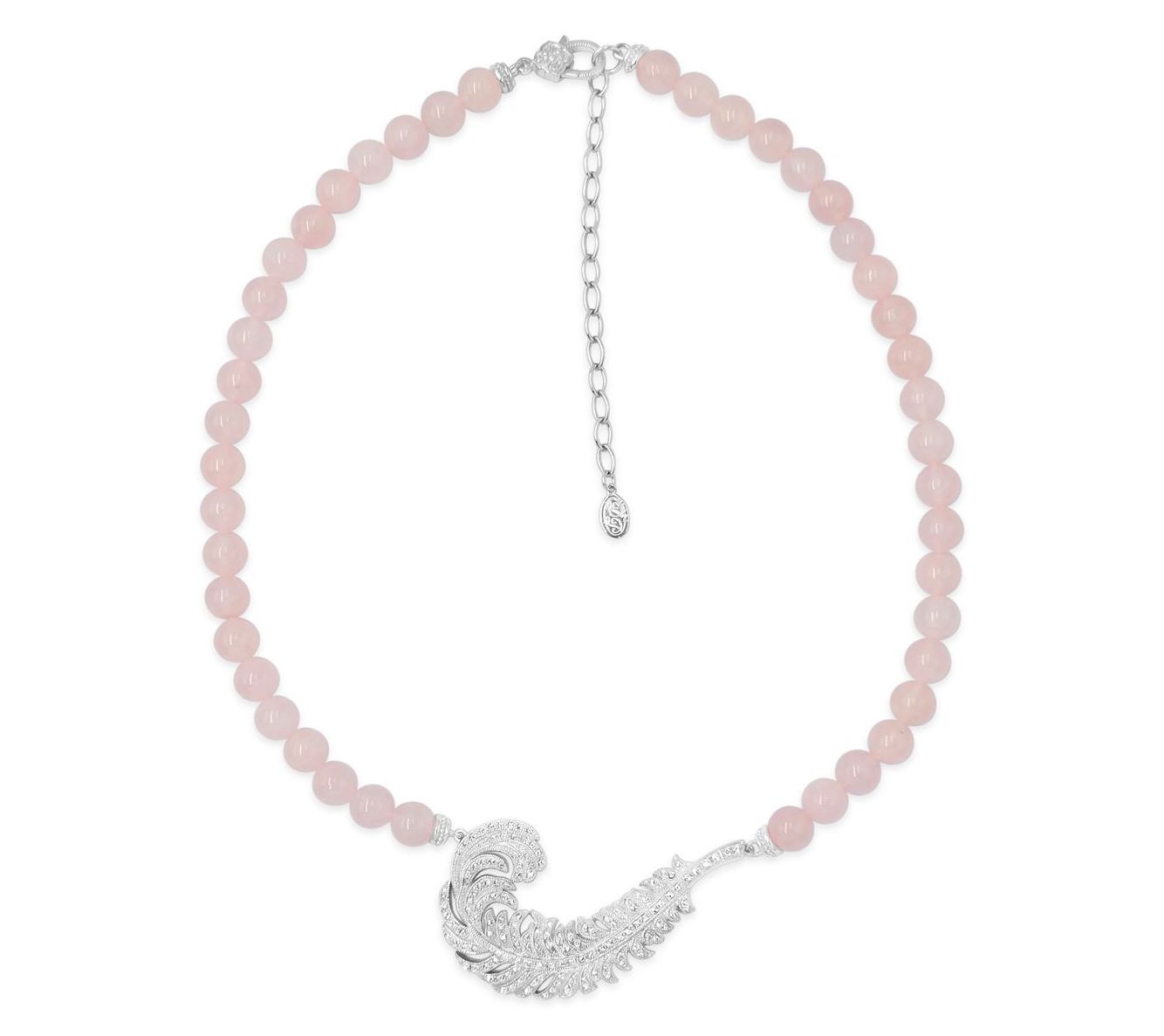 An ordinary day feels a bit more meaningful when you add a touch of symbolism to your look. Polished 8mm rose quartz beads offer a serene vibe, while a sparkling chrome marcasite feather pendant glimmers with every step. The adjustable chain lets you adapt your style -- draped over a soft sweater for brunch, or as a statement with your favorite dress. From Dallas Prince.