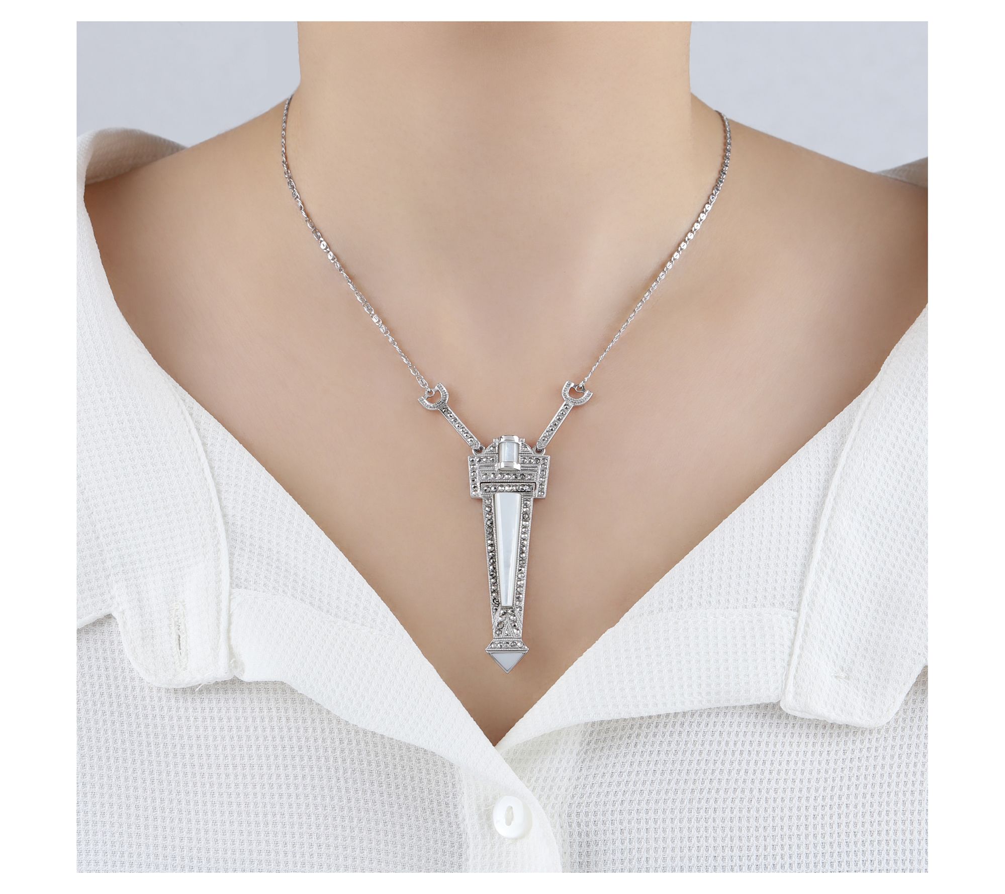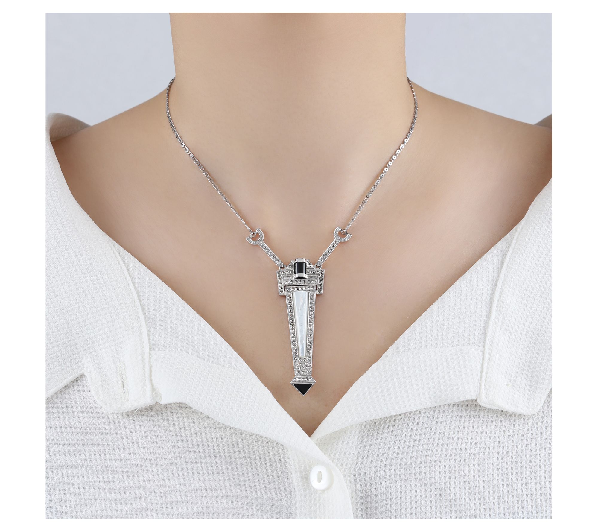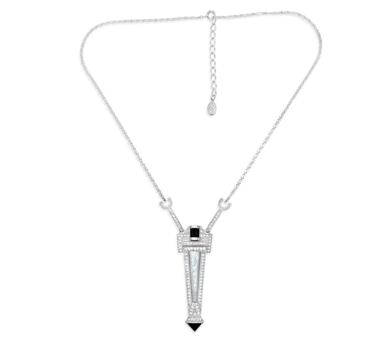 Ready for everything from coffee dates to candlelit dinners, this sterling silver necklace puts a glamorous spin on your day-to-night look. Black onyx, mother-of-pearl, and pave-set chrome marcasite light up the pendant with artful detail, all suspended from a cable link chain that lies beautifully along the neckline. From Dallas Prince.