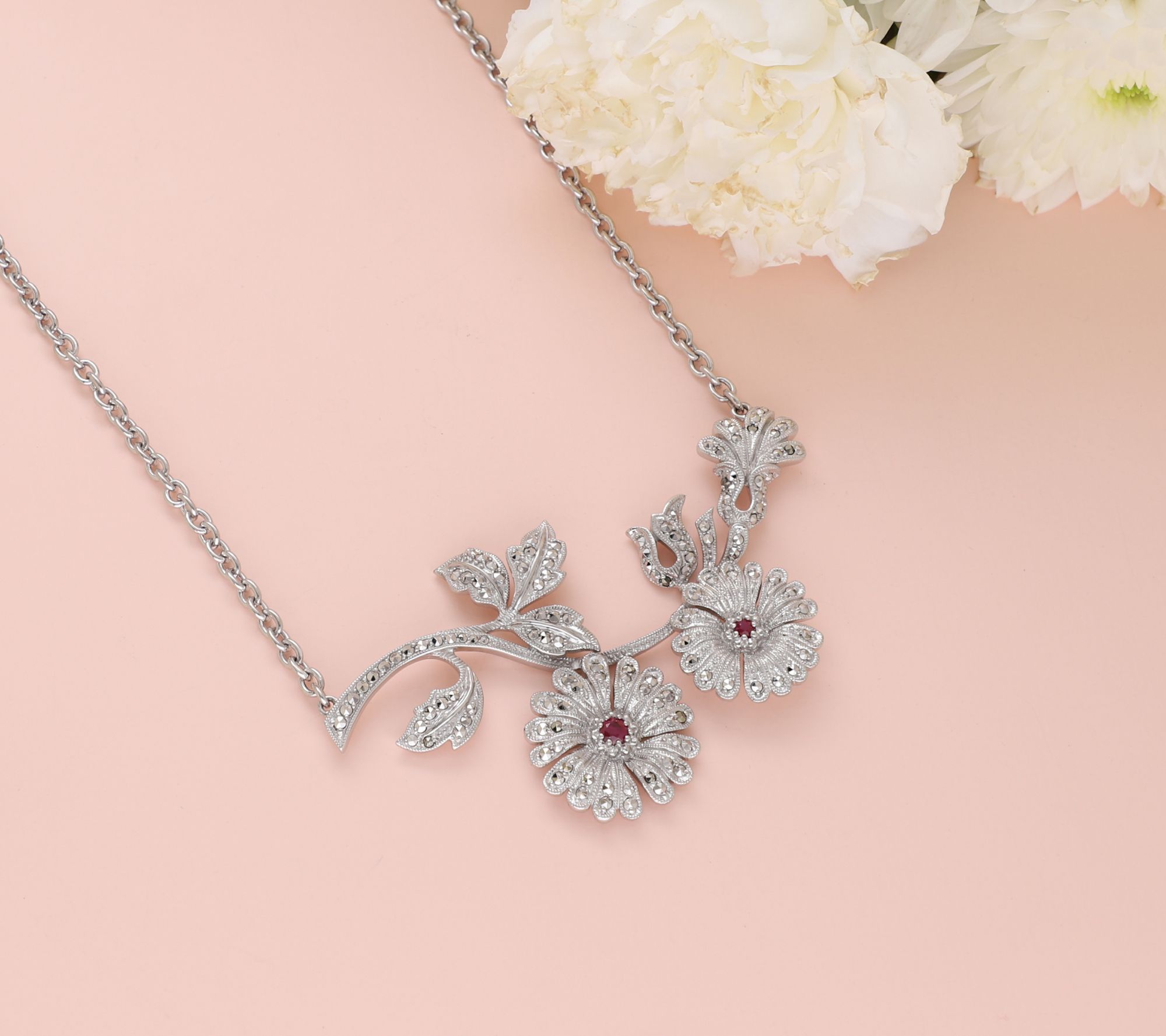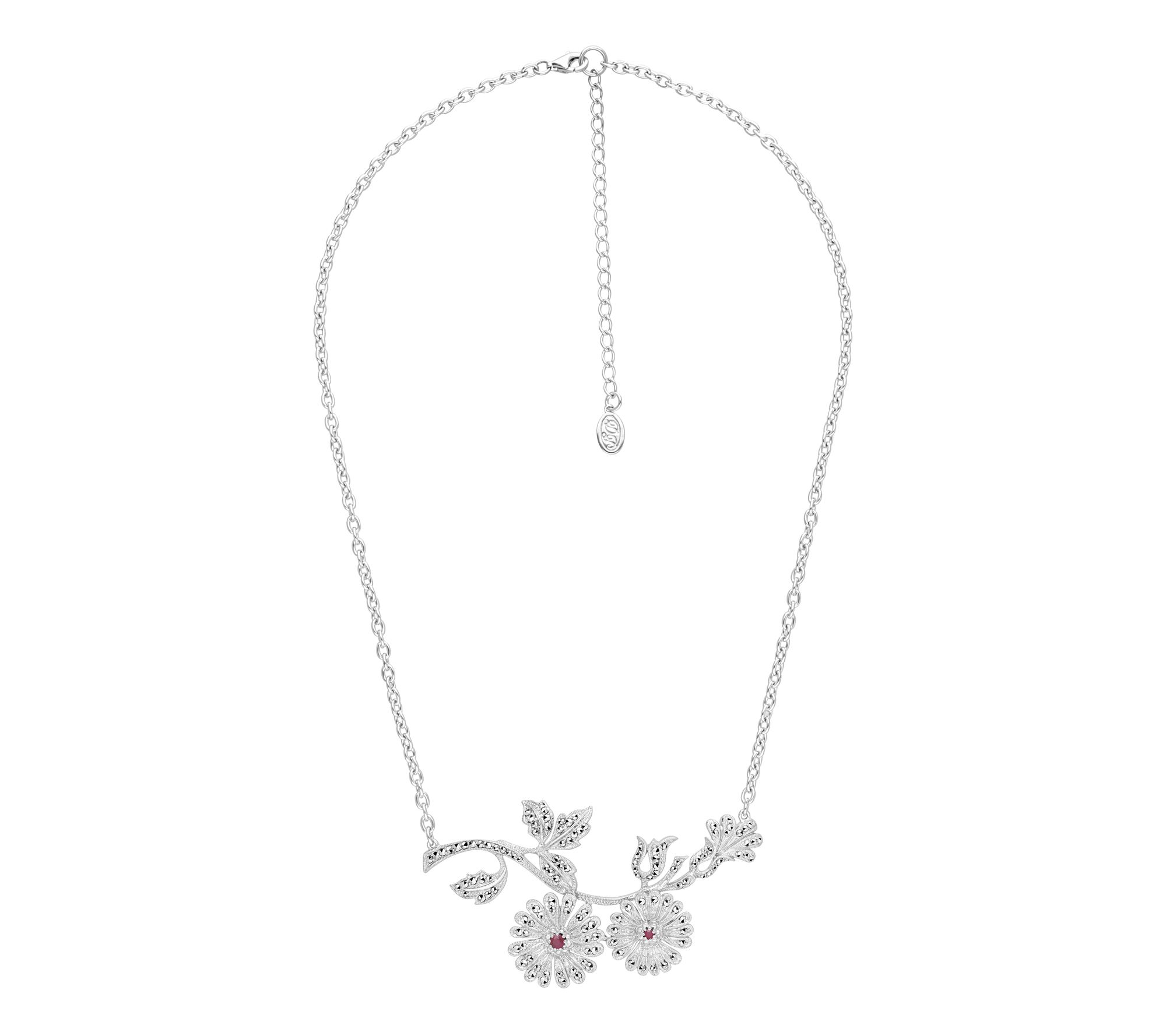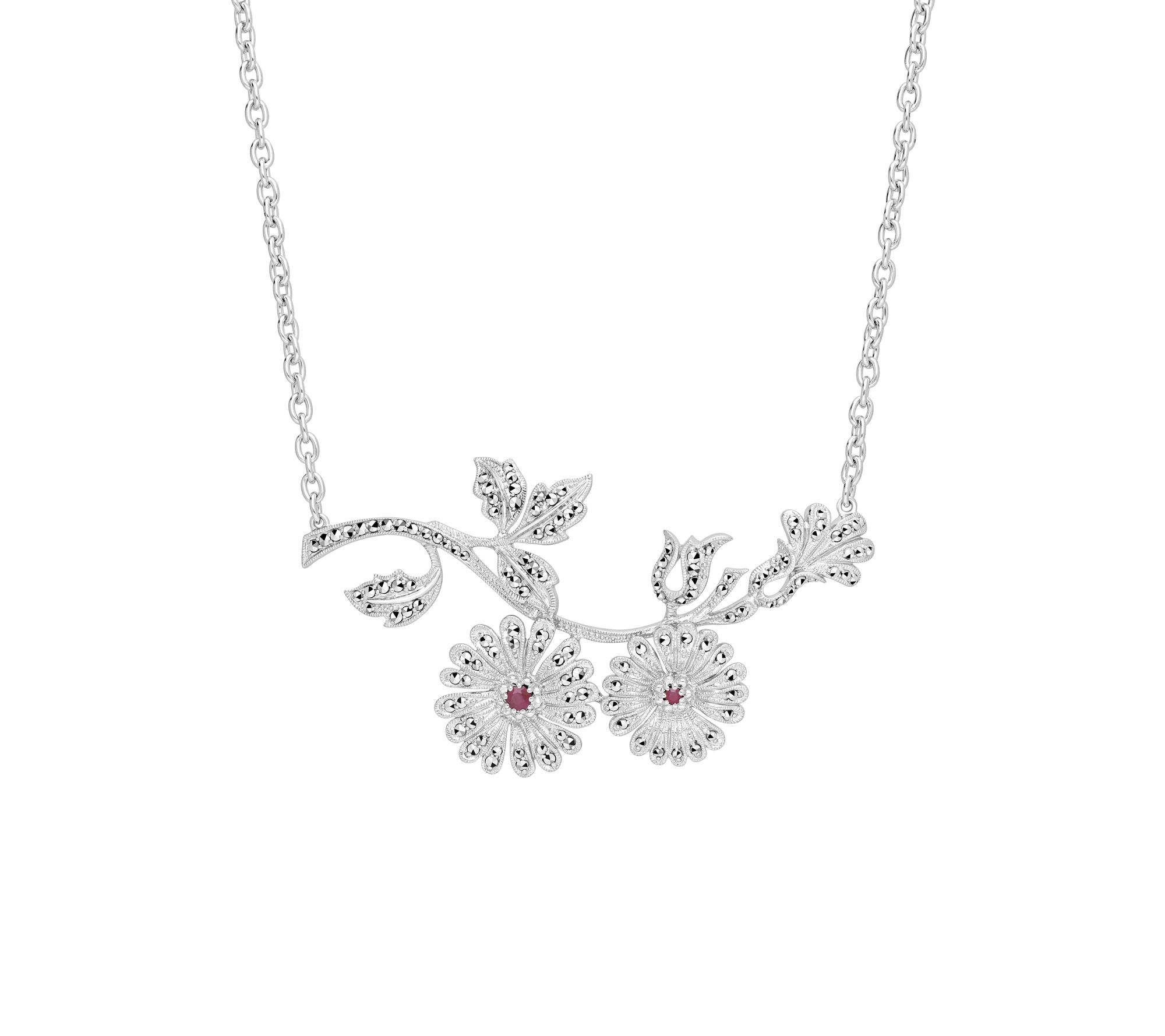 Rhodium-plated floral design; oval link chain; ruby stones in flower centers