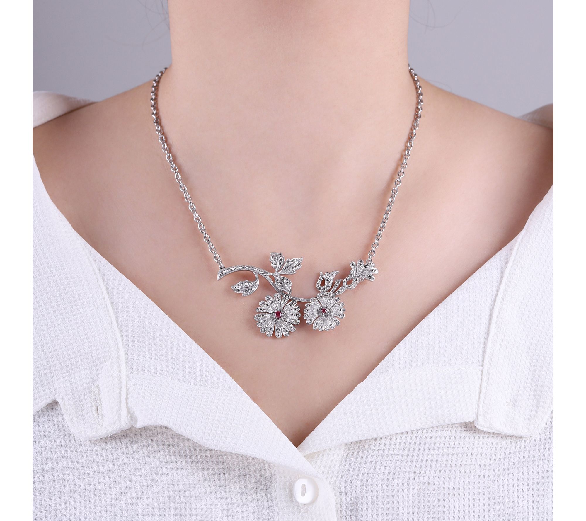 Wear a piece of nature's beauty with the Dallas Prince Sterling Ruby Marcasite Floral Vine Necklace. The intricate design features pave-set marcasite flower petals and vines, highlighted by vivid rubies at the center. This exceptional piece is perfect for adding a touch of elegance to your day or night wardrobe. From Dallas Prince.