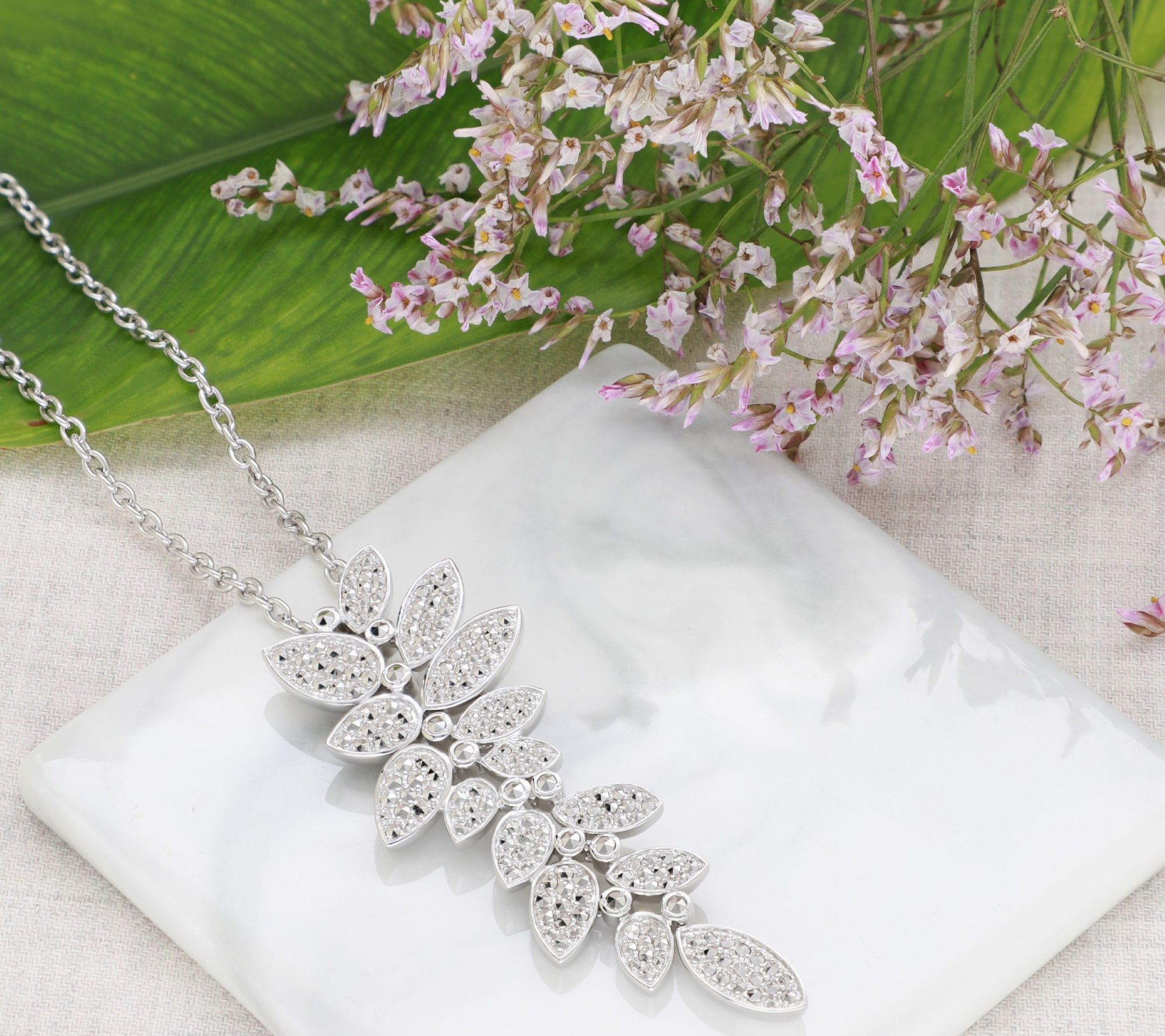 Vine design with round-cut, pave-set marcasite stones; oval-link chain
