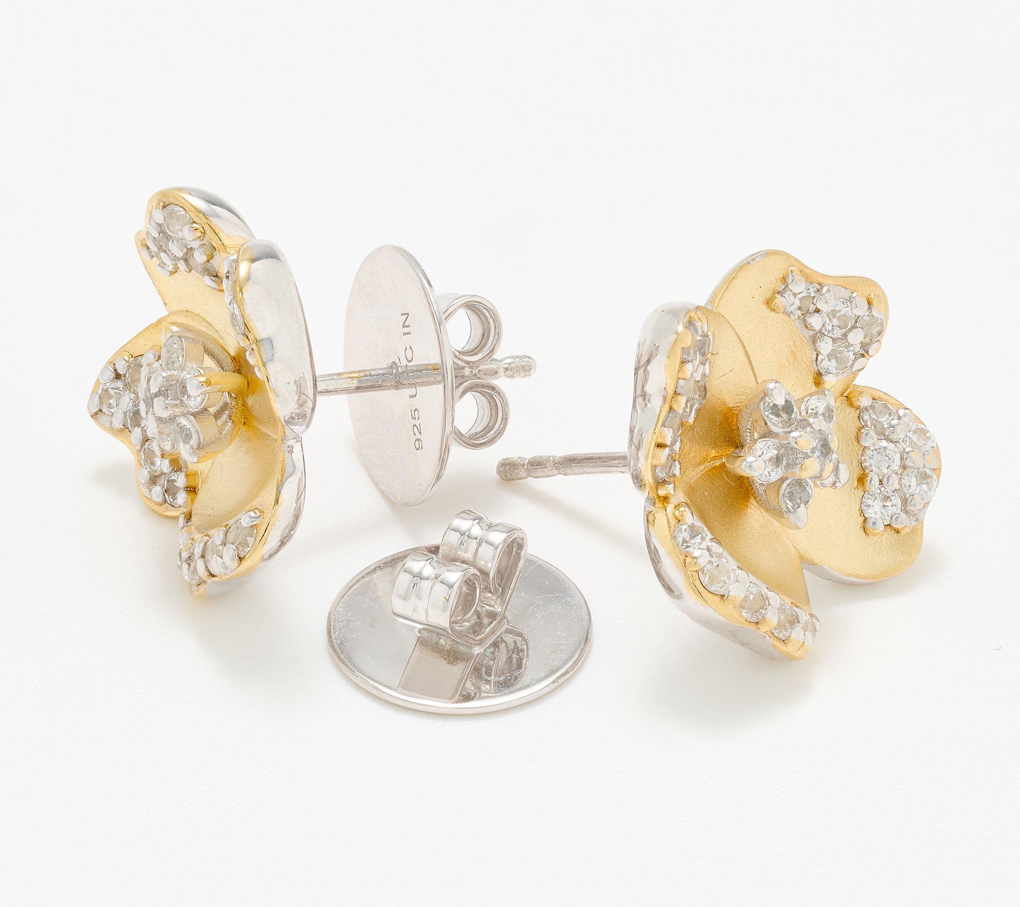 • Motif stud design; white topaz and pave-set white zircon gemstones