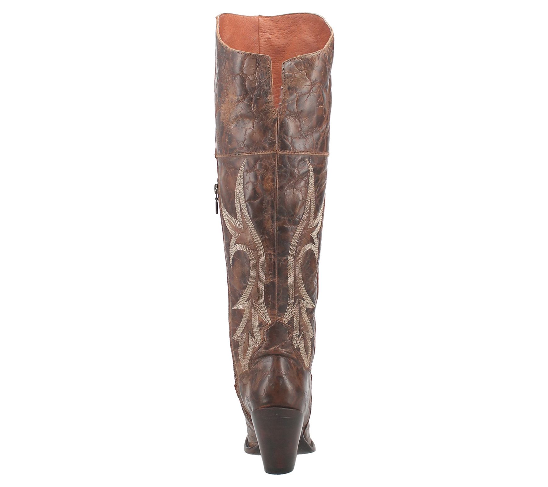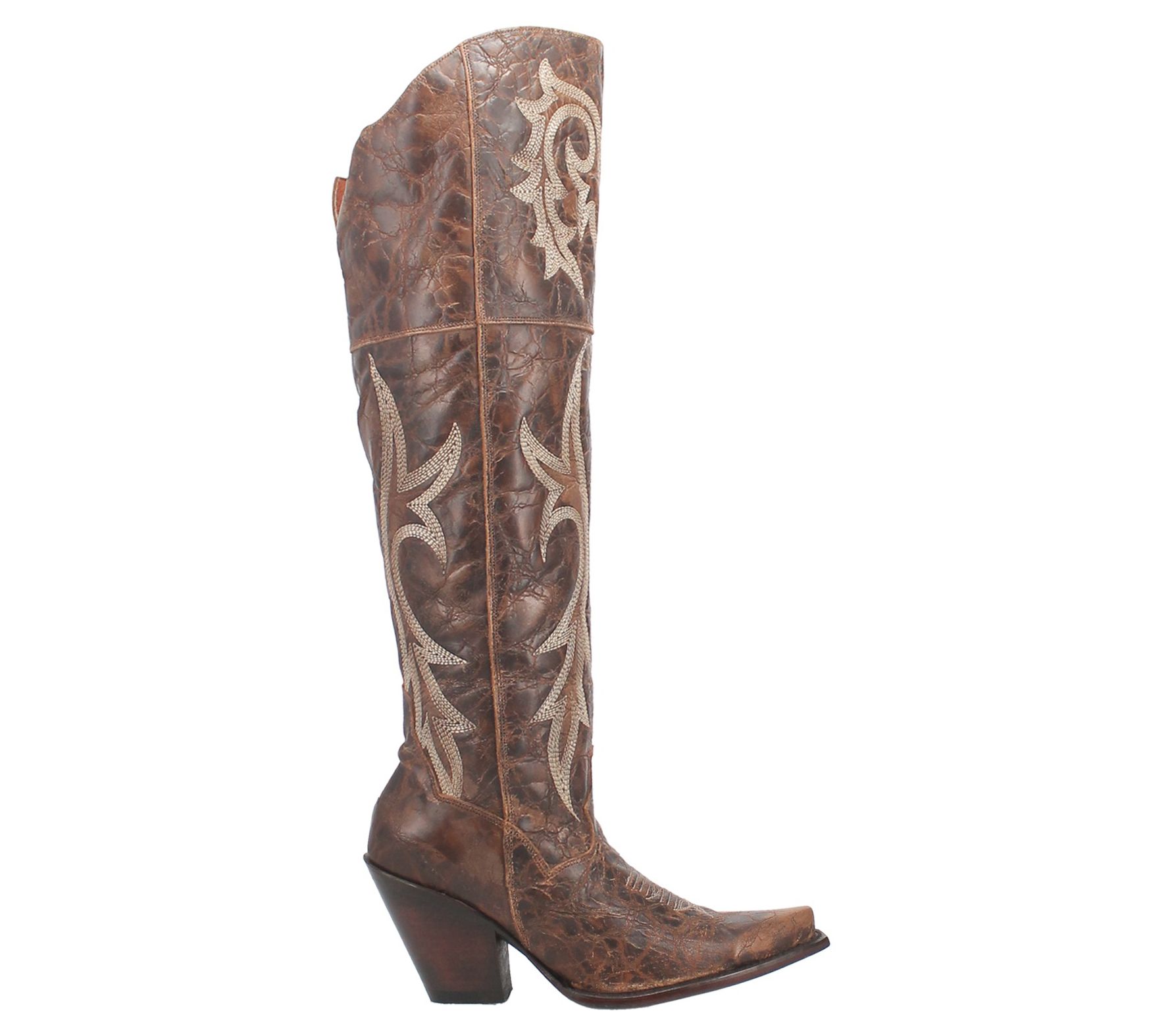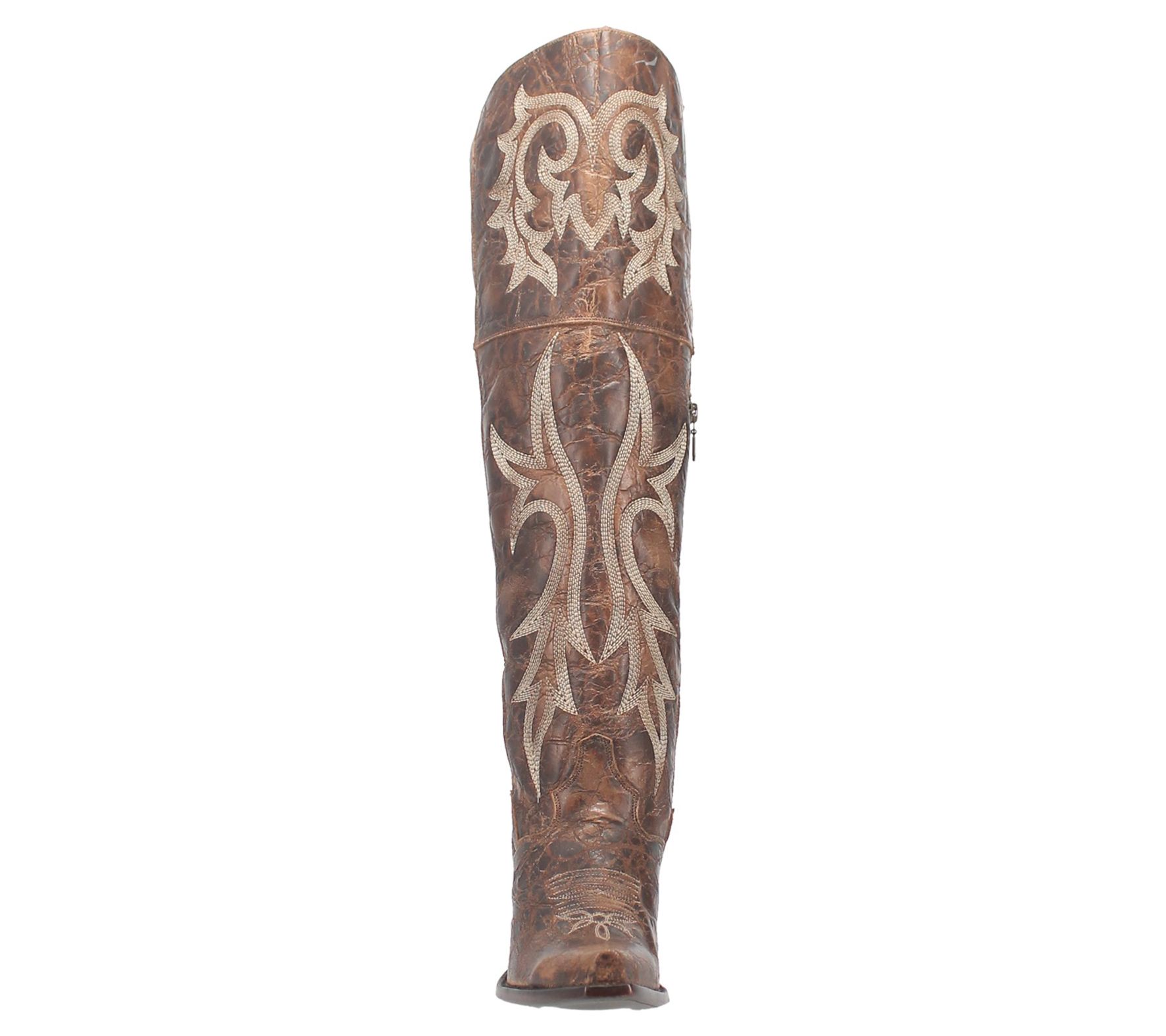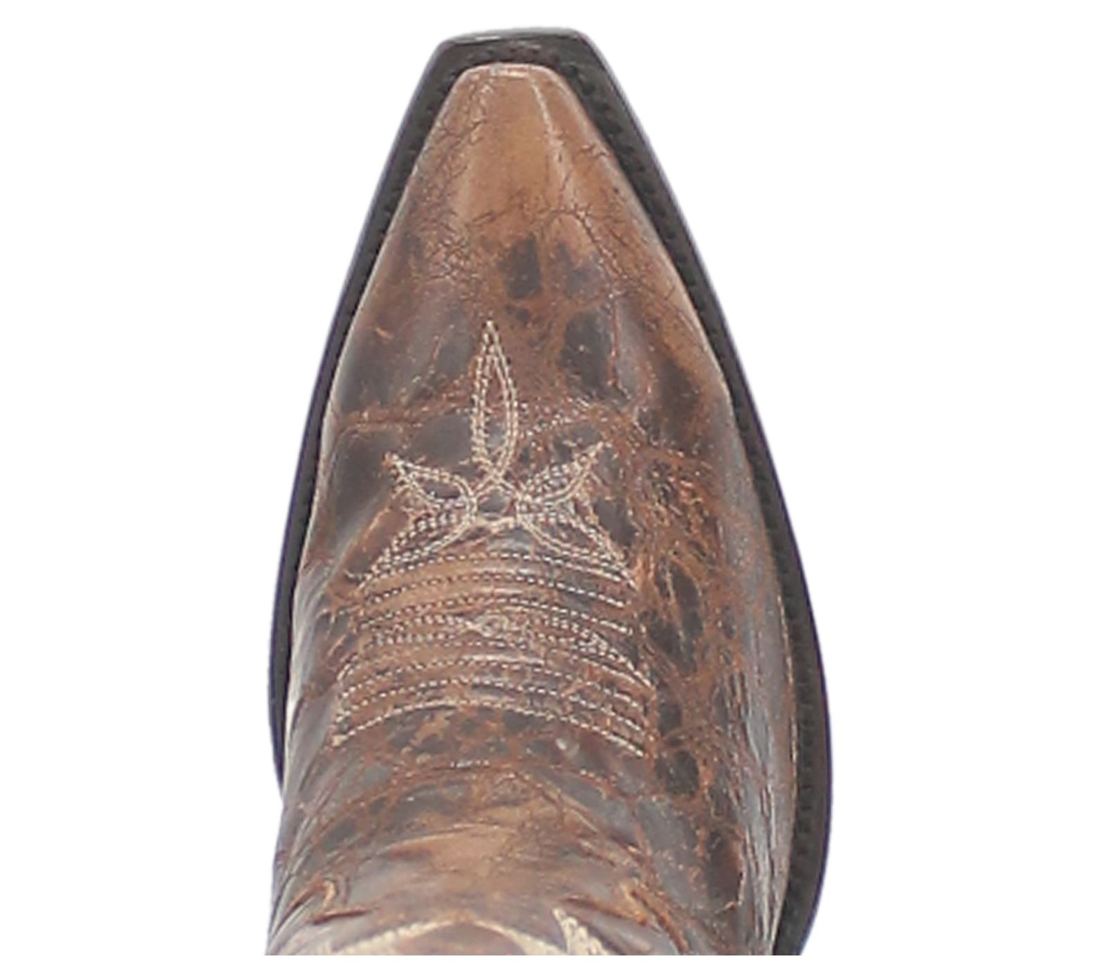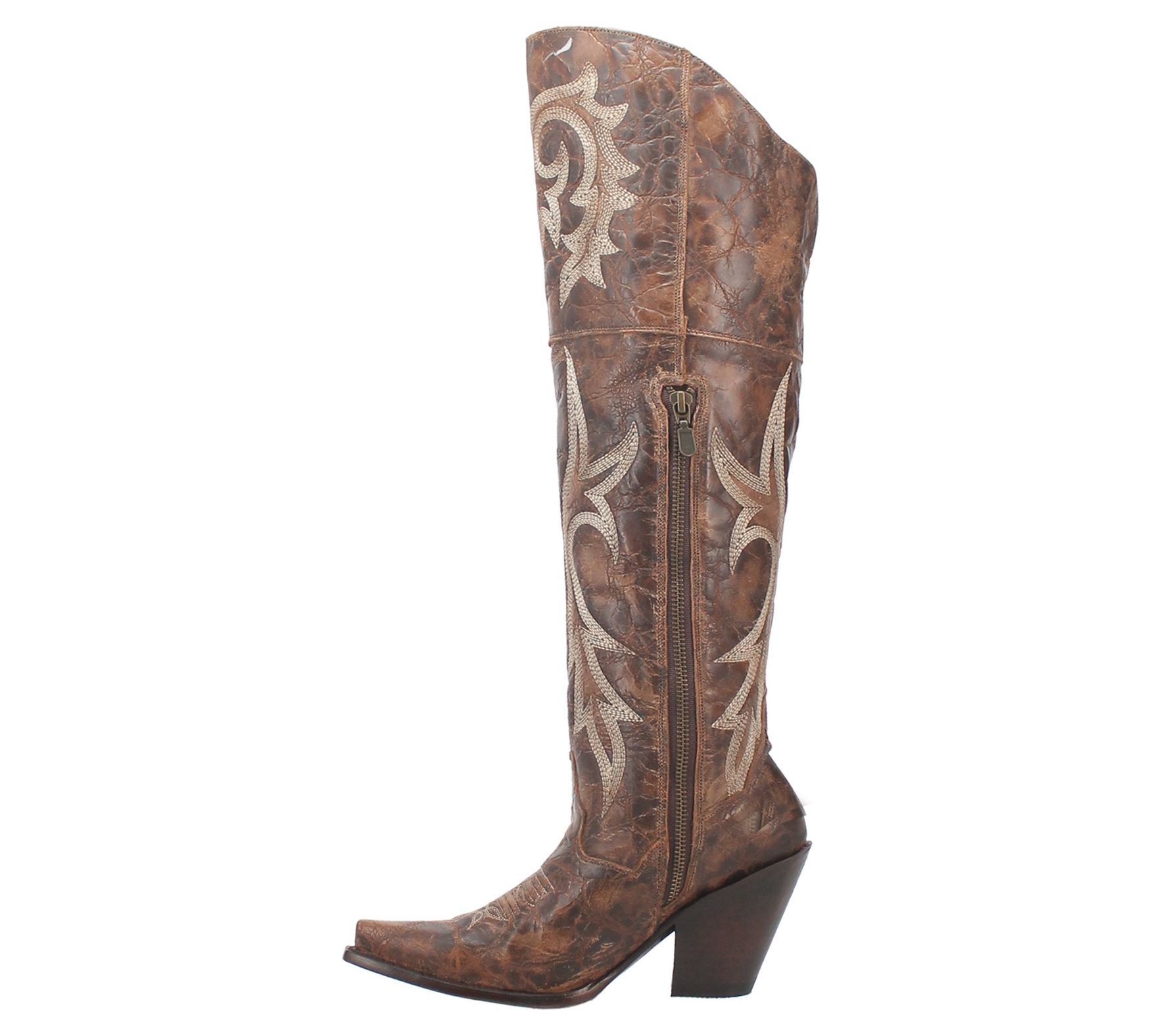 - Side zip closure, Western stitching, distressed finish, snip toe