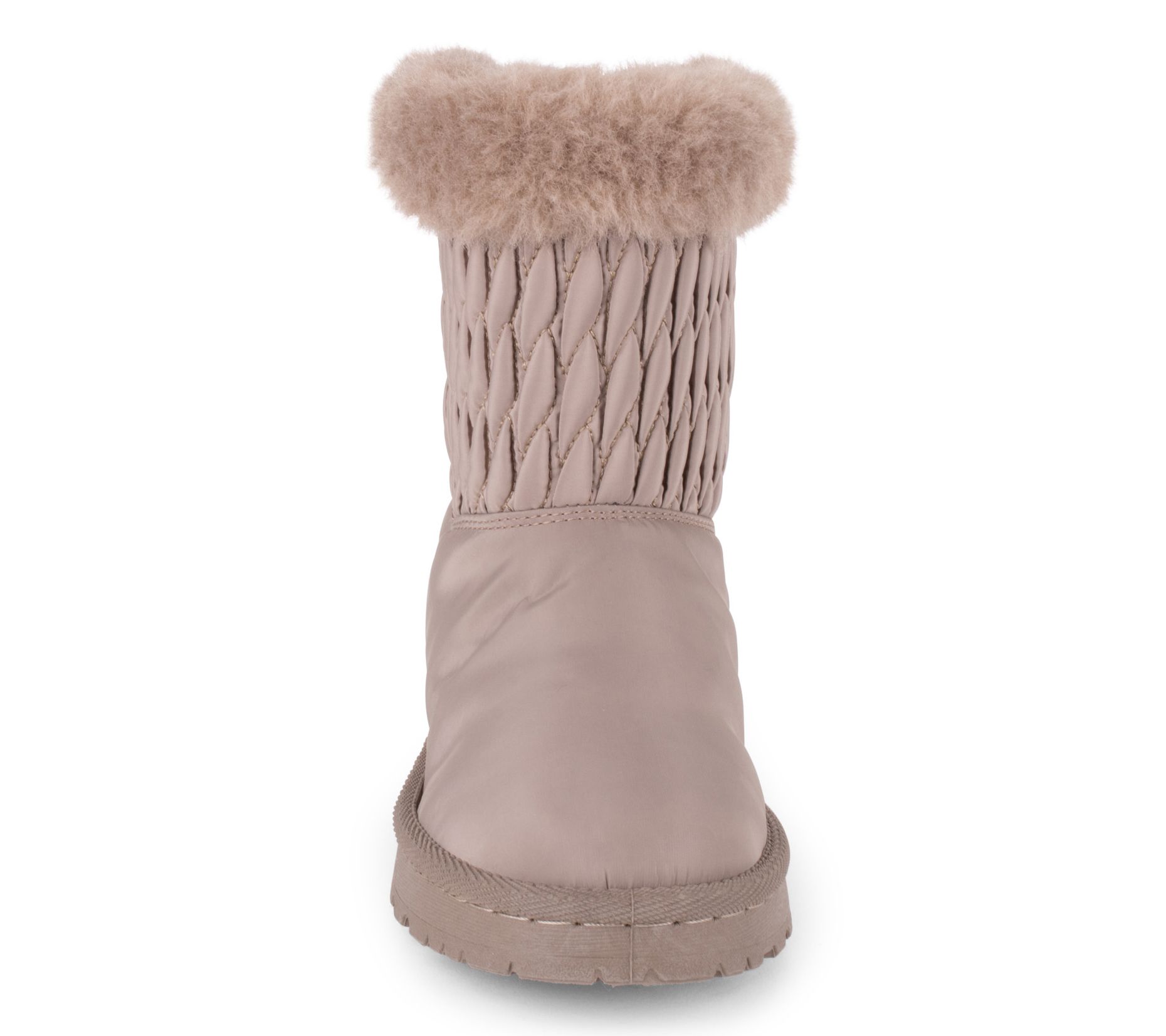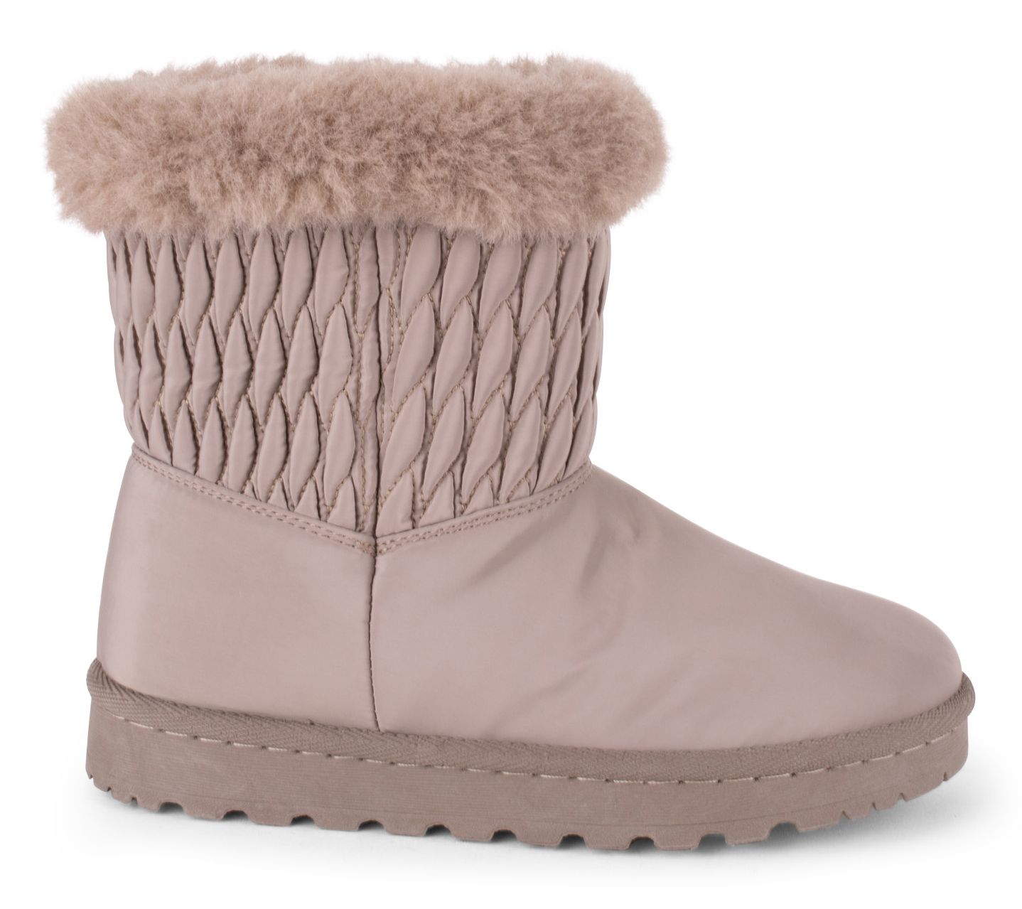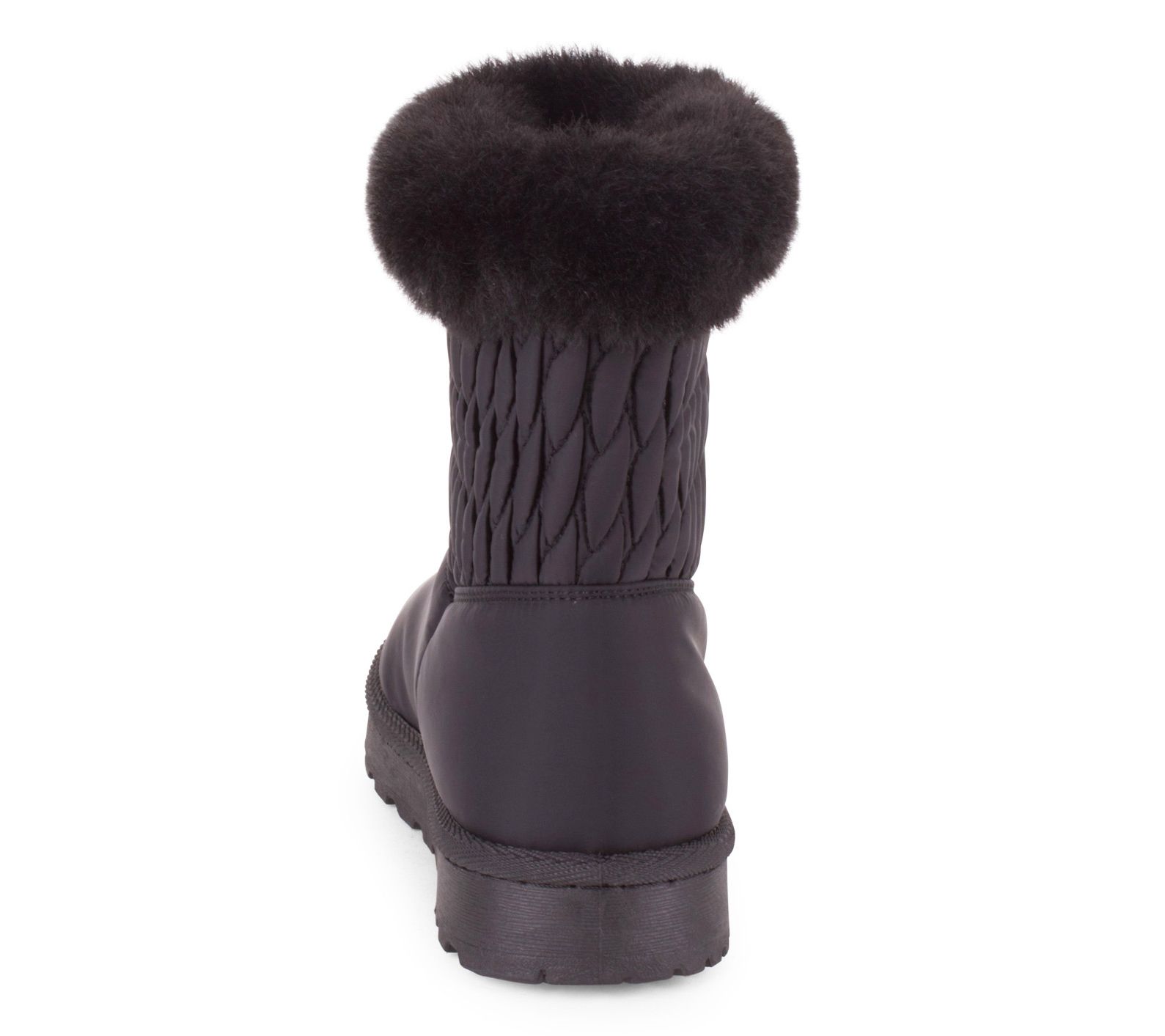 • Nylon quilted upper, foldover faux-fur trim, slip-on style