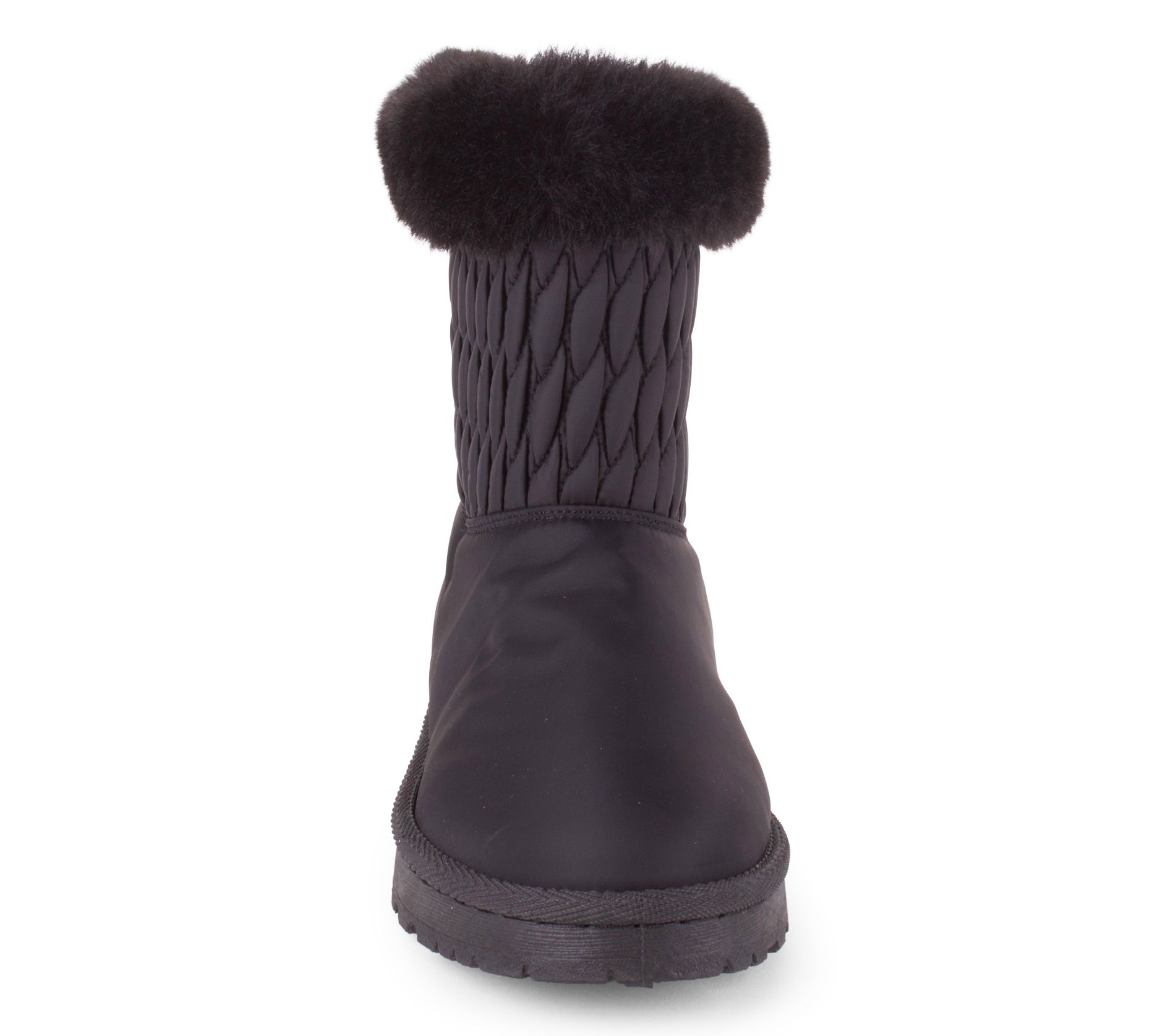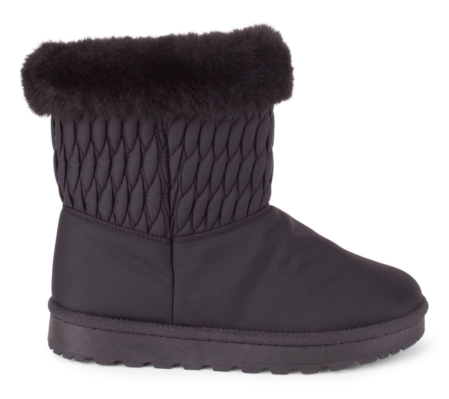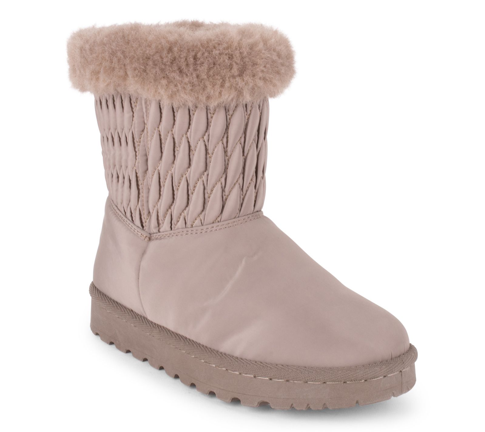 • Nylon quilted upper, foldover faux-fur trim, slip-on style