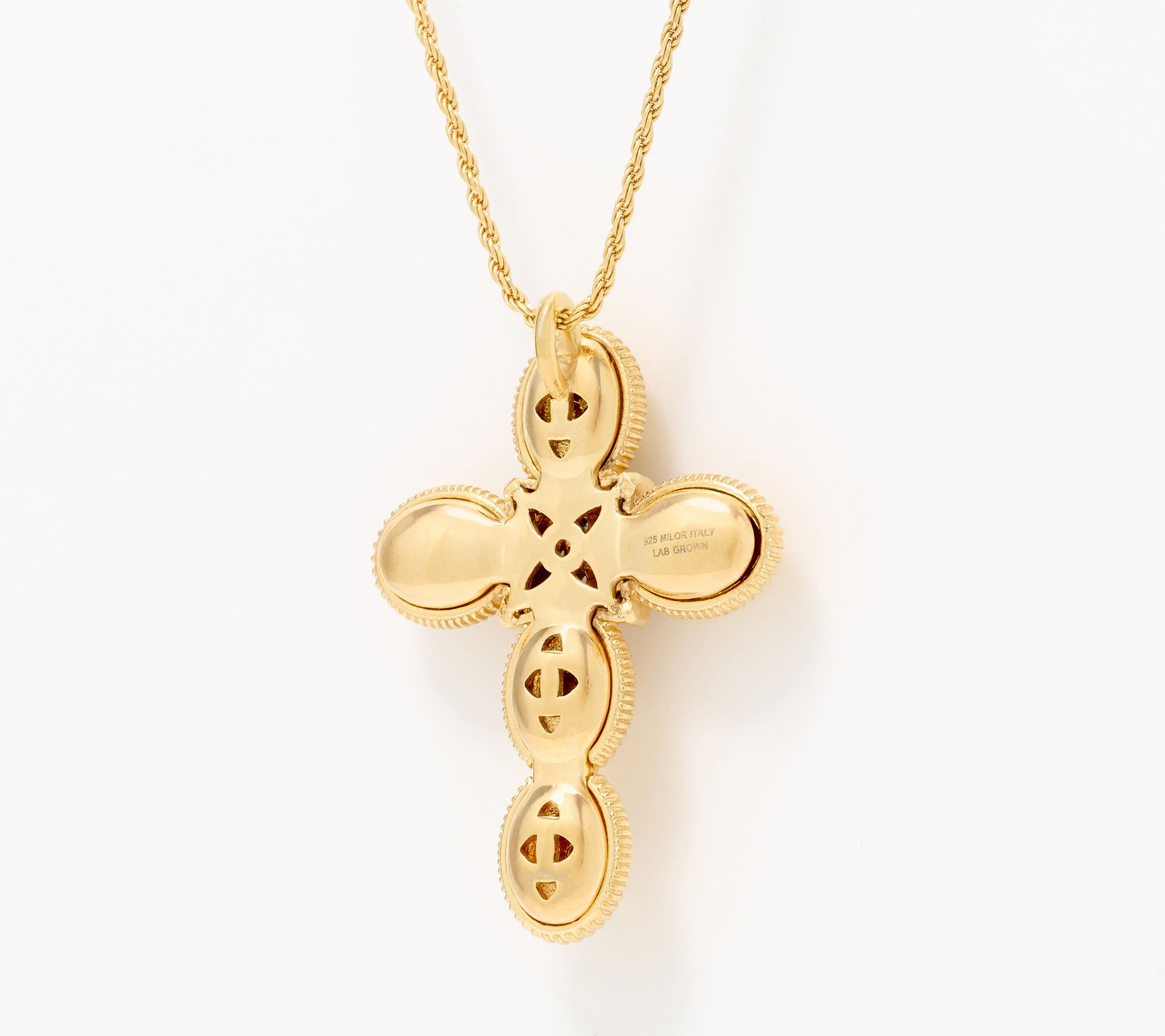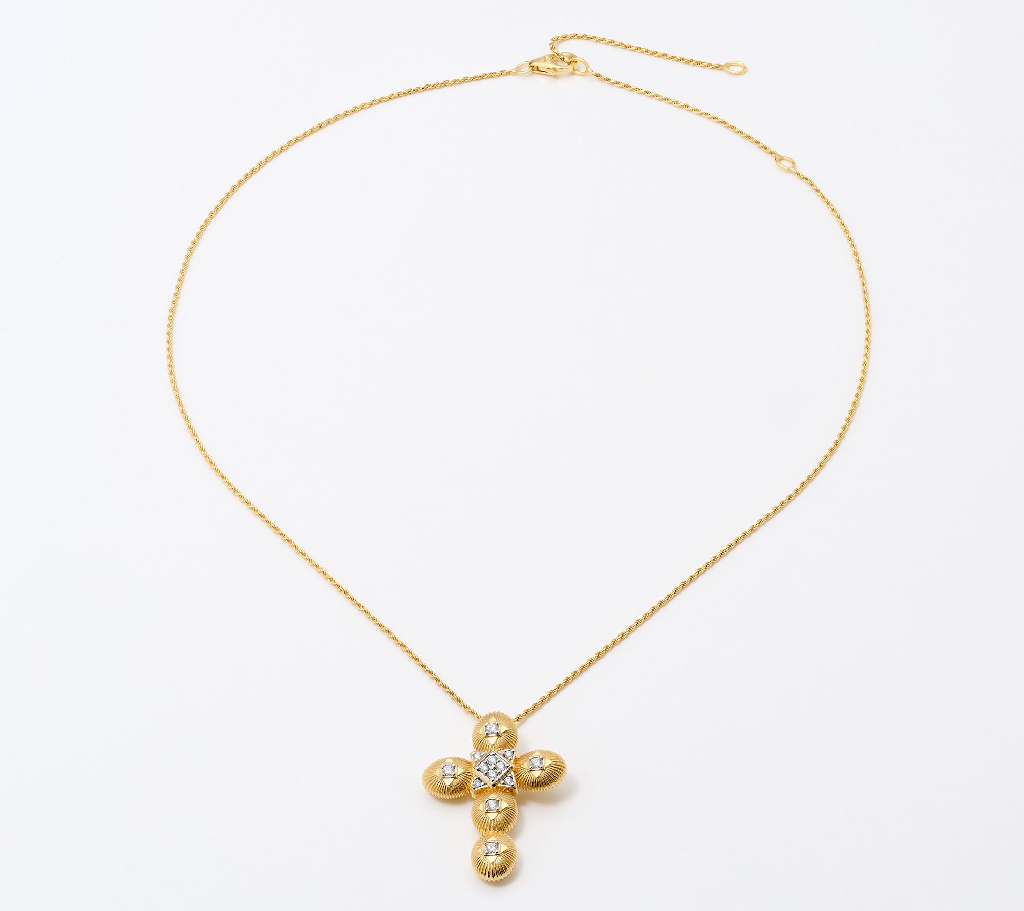 Sliding cross pendant with sunray design on mini rope chain; lab grown diamonds; polished finish; pendant is fixed