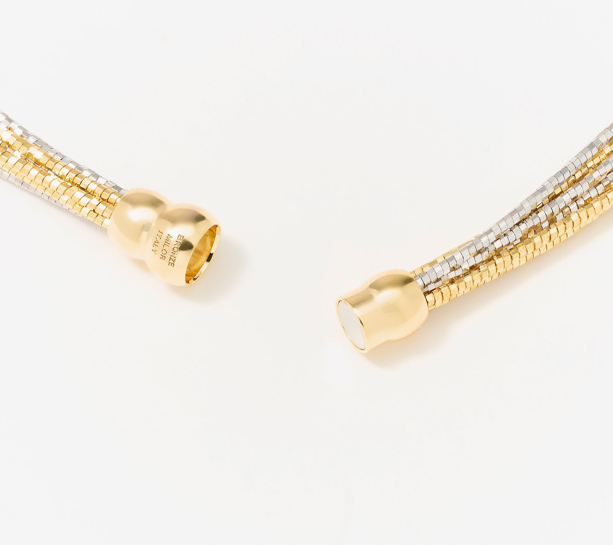 A sleek accent for office days or special evenings out, this seven-strand omega necklace stands out with its diamond-cut finish and substantial, multi-strand design. The magnetic closure offers quick and secure styling, while each shimmering bronze strand brings added drama to your neckline. From David Markstein.