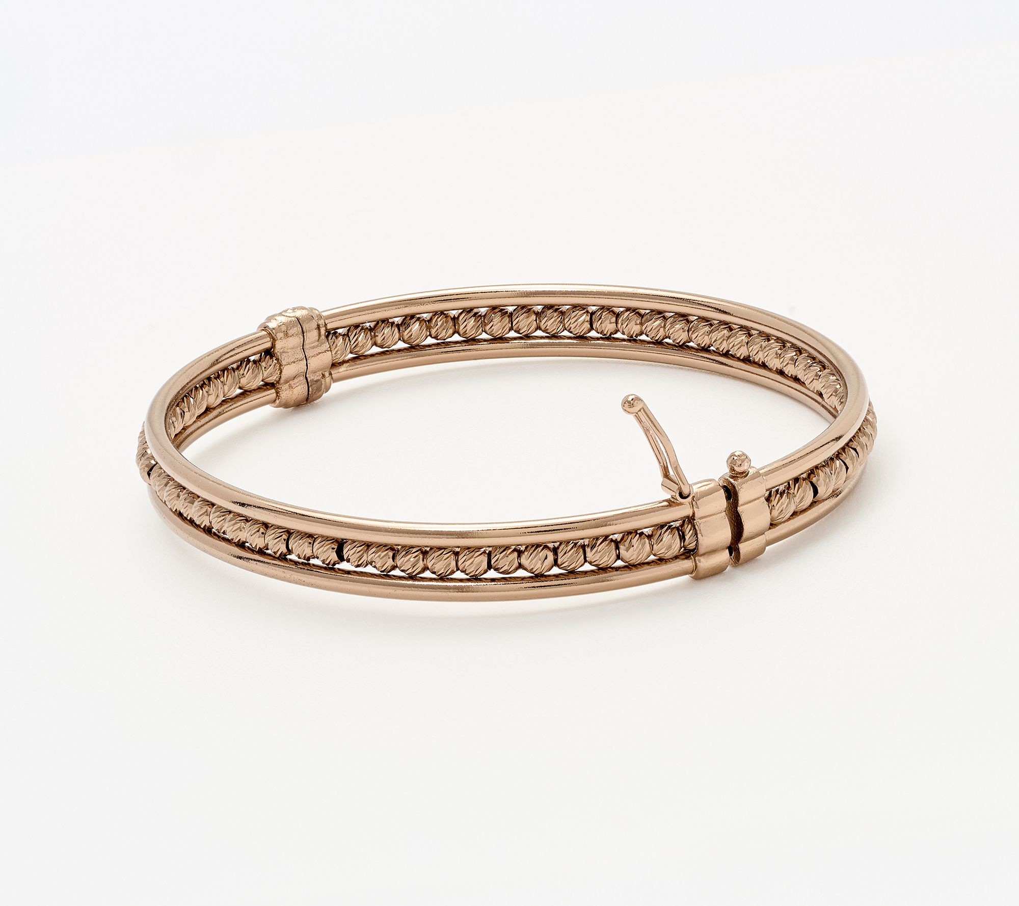 Sparkle with confidence as this bronze beaded bangle catches the light with every gesture, showcasing a center row of diamond-cut beads accented by polished edges. The secure snap hinge closure means it stays comfortably in place, whether layered for brunch or worn solo at evening events. From David Markstein.