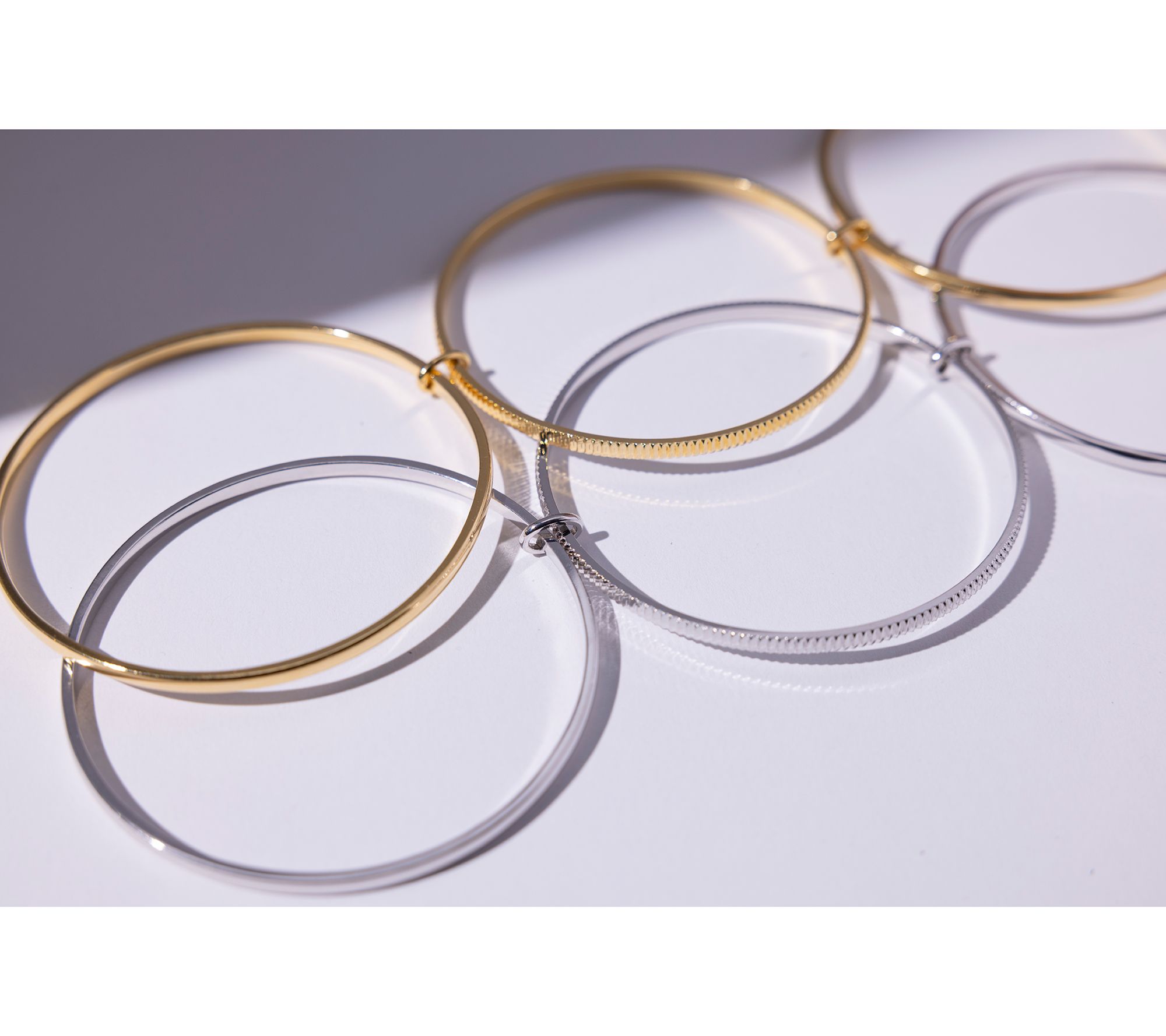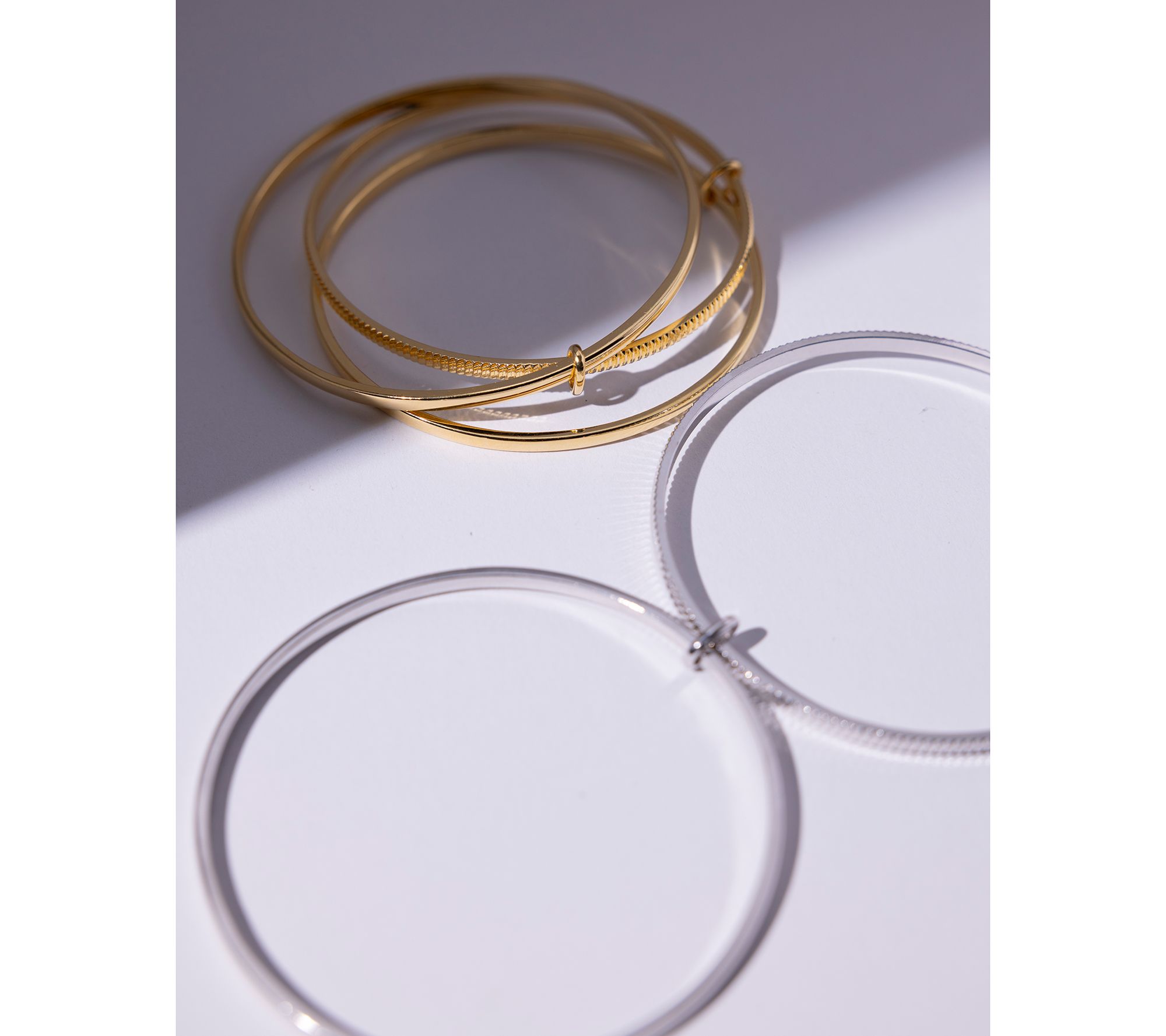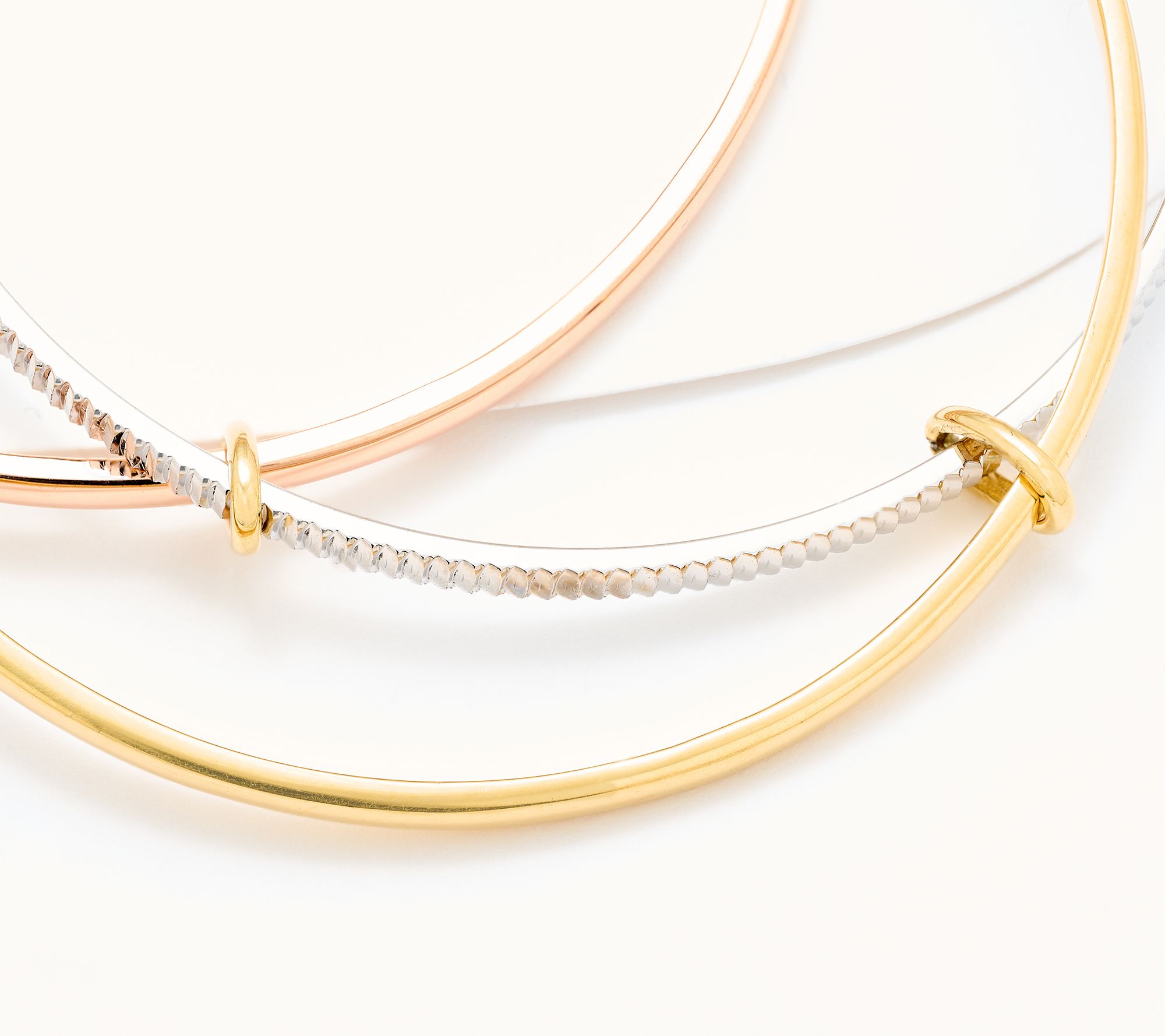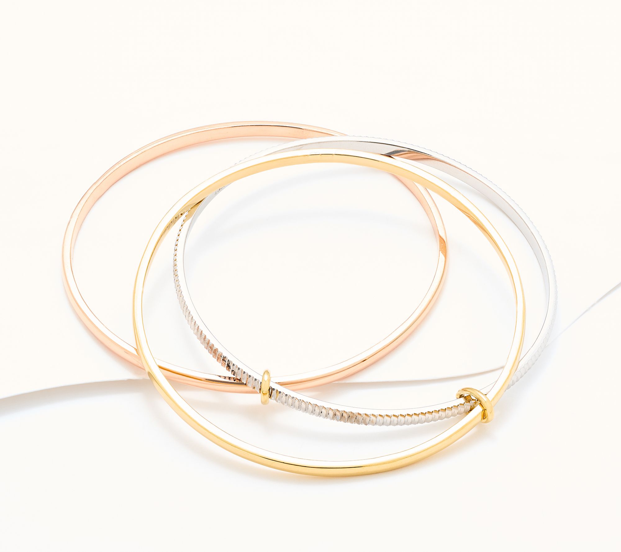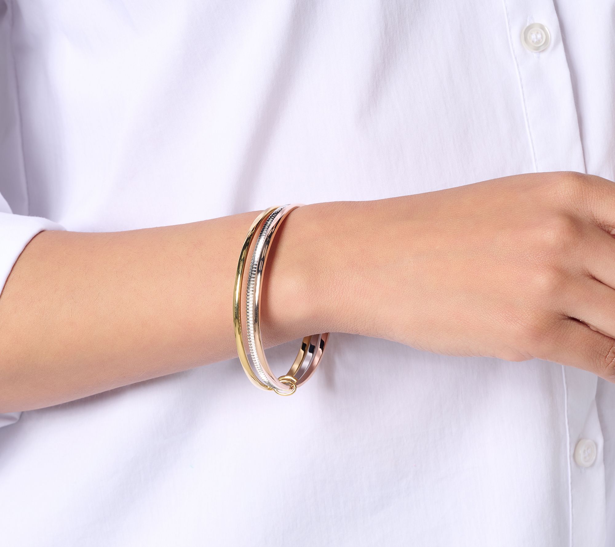 Slip on this interlocking triple bangle for everyday elegance, whether you're heading out for coffee or adding a refined touch to evening wear. The gleaming bands boast polished and diamond-cut finishes, designed to catch the light and complement both casual and formal looks. From David Markstein.