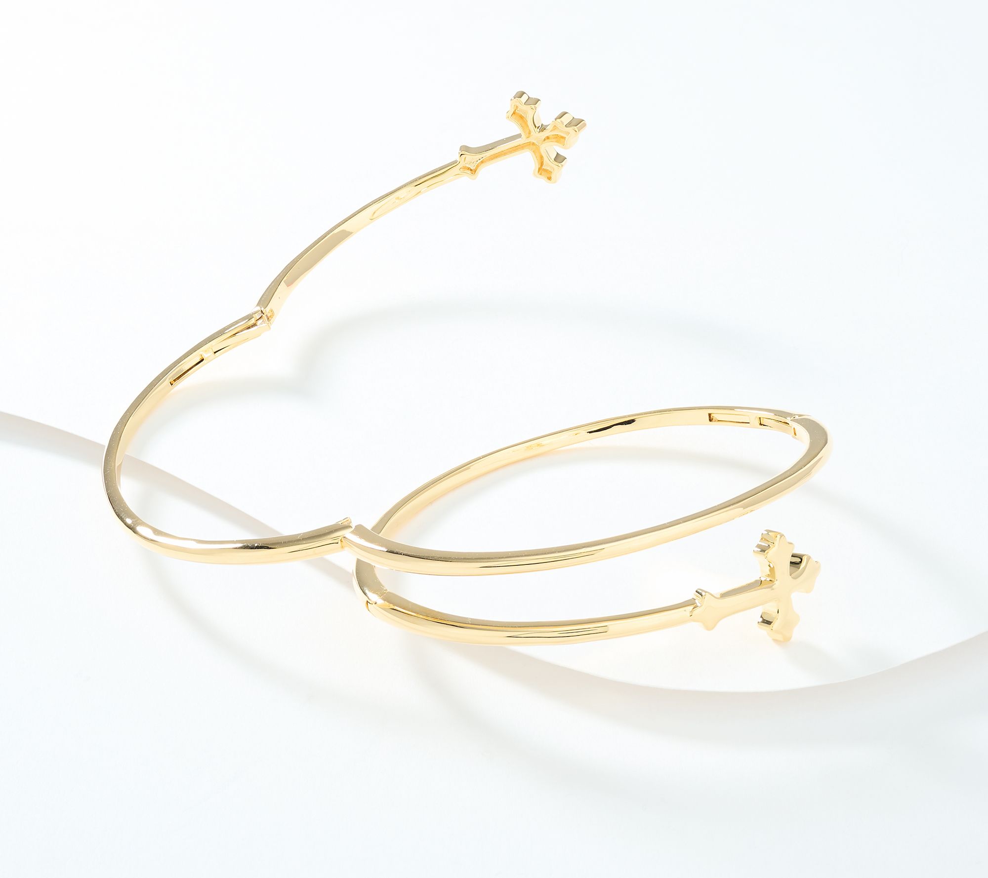 Eye-catching and meaningful, this cross bangle brings a polished shine and expressive style to your wrist -- perfect for pairing with your go-to bracelets or wearing solo for a statement of faith. The hinged design provides comfort and flexibility for all-day wear, while the bold cross accents add a chic modern twist to any ensemble. From David Markstein.