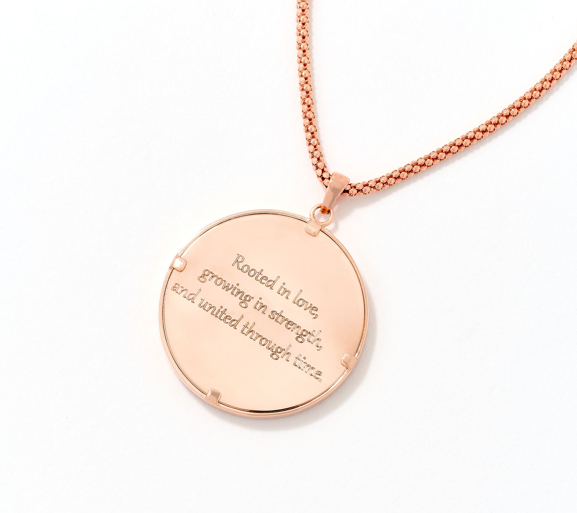 • Tree of Life design; mother-of-pearl background; white topaz accents; beaded frame; inspirational phrase engraved on reverse; polished finish