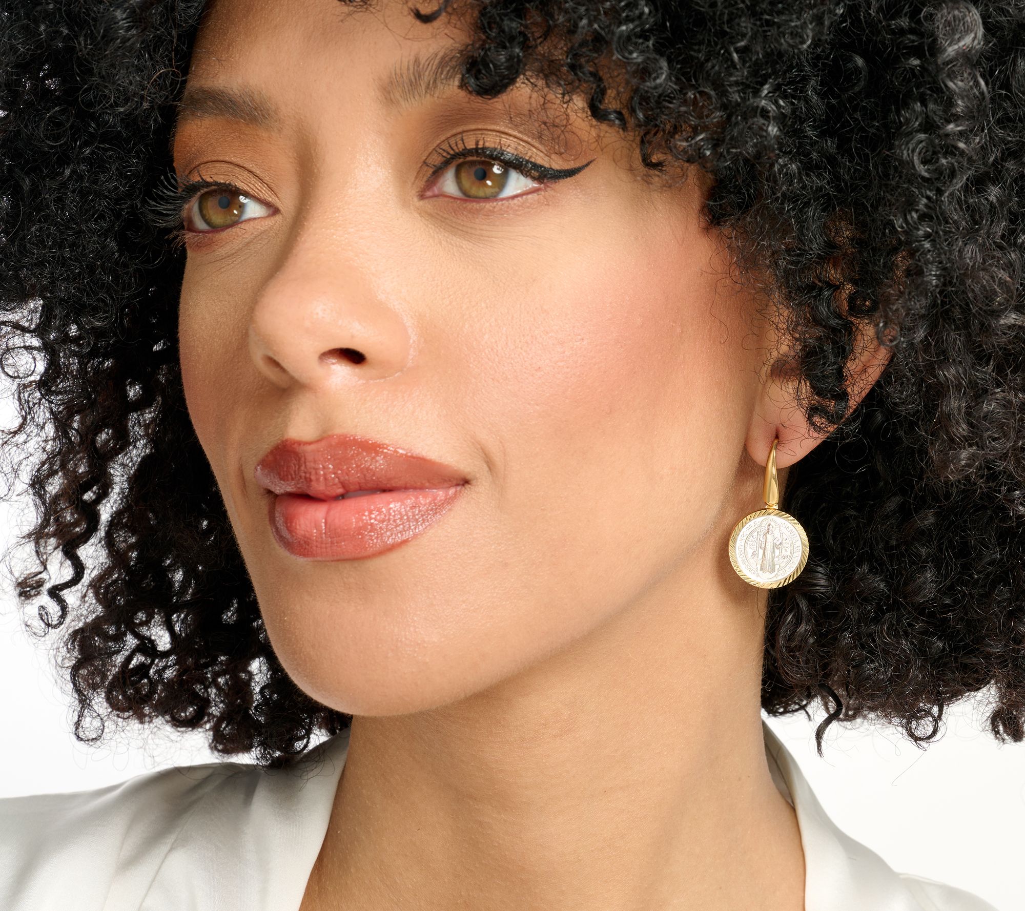 Feel closer to your faith with these San Benito medallion earrings. A bold depiction of the beloved saint who emphasized prayer, work, and community, each medallion is beautifully framed with diamond-cut accents. From David Markstein.