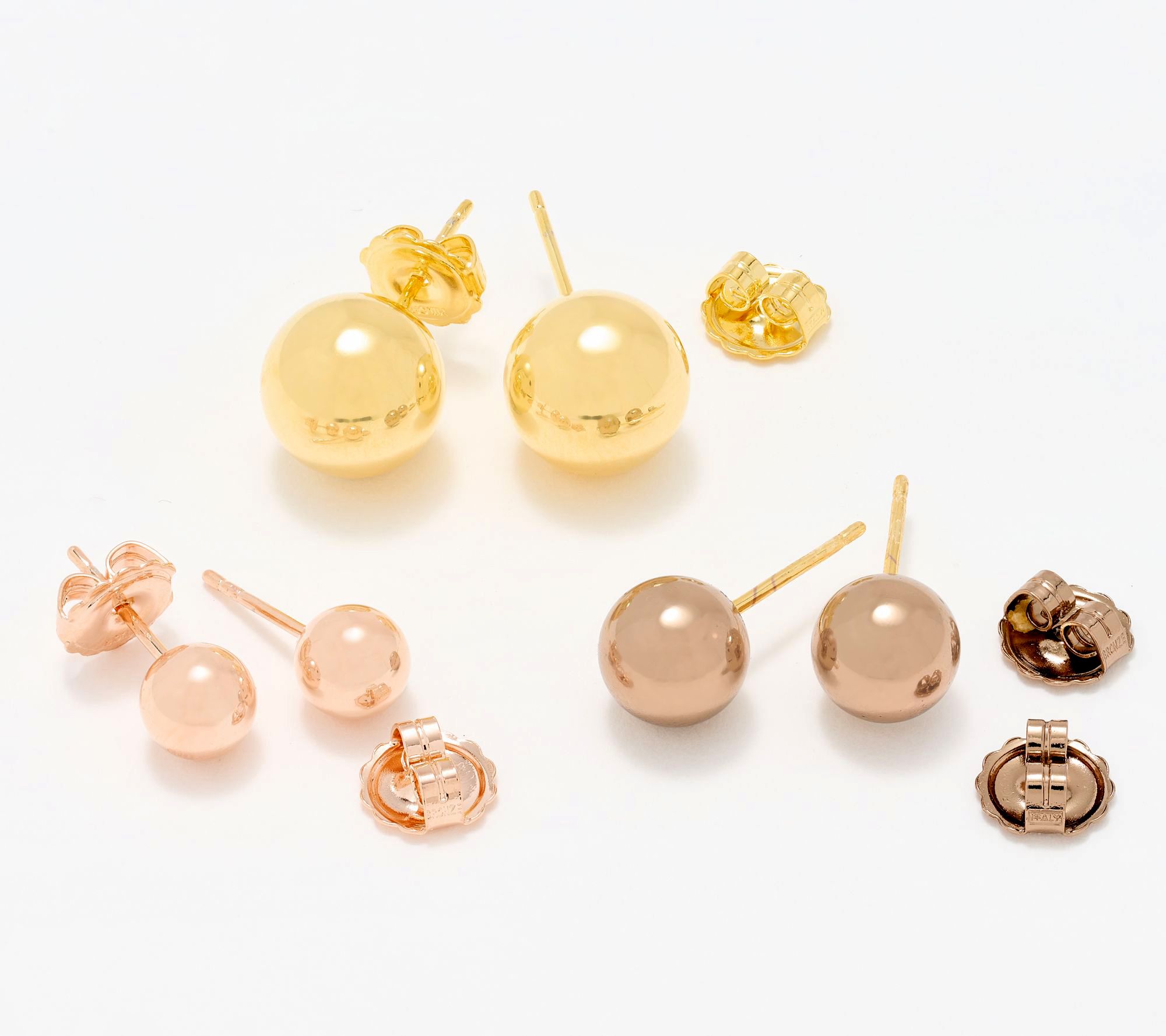Includes three pairs of ball stud earrings: one pair each in 6mm, 8mm, and 10mm sizes