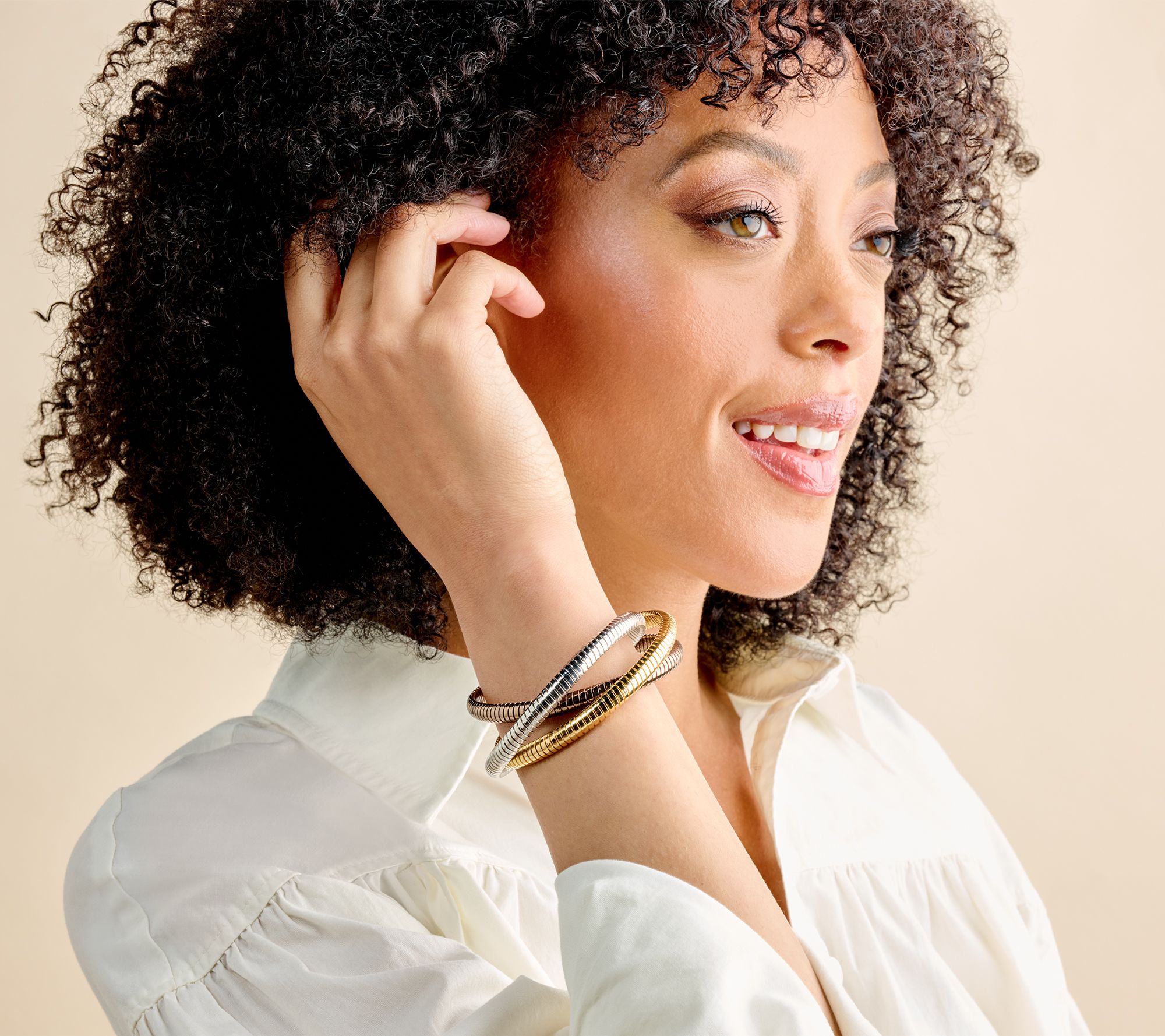Fresh from the Vicenza Fair, this bronze tubogas bracelet from David Markstein combines classic Italian craftsmanship with a contemporary aesthetic. Three polished strands intertwine into a one-and-done layered look with a seamless, rounded surface that allows it to glide on easily. Slip it on and see for yourself -- the smooth flexible fit requires no fumbling with a clasp!