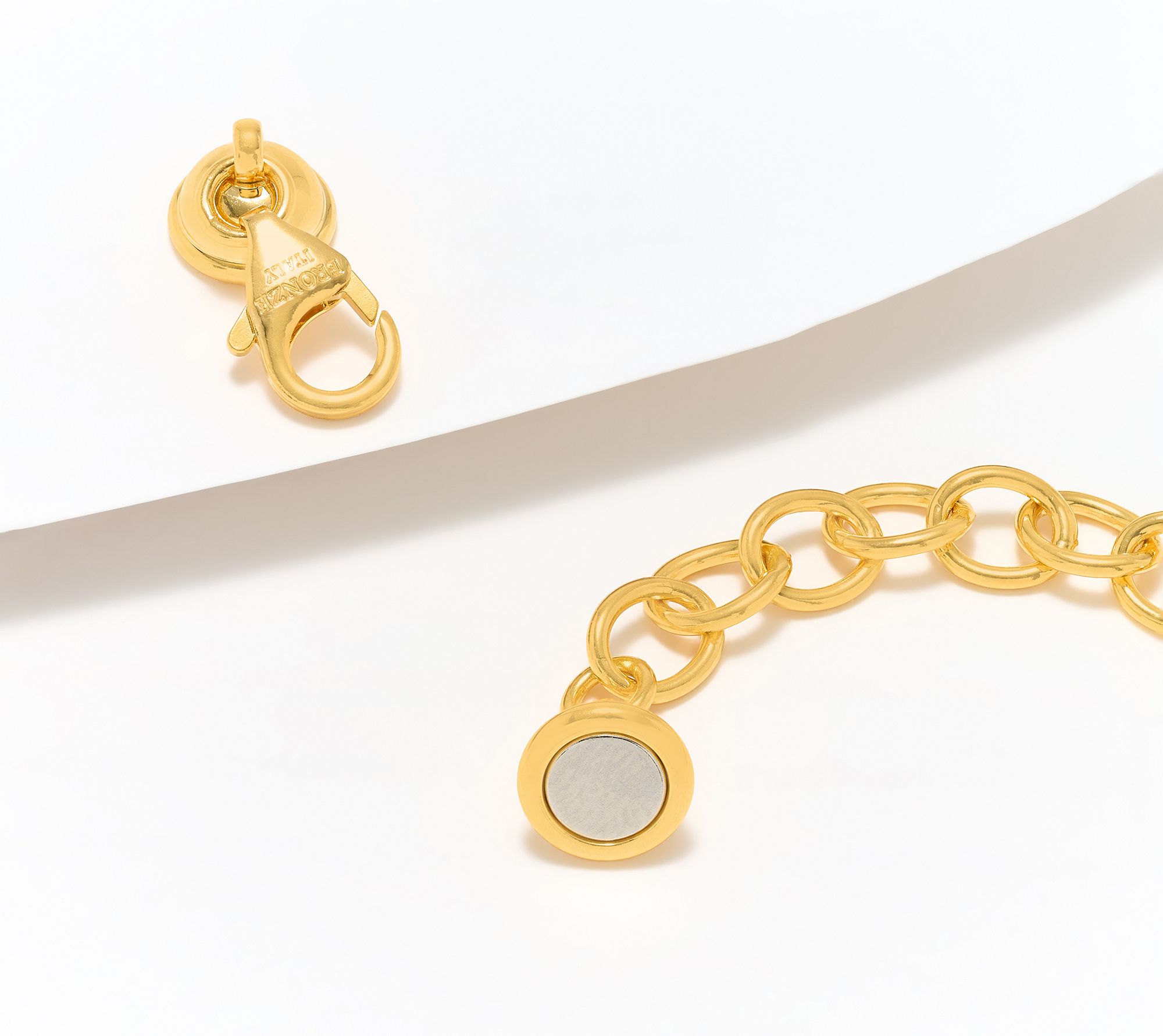 • Oval-link chain extender with magnetic bead clasp; lobster claw closure at one end; polished finish