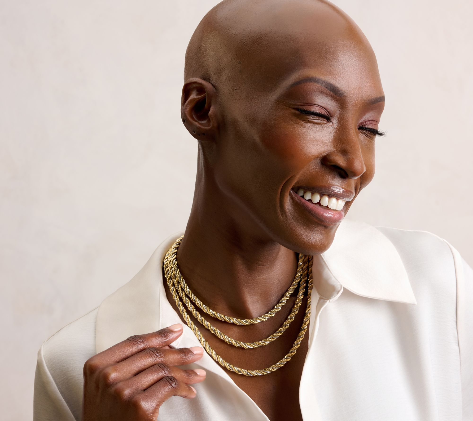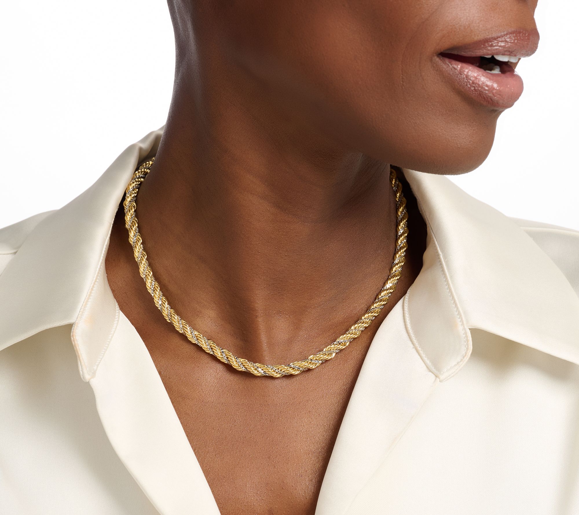 Two-Tone Yellow/Silver: rope chain in 18K yellow gold-plated bronze; box chain in rhodium-plated bronze