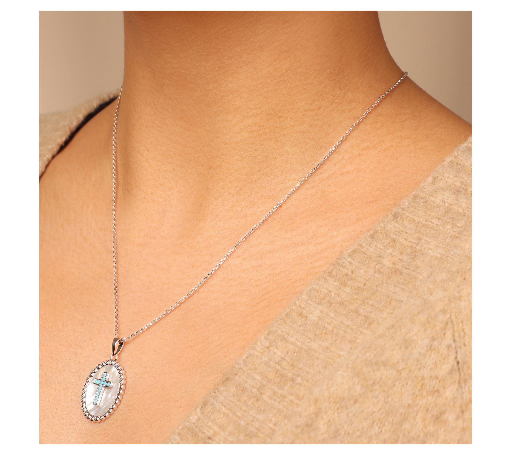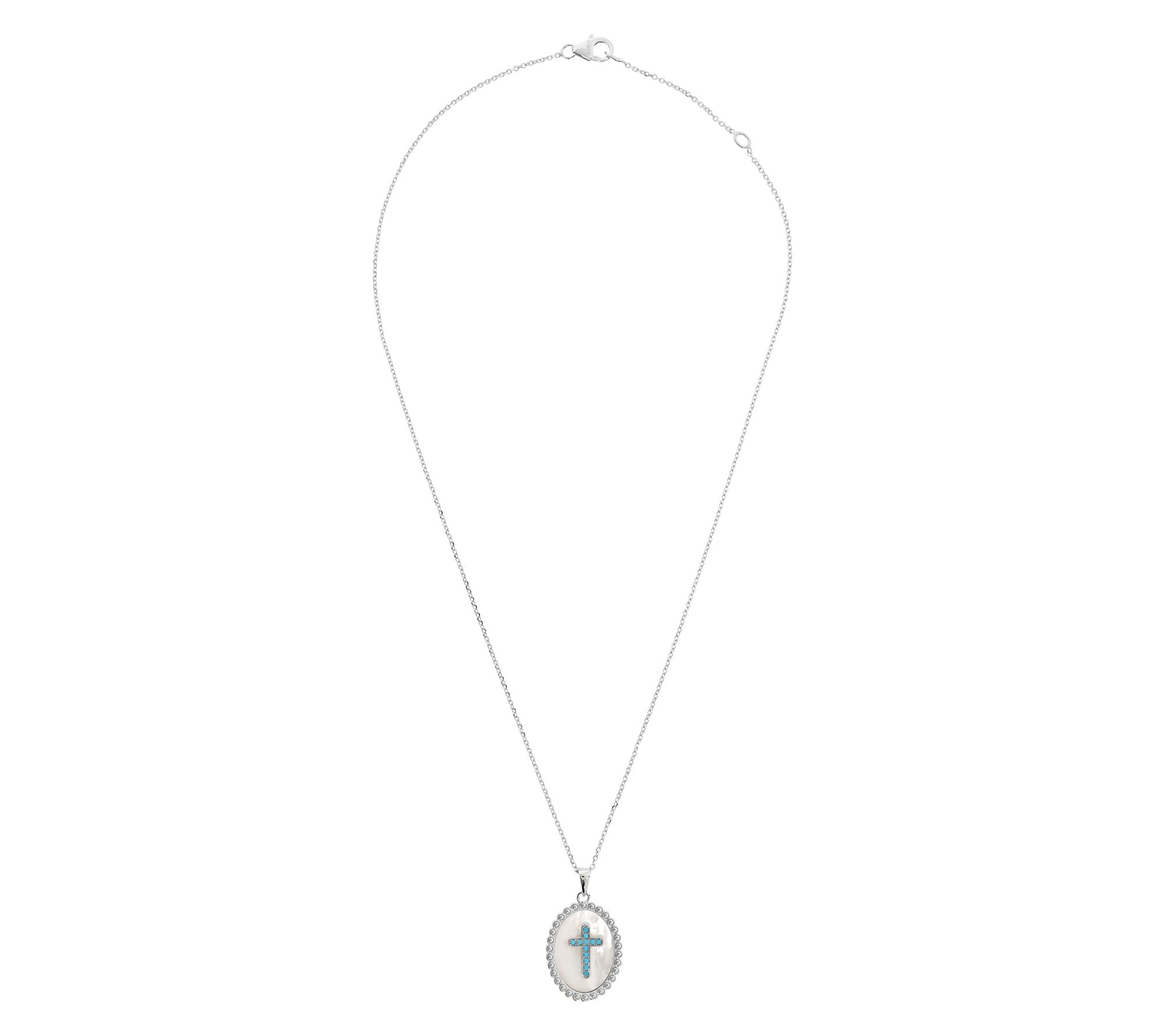 Shell gemstone with inner cross design; turquoise gemstone accent; oval bezel setting; oval link chain
