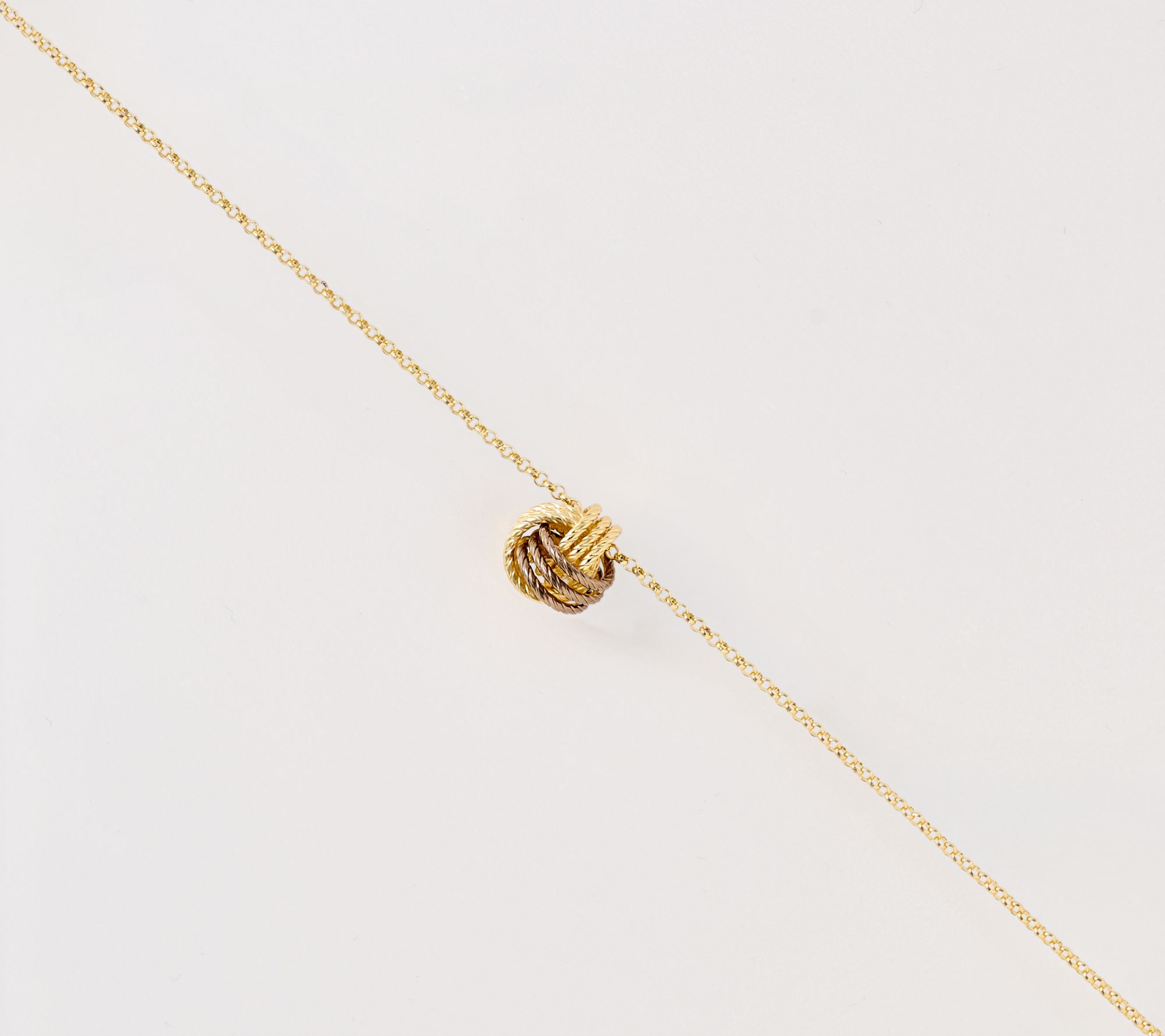 • Textured love knot slide pendant; rolo chain; pendant is not removable; polished finish