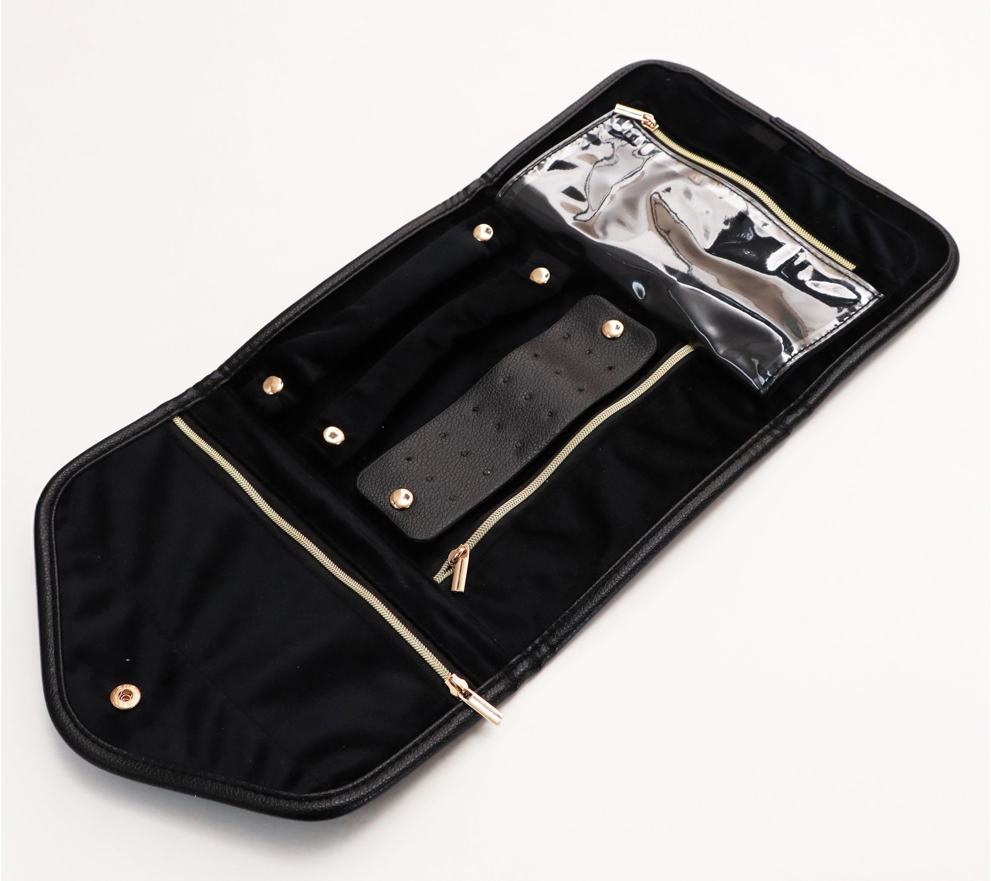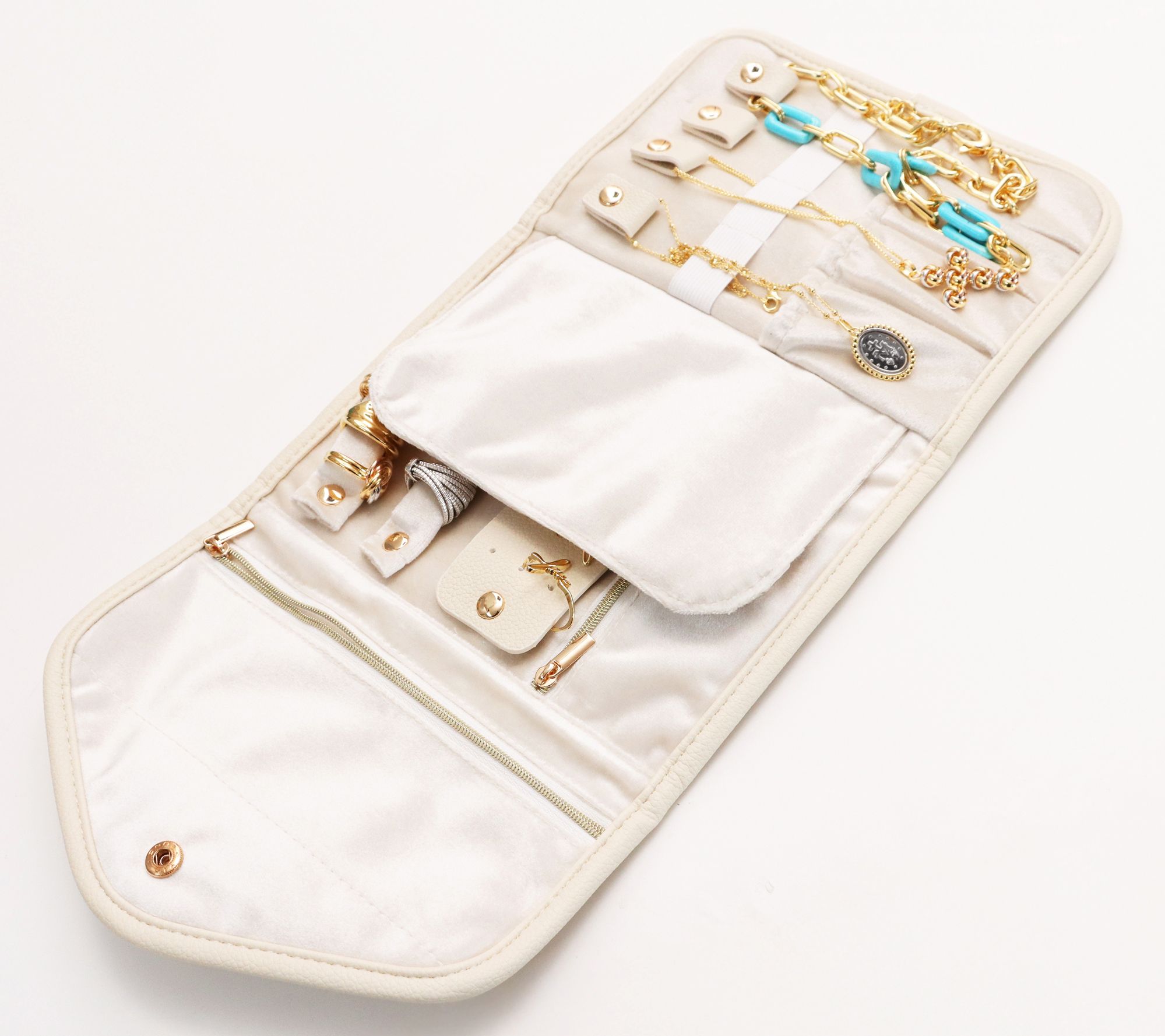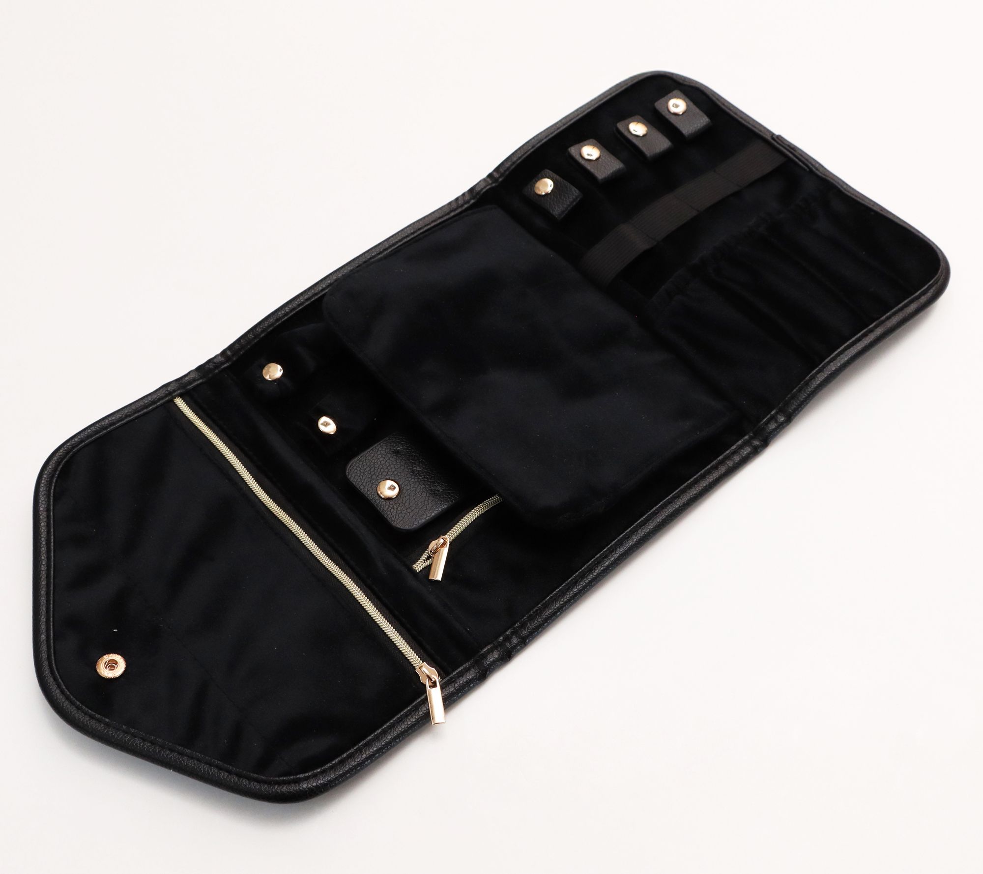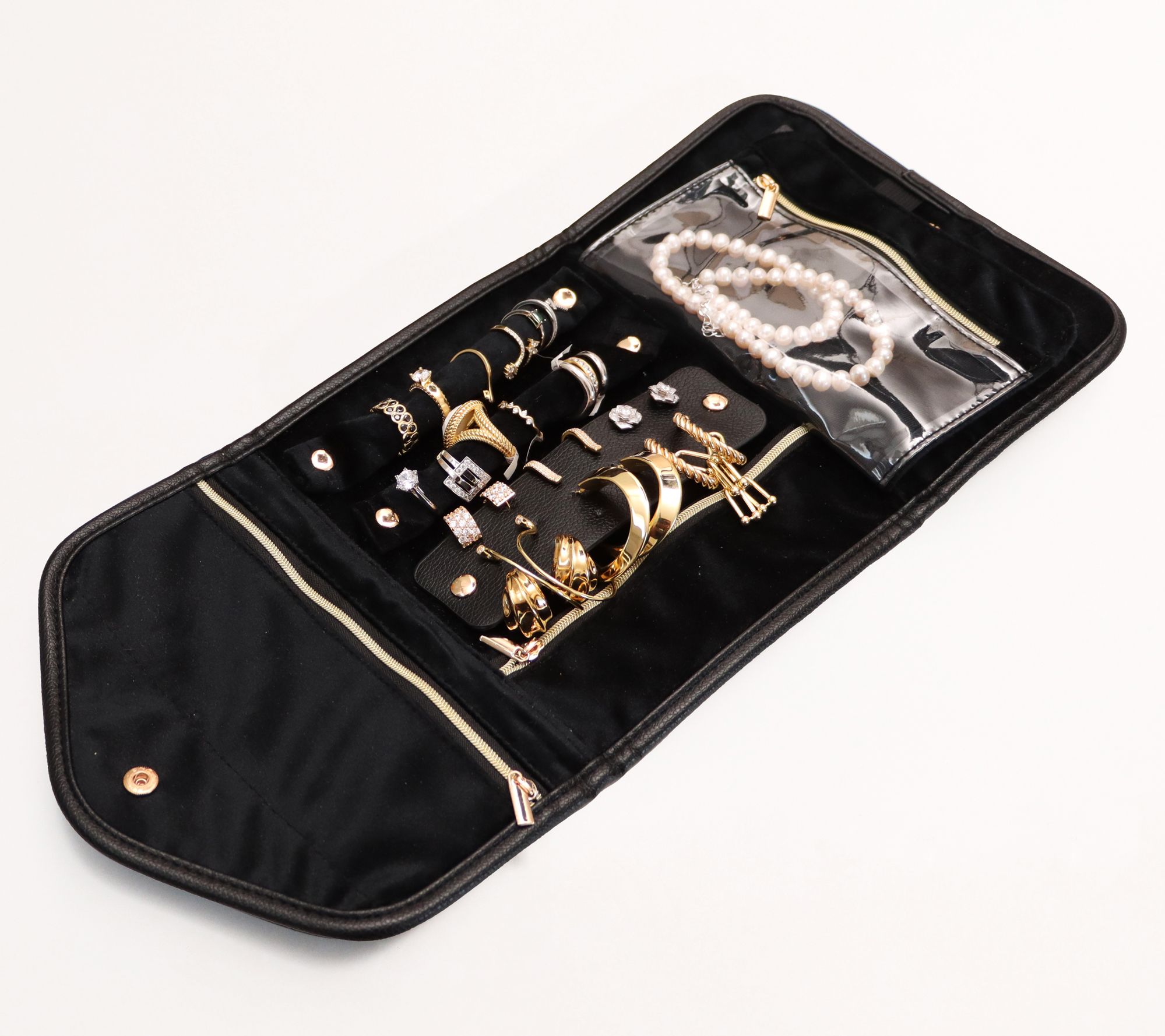 Jetting off on a weekend getaway or heading to a special event, keeping your favorite jewelry organized and protected is a breeze with this sleek travel roll. The supple leather exterior and soft velvety lining add both style and peace of mind. Luxe goldtone details make it feel like a treat every time you unroll it. From David Markstein.