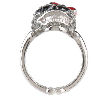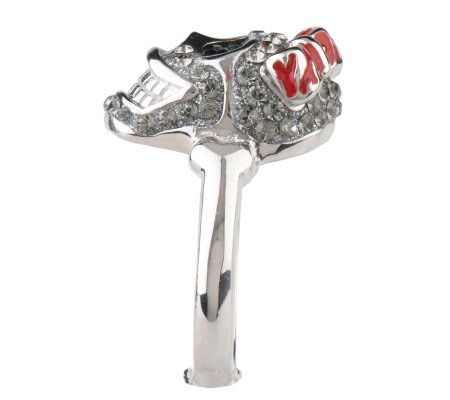 Grin and bear it. Crafted from sterling silver, this happy skull ring sparkles with round gray and black Swarovski crystals. A black epoxy enamel nose and a bow accented with red epoxy enamel complete the cheerfully haunted design. From David Sigal.