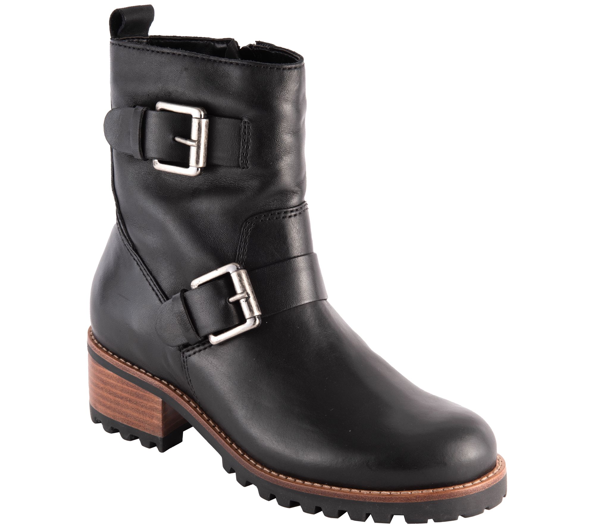 • Side zipper, straps with buckles, back pull tab, water-friendly design, lugged sole, stacked heel, rounded toe