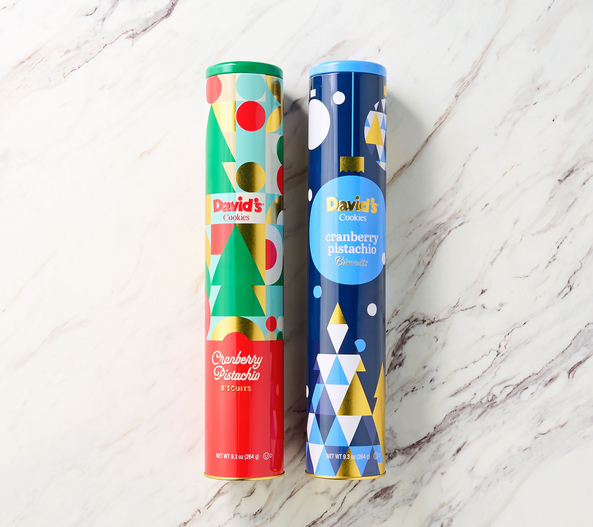 • Includes two 22-count embossed holiday tins of cranberry pistachio cookies