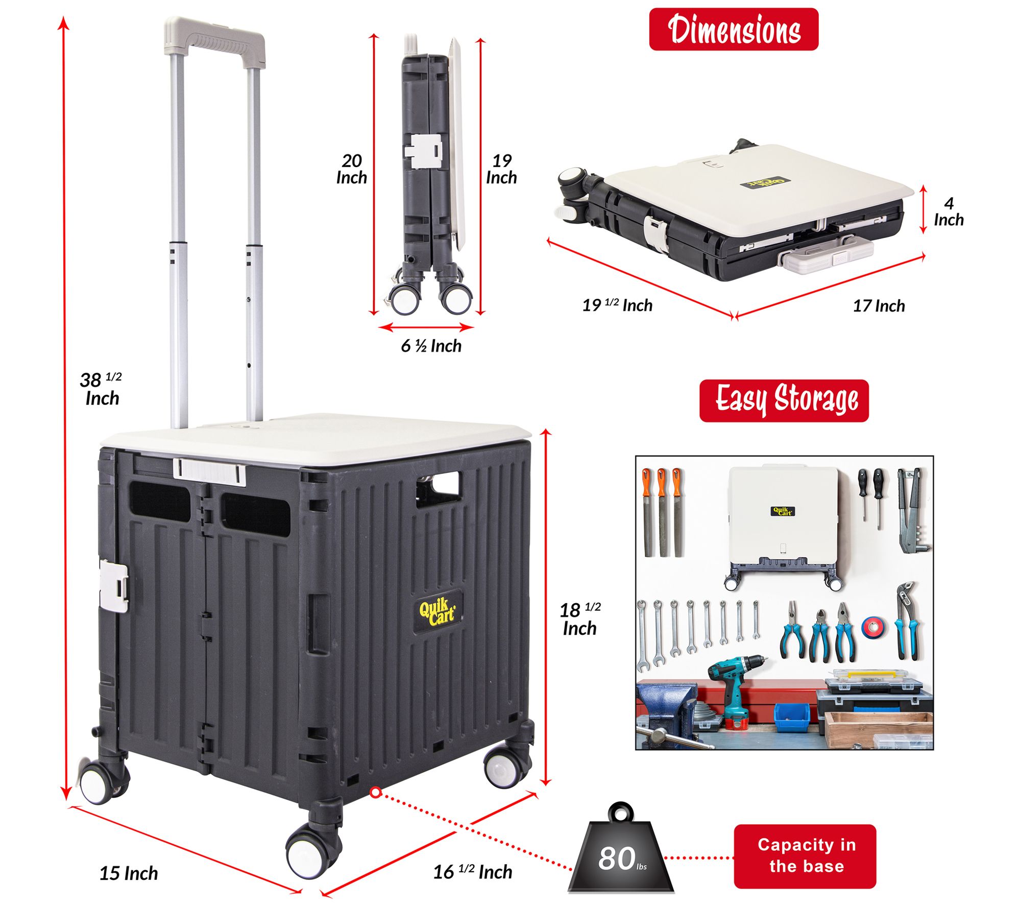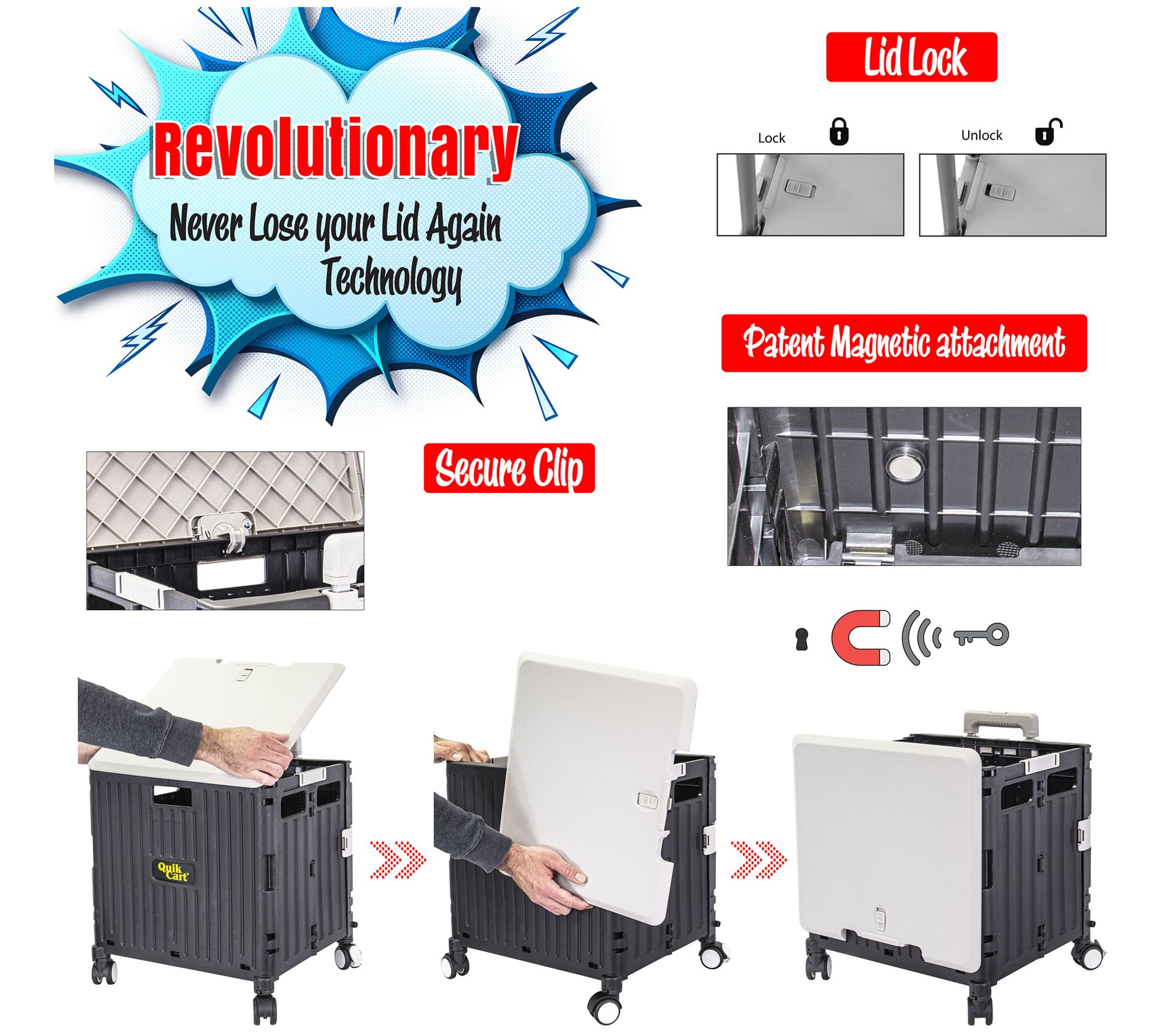 Transform your errands and projects into a breeze with the dbest products Quik Cart Swing Lid. This innovative cart features a revolutionary swing lid with a patented magnetic gyro system, ensuring your lid is always there when you need it. The lid doubles as a sturdy seat or stepstool, supporting up to 250 pounds. With its quiet, luggage-style wheels and two-position wagon handle, this cart is a versatile companion for anyone on the go, from teachers to handymen. From dbest products.