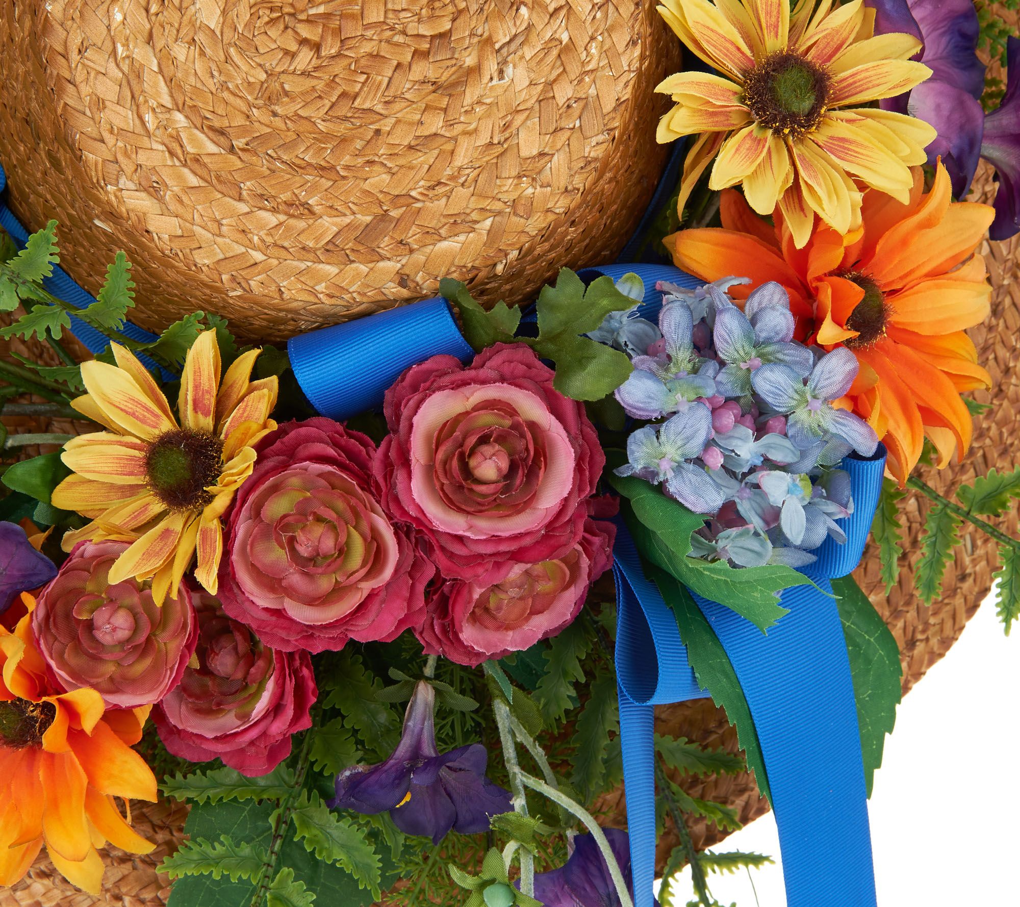 • Straw hat with lifelike cabbage rose, hydrangea, cone flower, petunia, fern, and ribbon accents