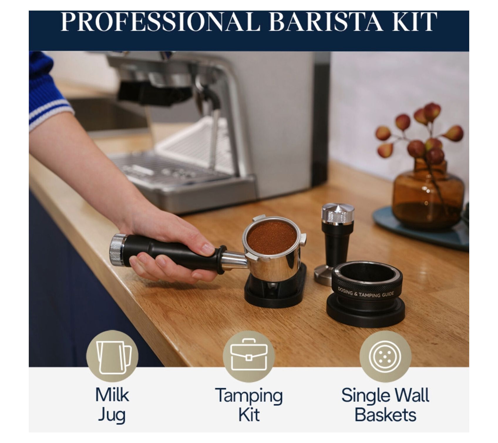 • Includes espresso machine with 56-oz reservoir, 1-cup coffee filter, 2-cup coffee filter, tamper, dosing and tamping guide, tamping mat, cleaning tools, water hardness test, descaler, and manual