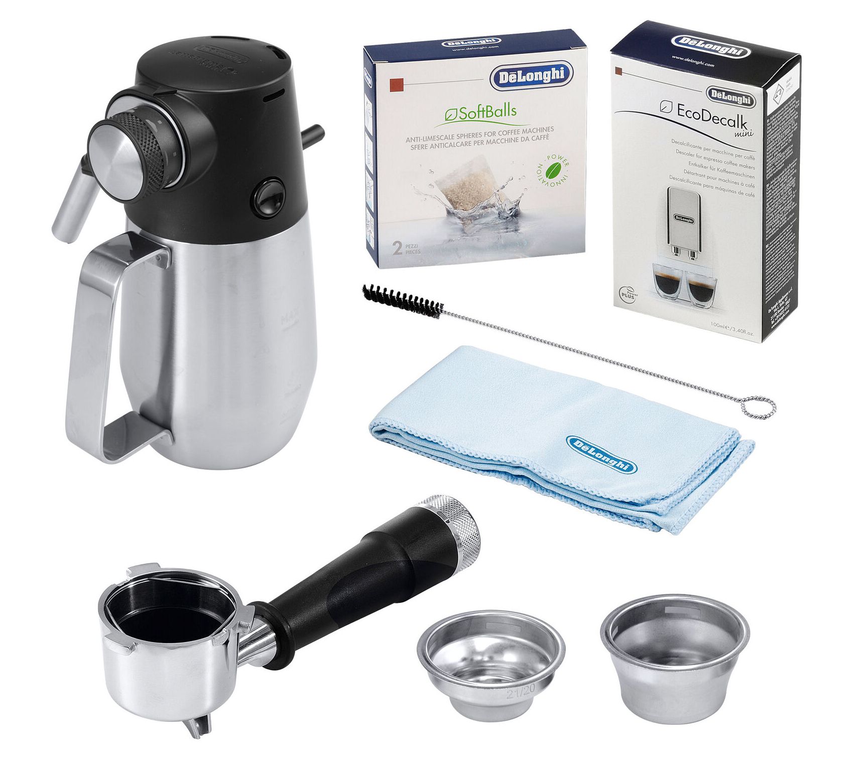 • Includes 1450W espresso machine with 67-oz reservoir, portafilter, single and double non-pressurized baskets, milk frother, milk pitcher, descaling solution, total hardness test, cleaning brush, cleaning cloth, and manual