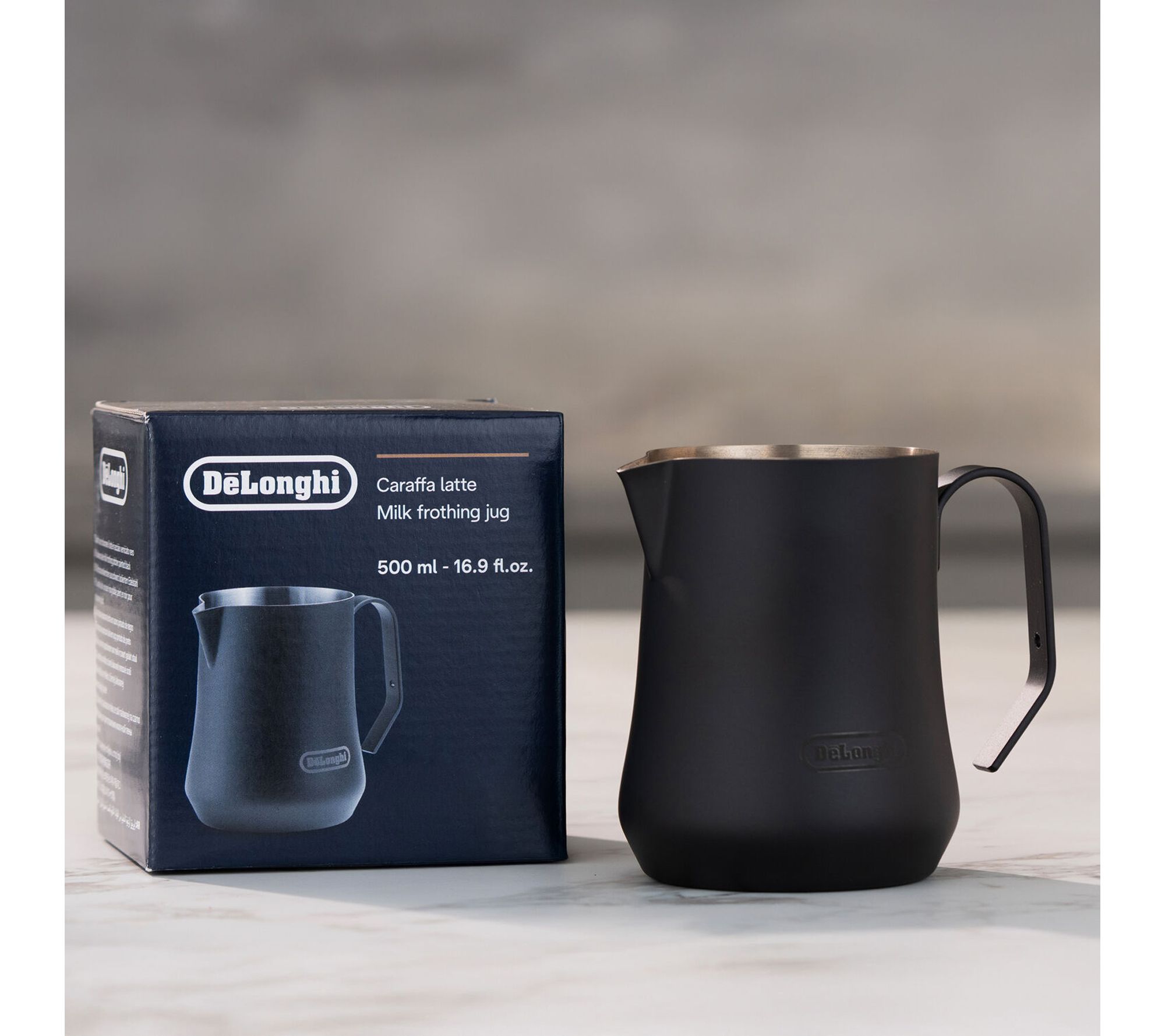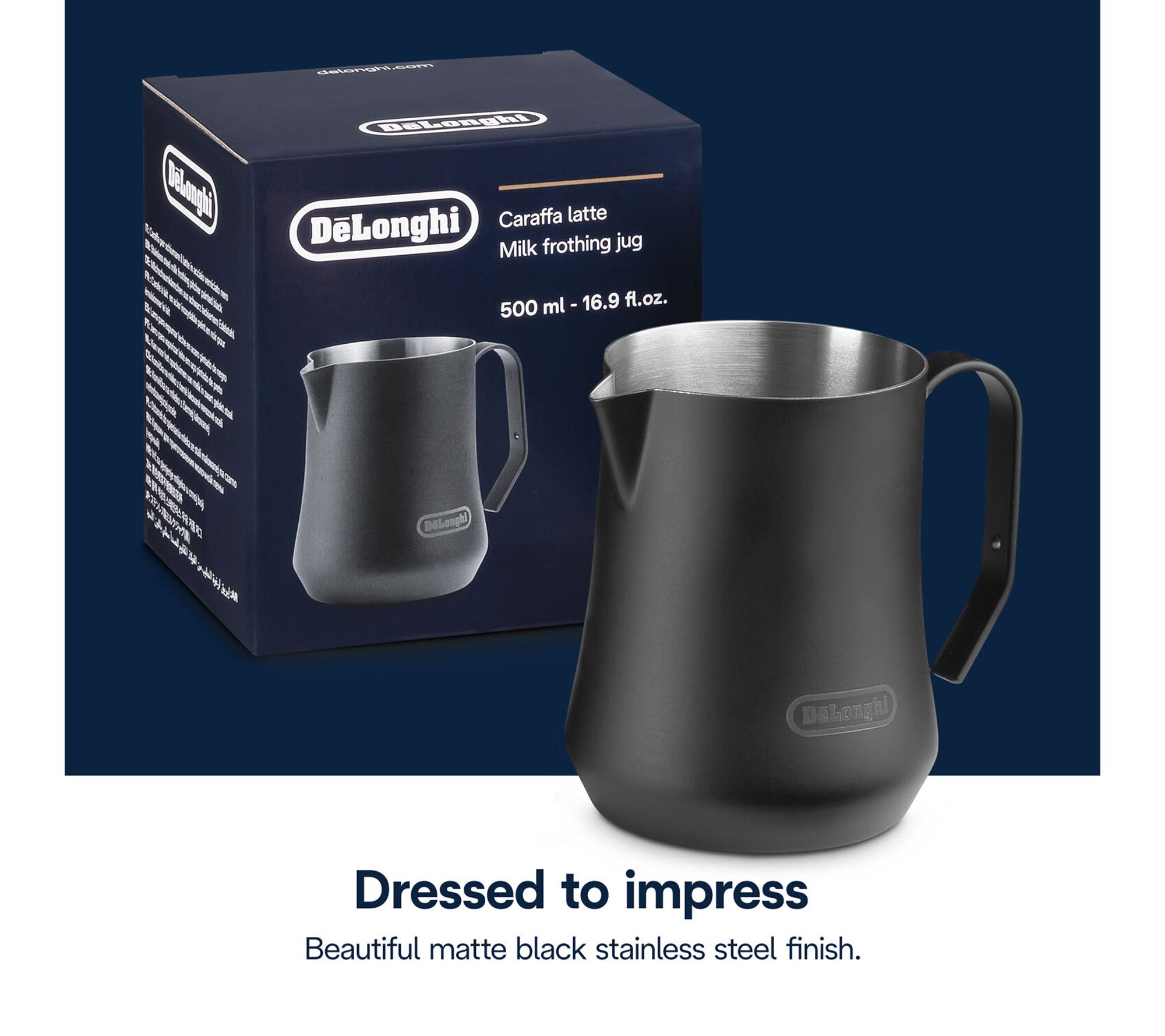 Aspiring home baristas can create velvety milk foam for lattes, cappuccinos, and more with this milk frothing jug. Its V-shaped spout lets you pour cleanly and practice latte art, while the compact matte black design adds style to your countertop. The heat-resistant handle makes every coffee moment smoother and more enjoyable. From De'Longhi.