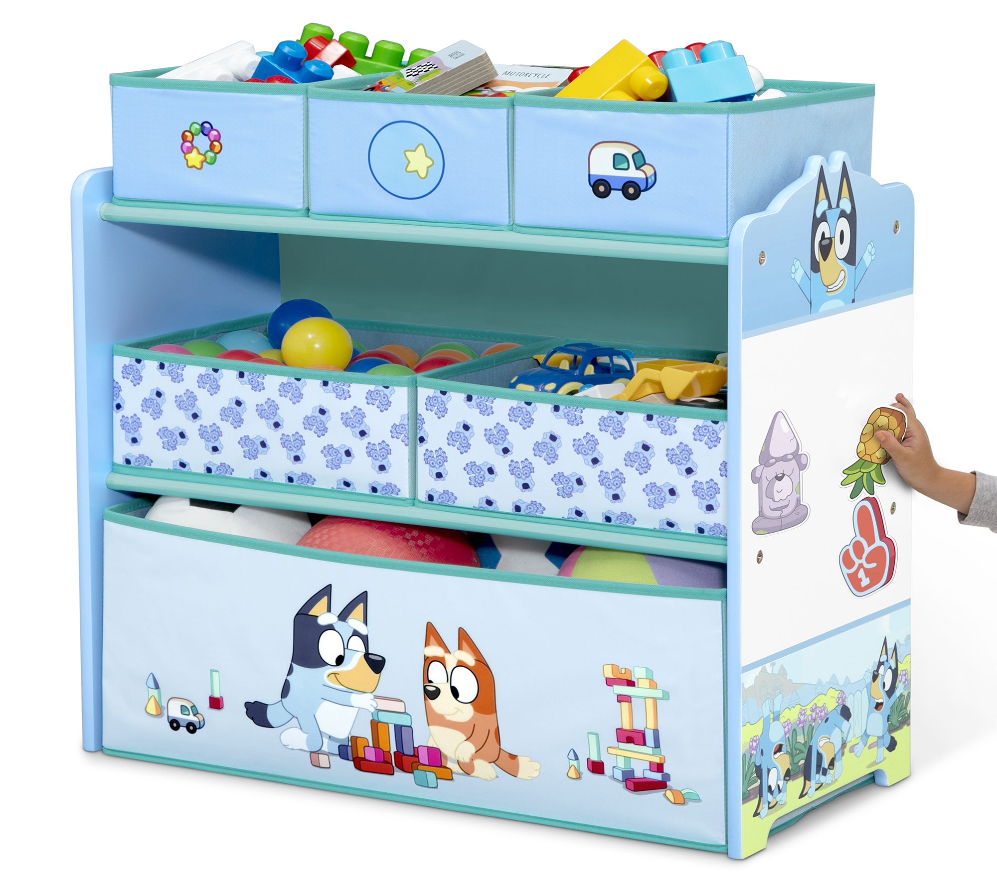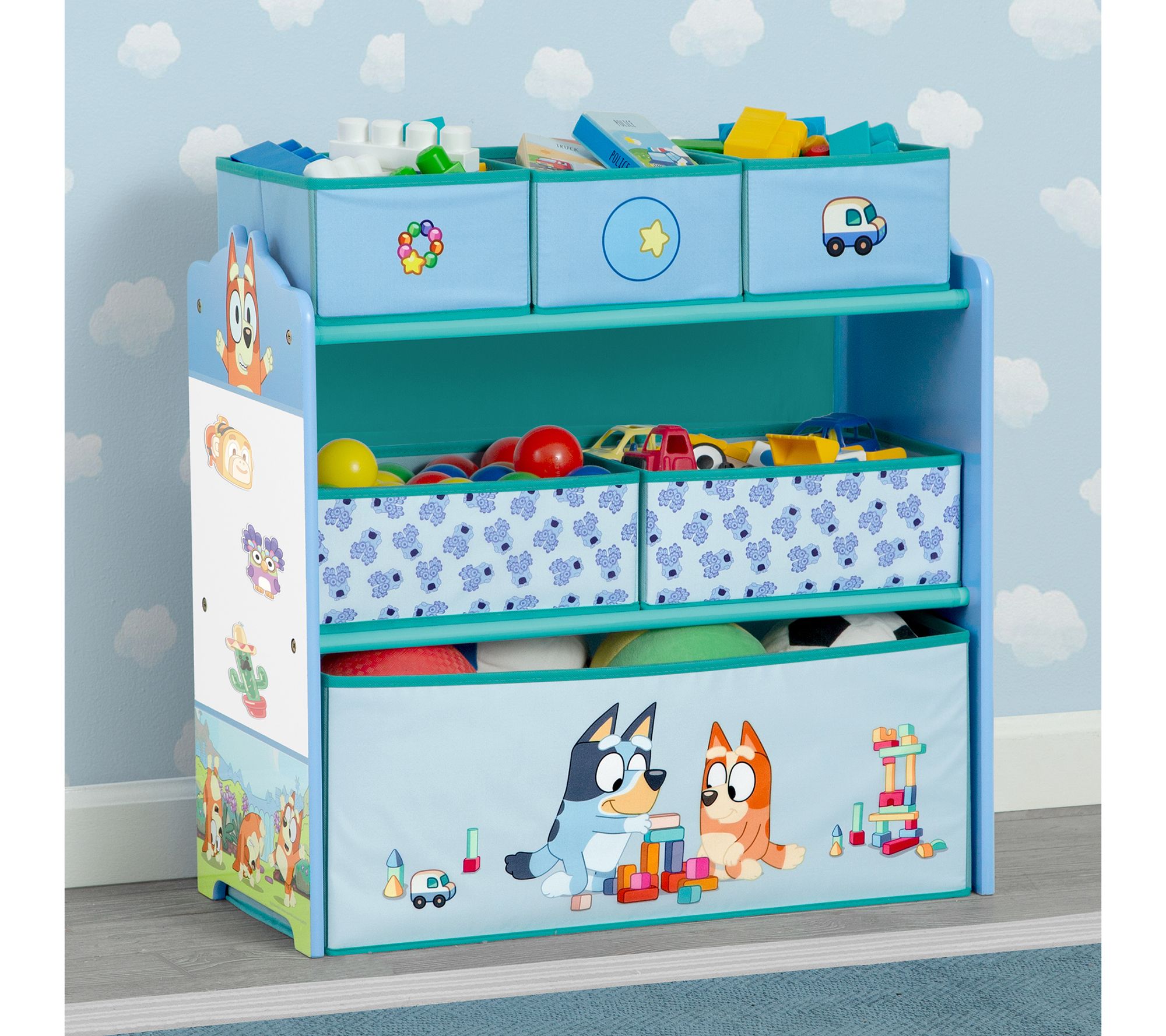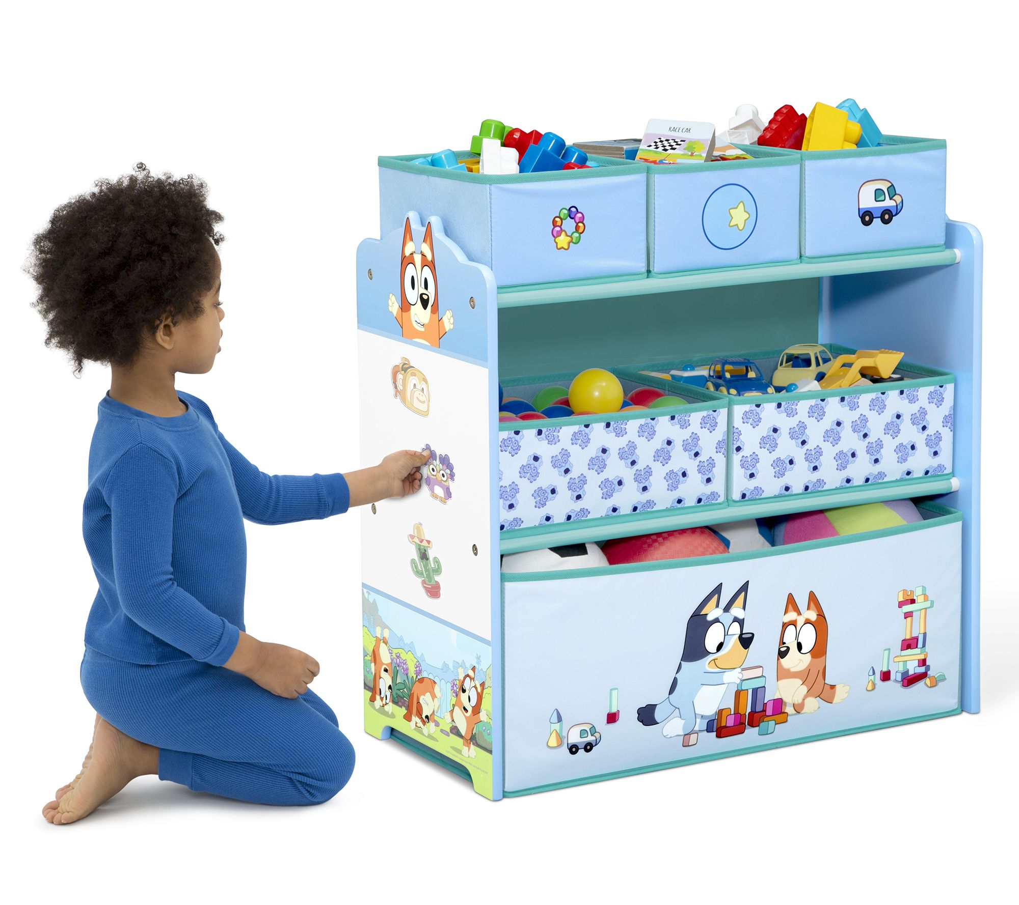 Keep your little one's space neat and tidy with the Delta Children Bluey design store bin toy storage organizer. Featuring colorful graphics of Bluey and Bingo and reusable vinyl cling stickers, this organizer adds fun while encouraging orderliness. With six bins in varying sizes, it offers ample storage for toys of all shapes and sizes. From Delta Children.